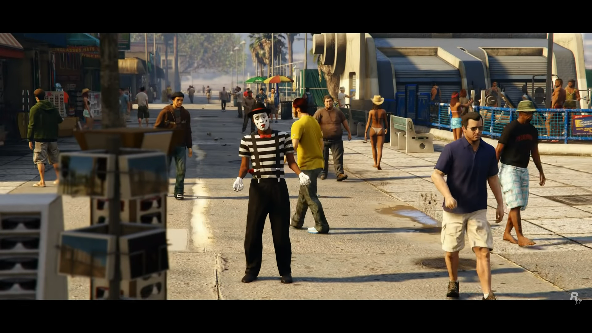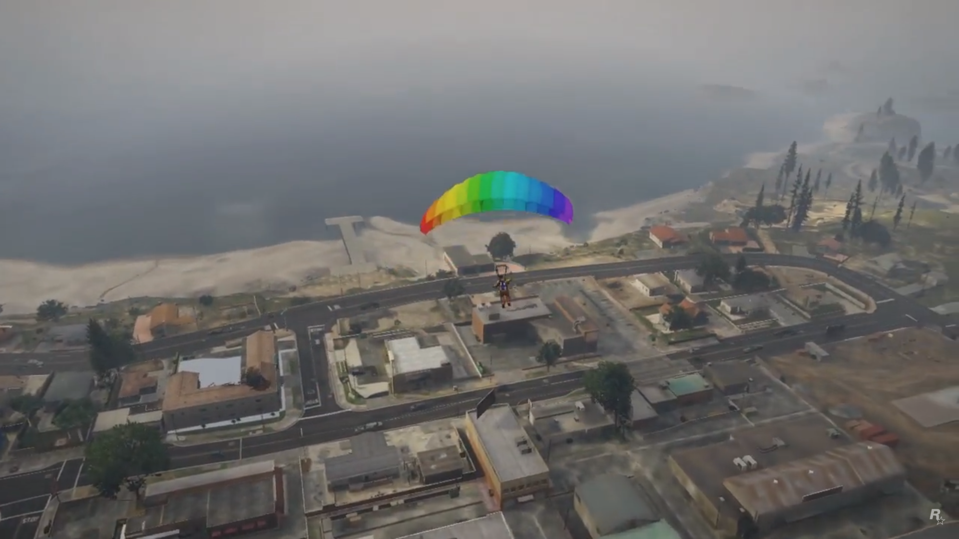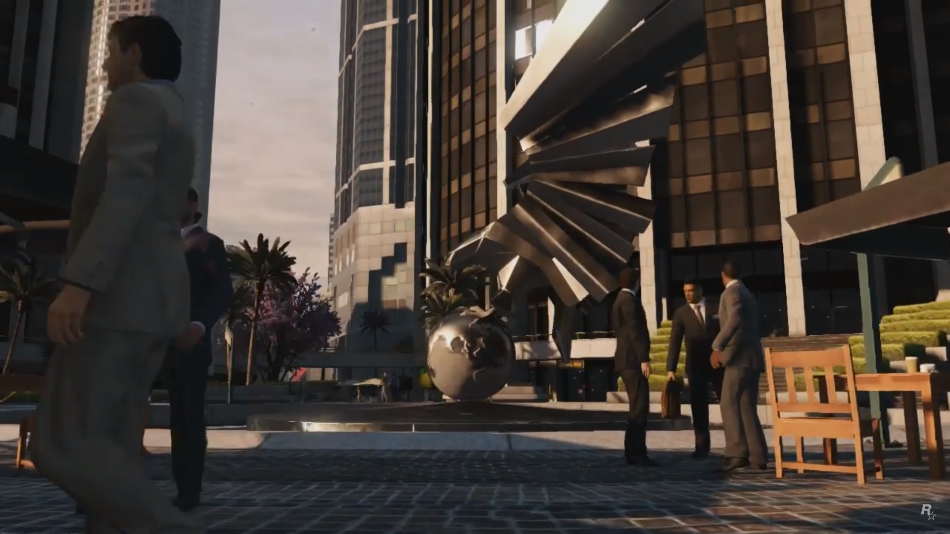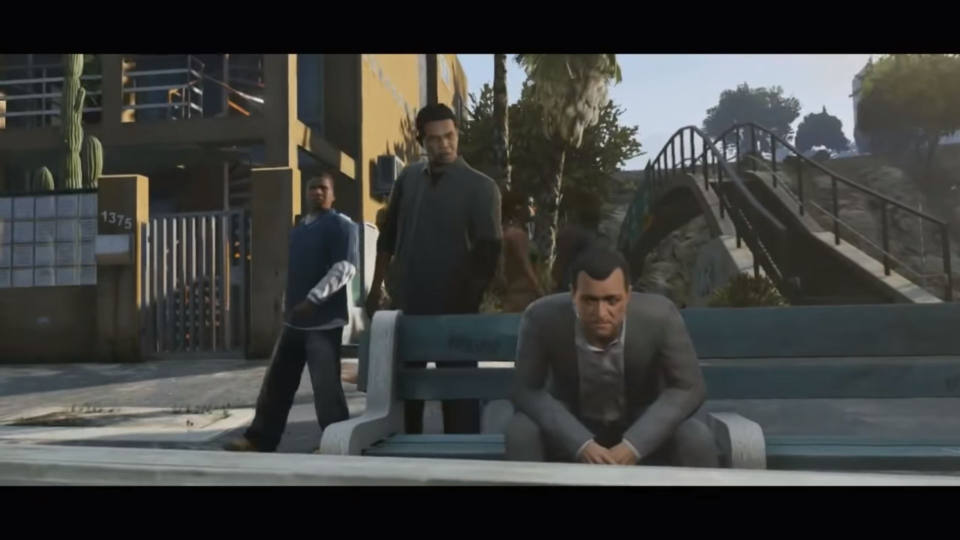 There is an easter egg at the scene right after the GoPostalBoxville van drives past the screen. There is a sidewalk with the street number 2405, which is a reference to the birthdate of Sam Houser, President of Rockstar Games.