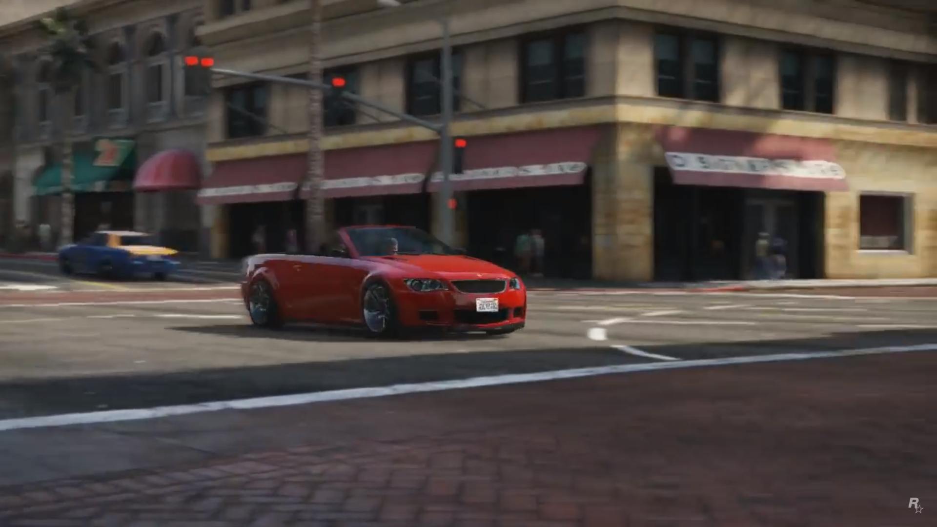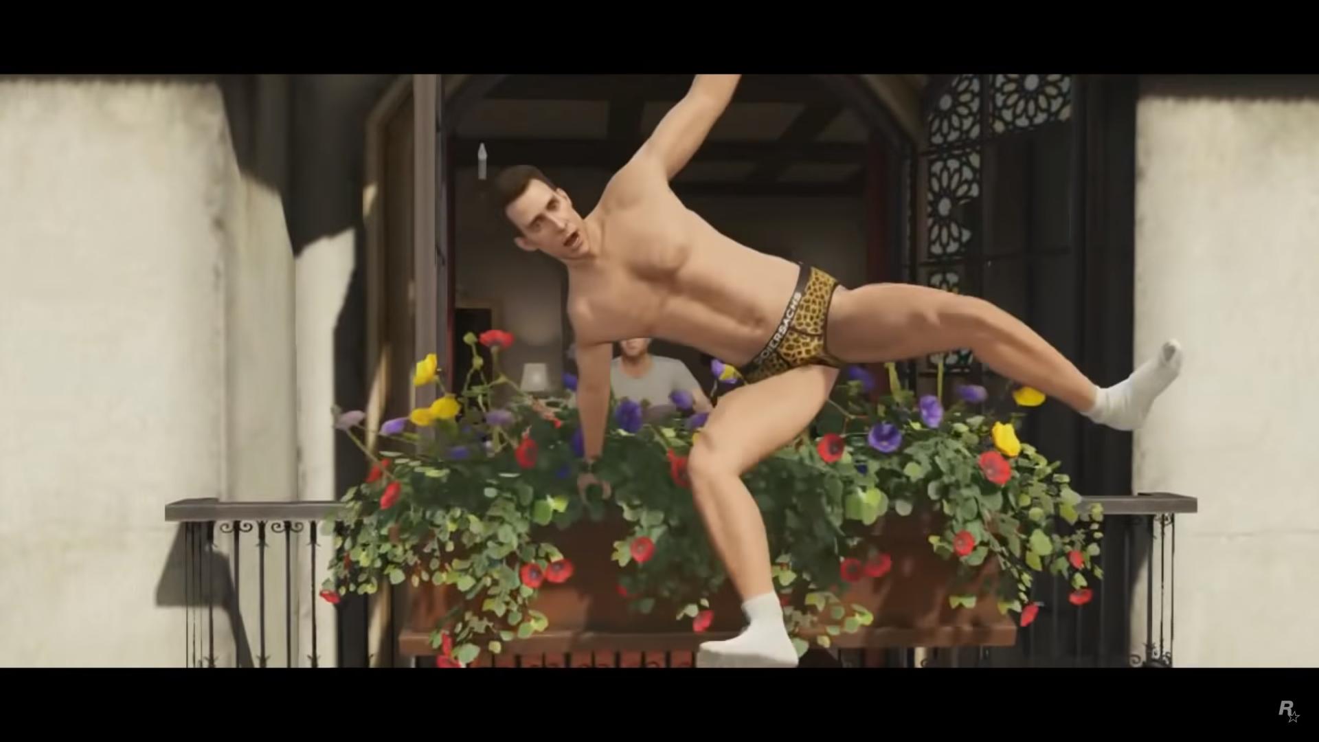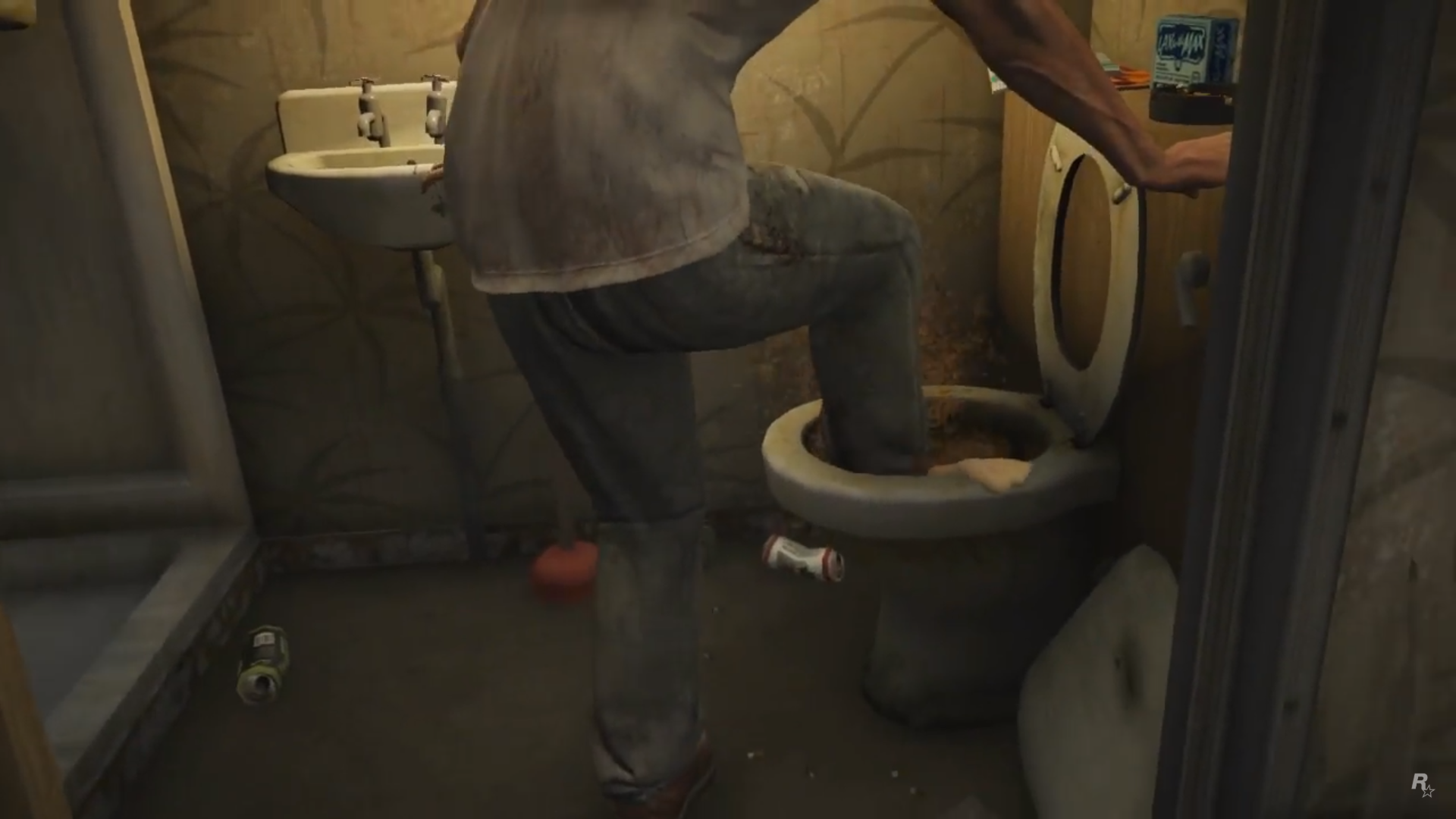 There is an easter egg at the scene right after the GoPostalBoxville van drives past the screen. There is a sidewalk with the street number 2405, which is a reference to the birthdate of Sam Houser, President of Rockstar Games.