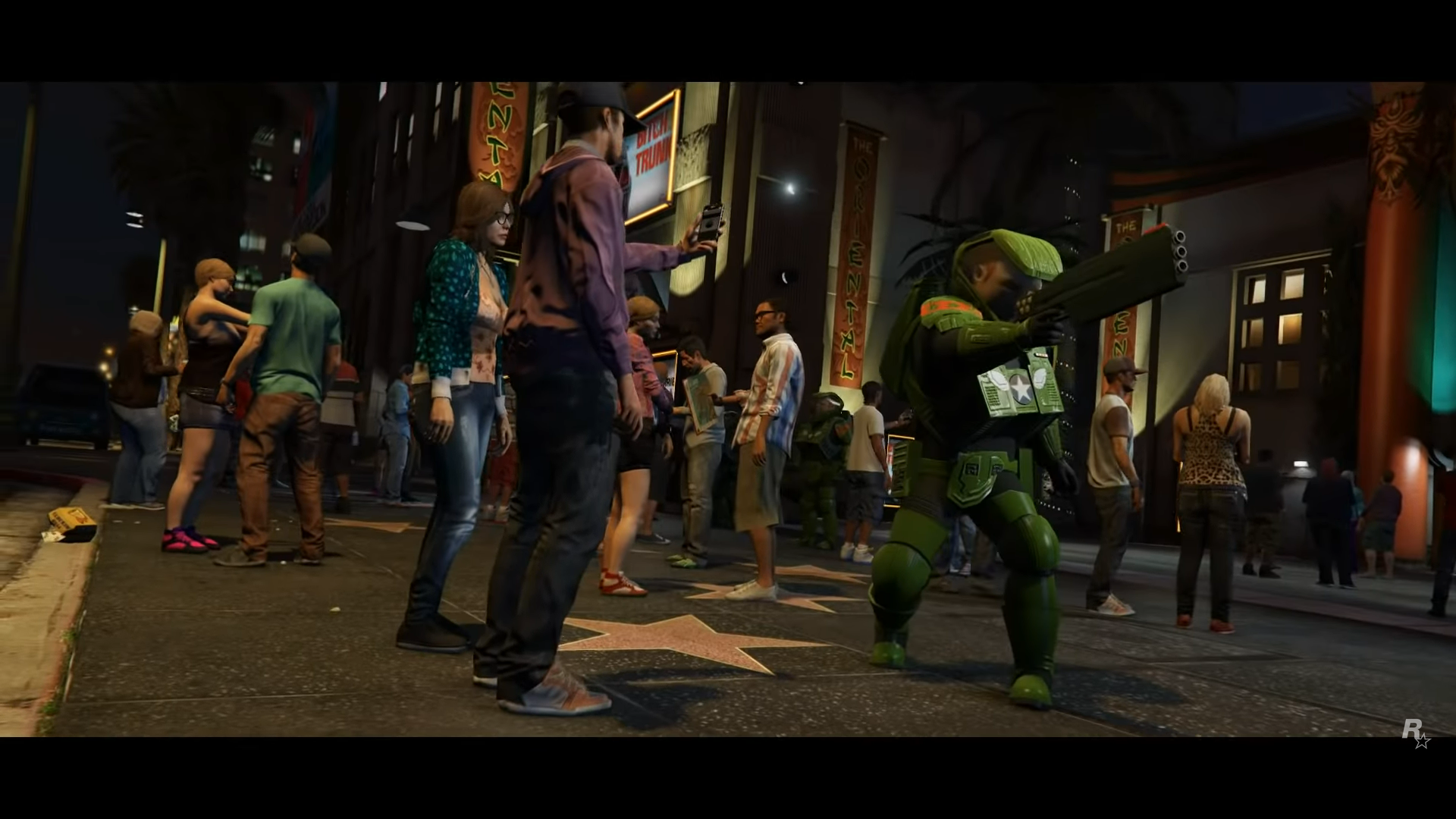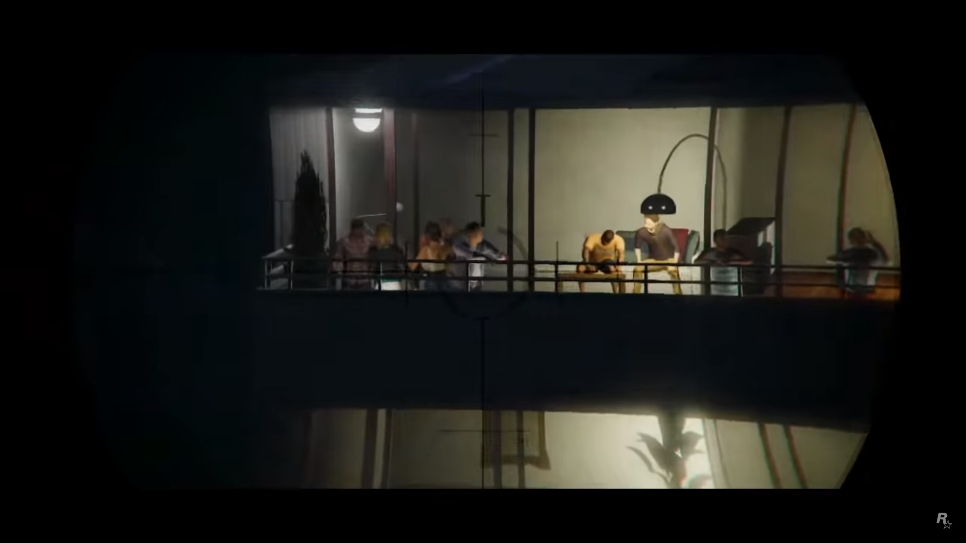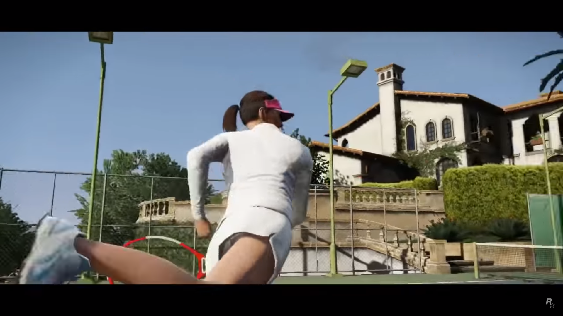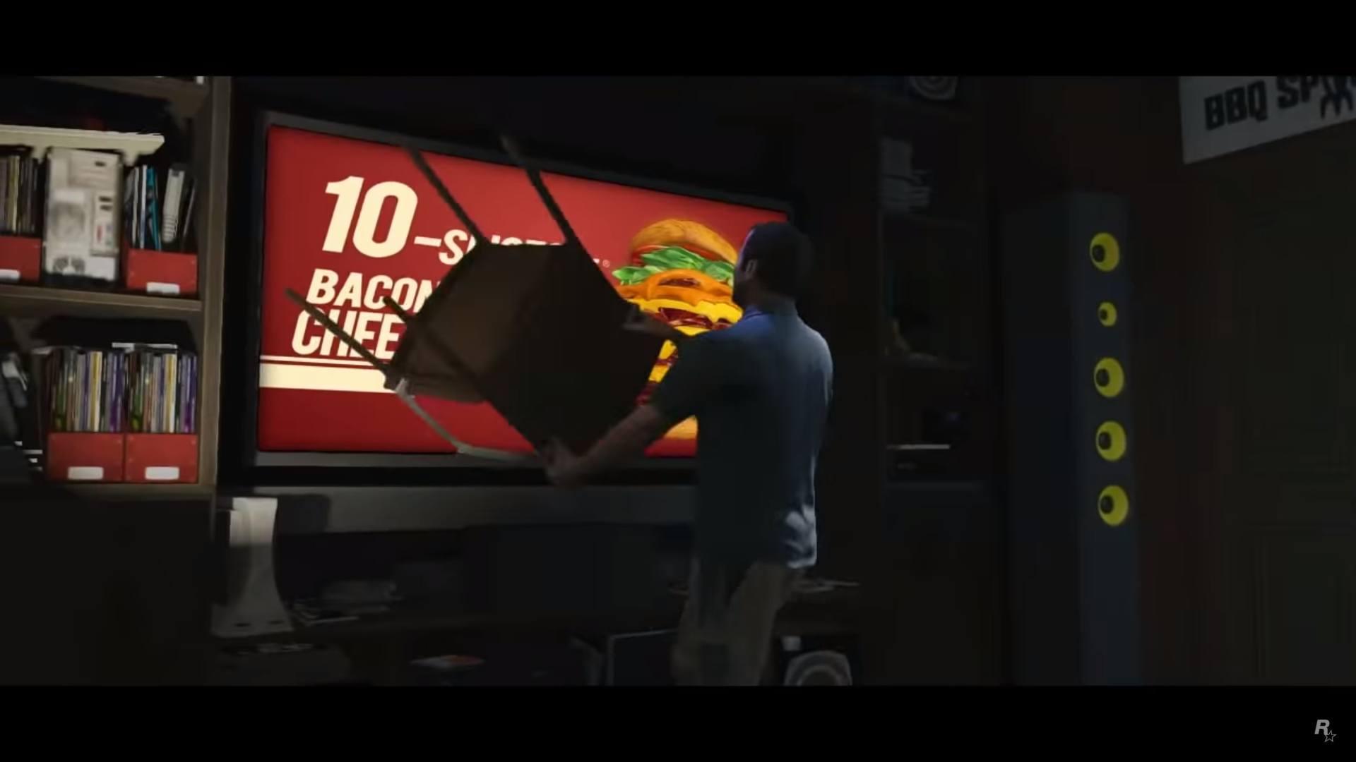 There is an easter egg at the scene right after the GoPostalBoxville van drives past the screen. There is a sidewalk with the street number 2405, which is a reference to the birthdate of Sam Houser, President of Rockstar Games.