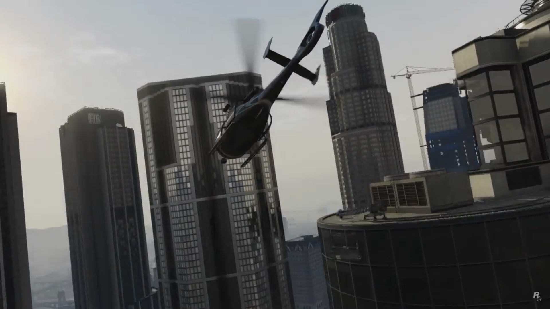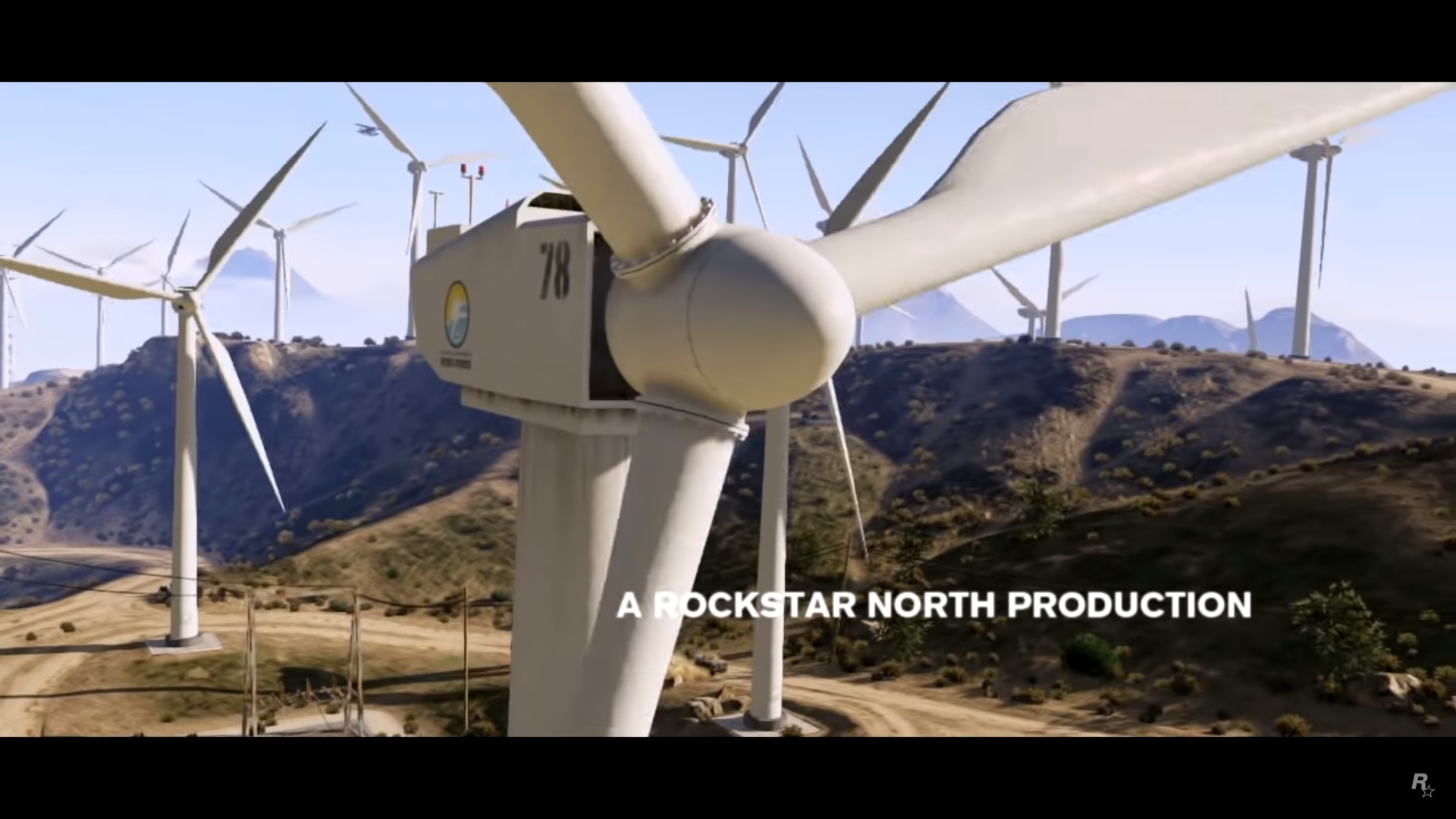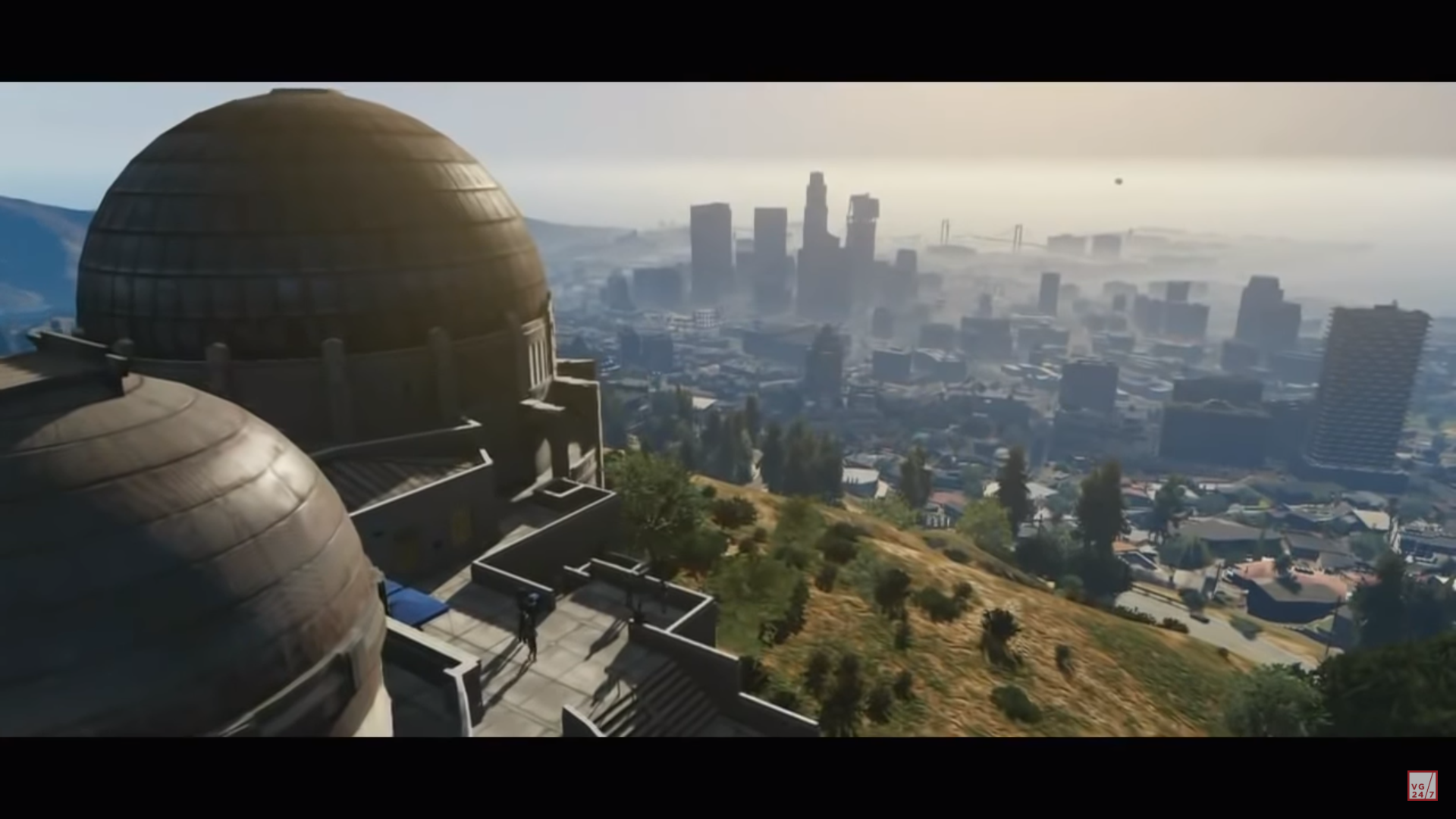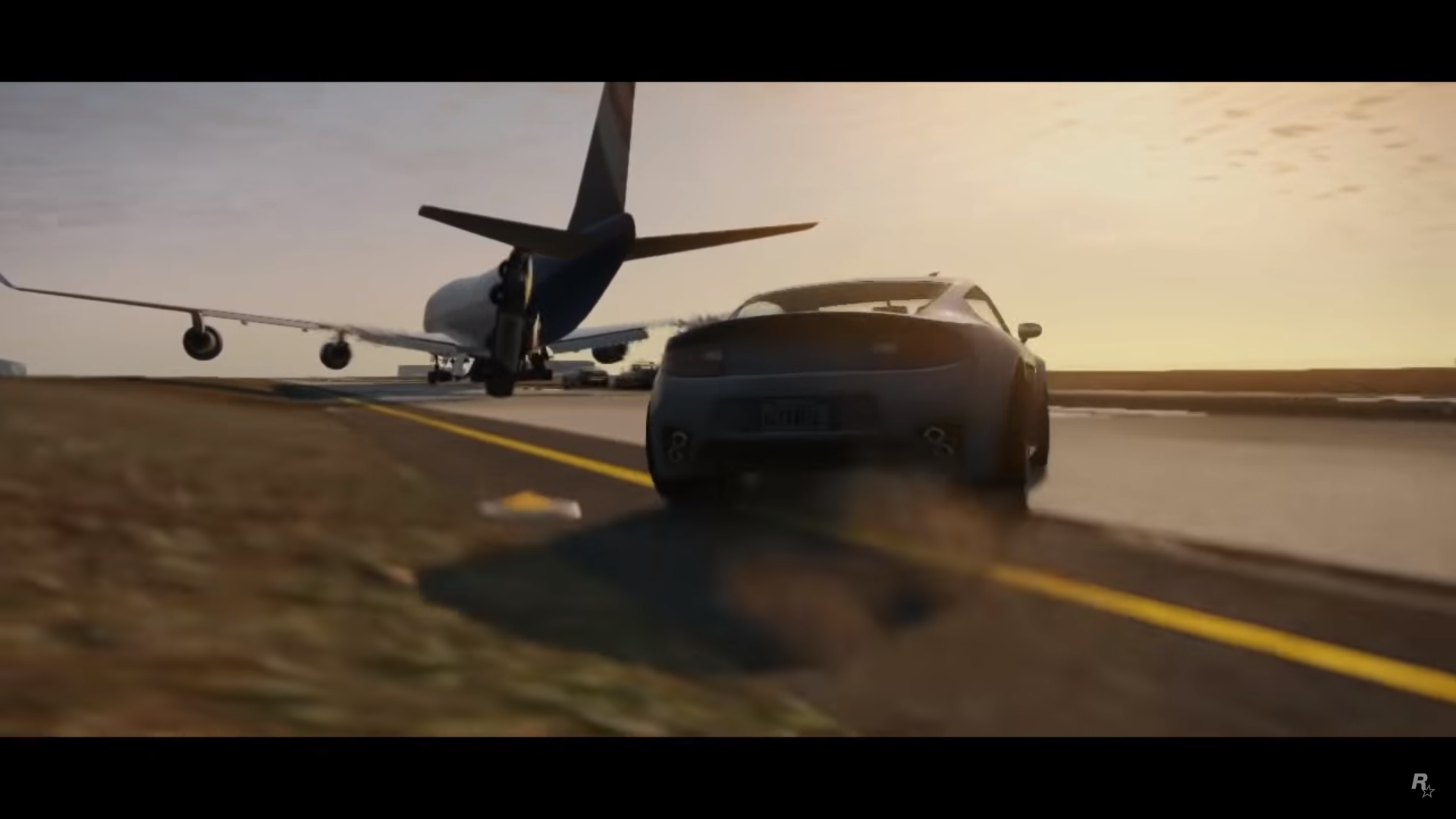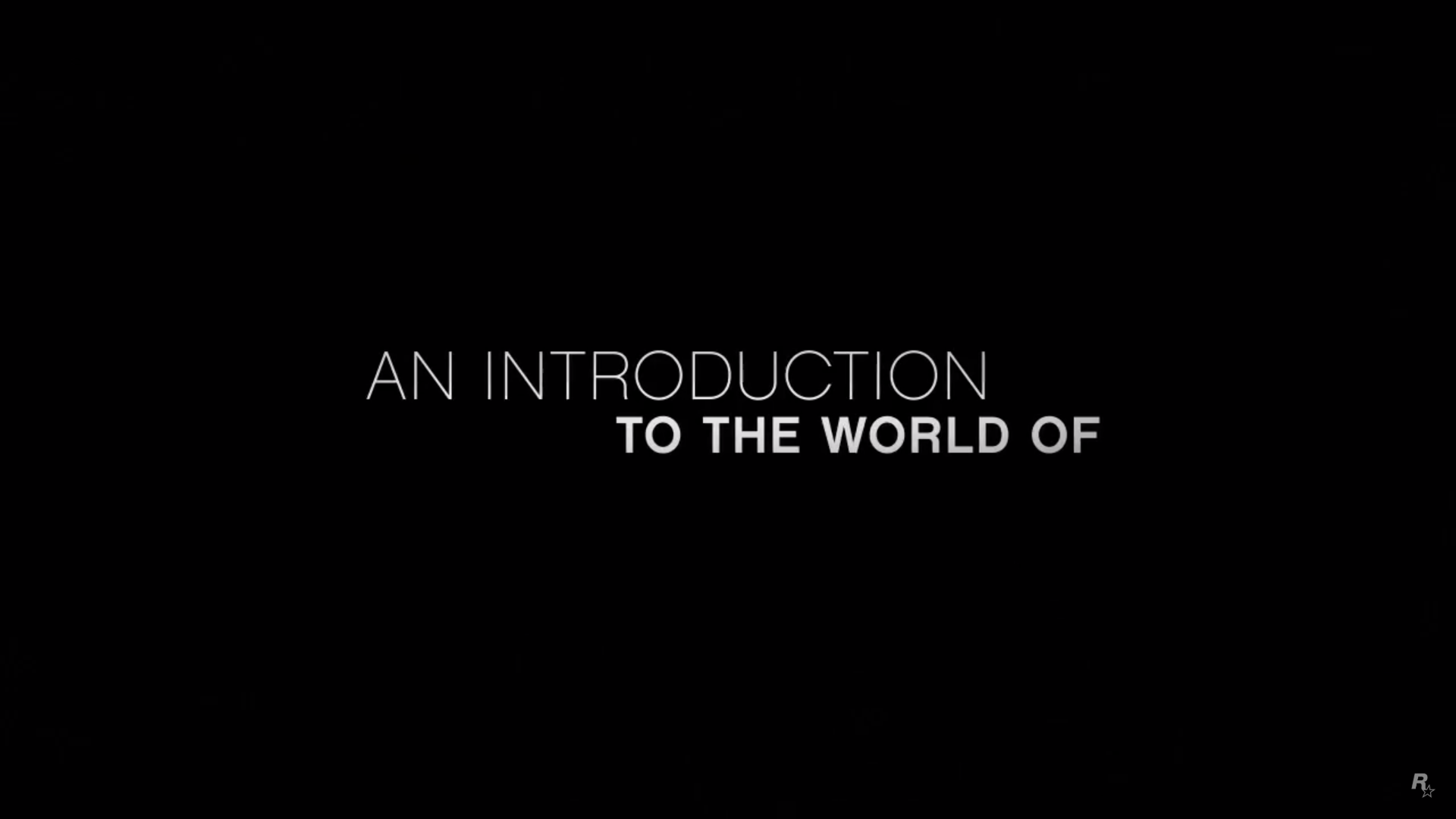 A Shamal flies above the Vinewood Sign at sunset, before heading into the city. The animated Grand Theft Auto V logo fades in followed by a black fade out.