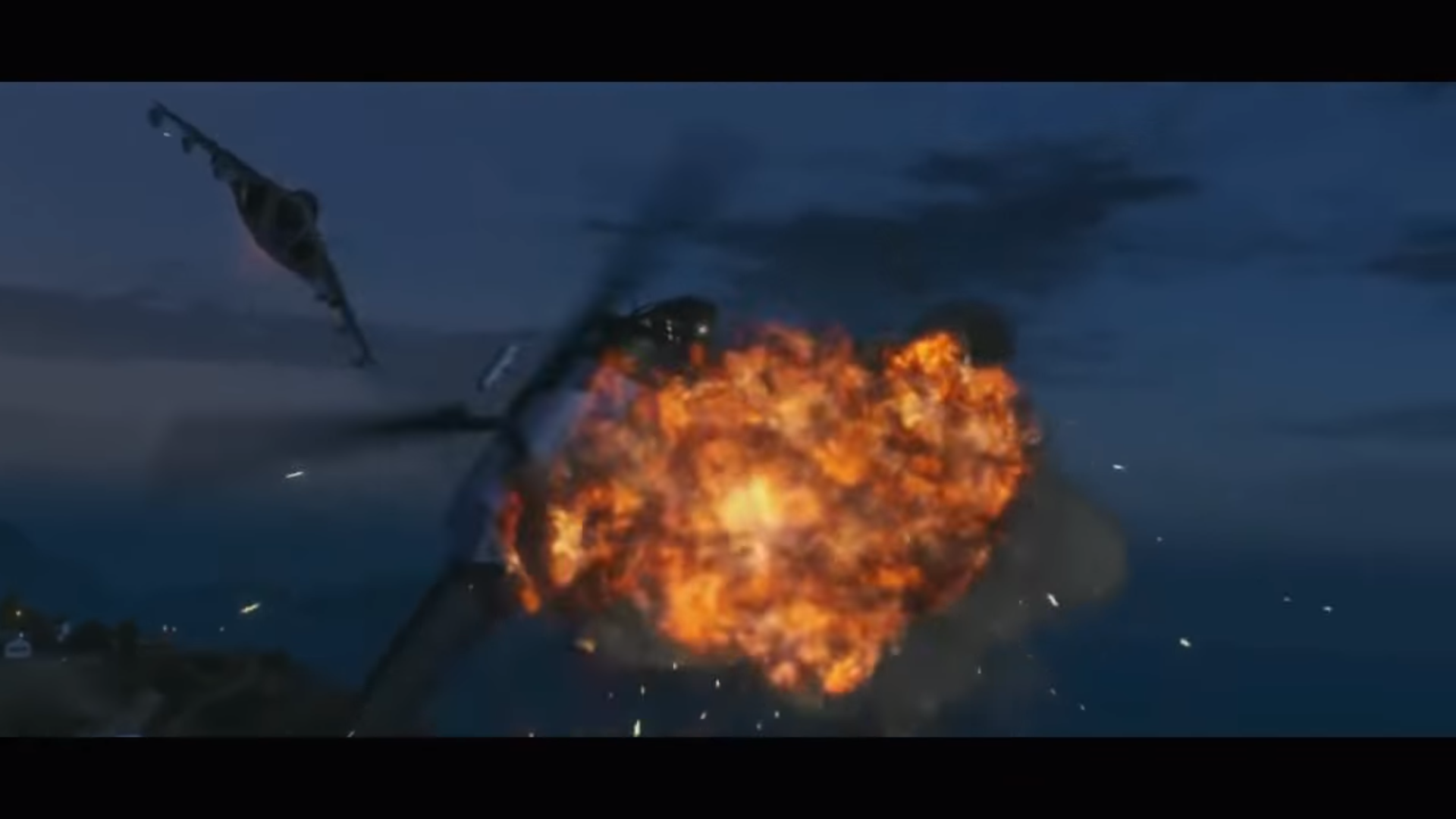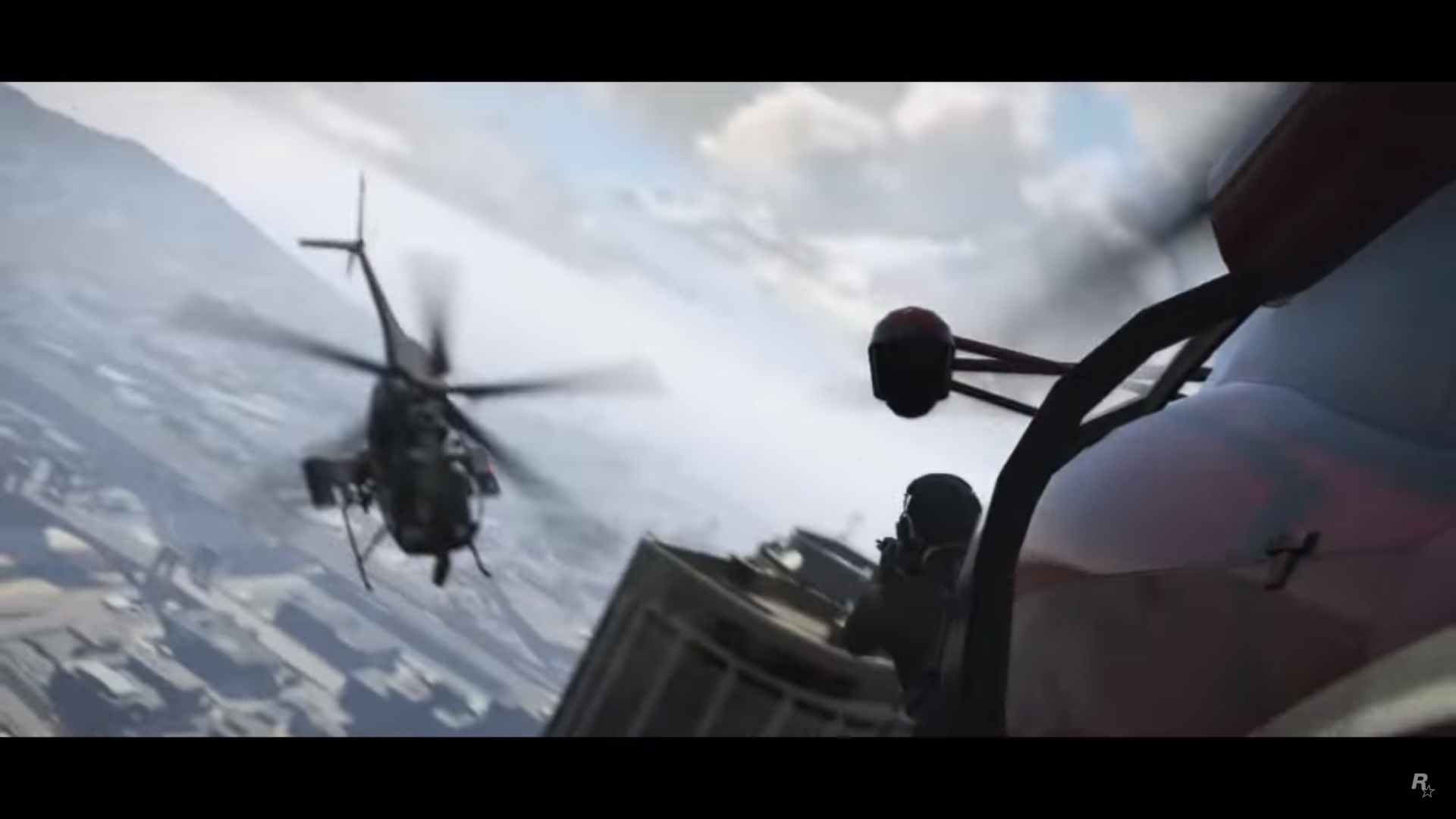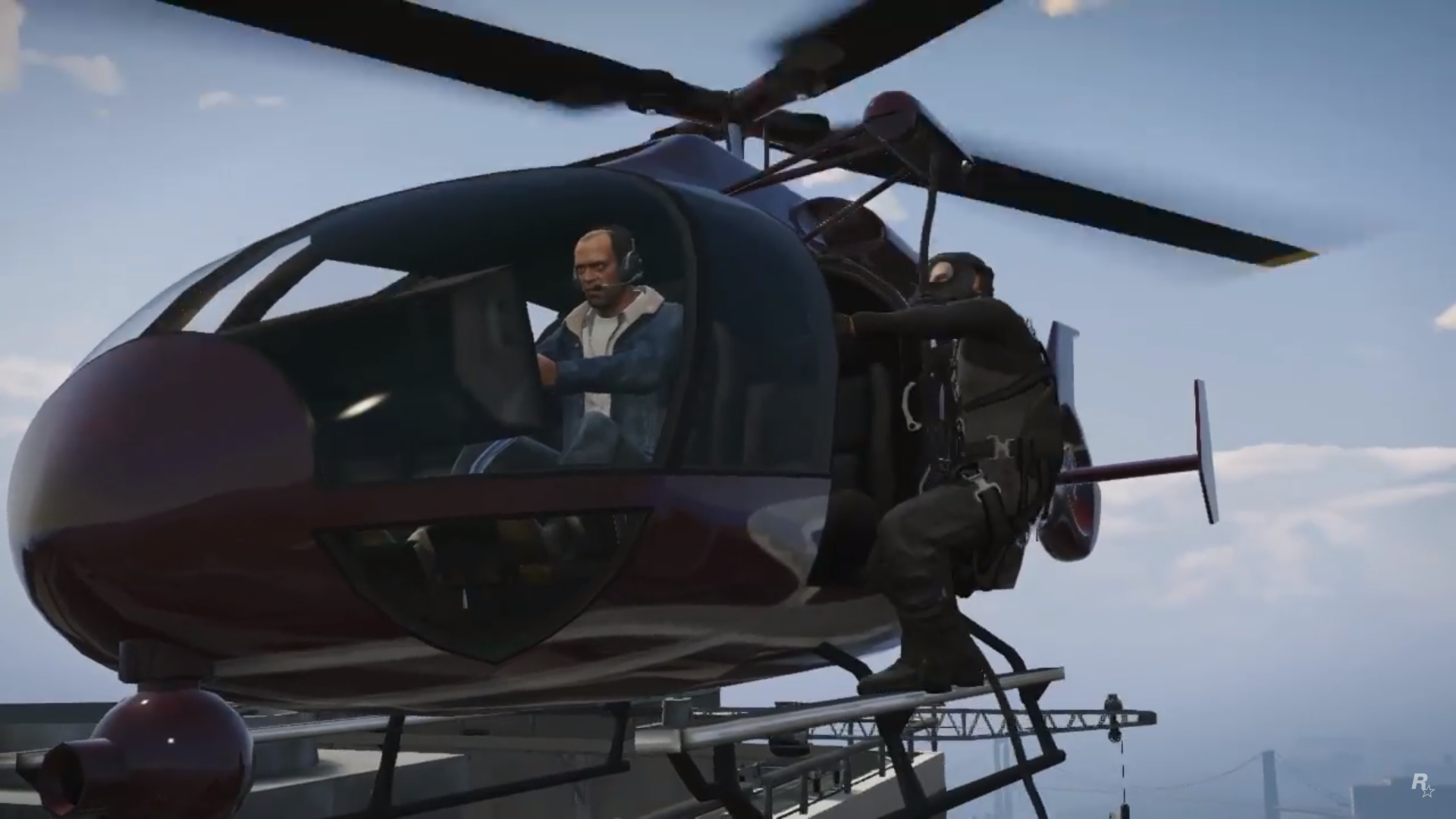 Trevor is flying a Frogger during The Big Score (Obvious approach). His shooting & stealth stats are seen being increased to 100. Lester fires a rocket at the 2 Buzzards & successfully takes them down.