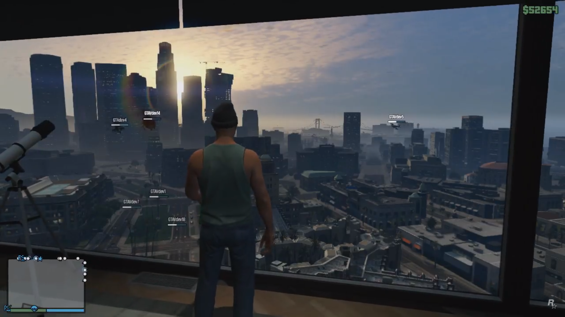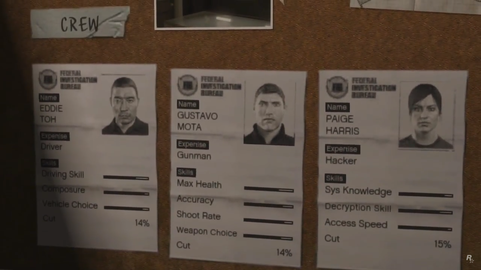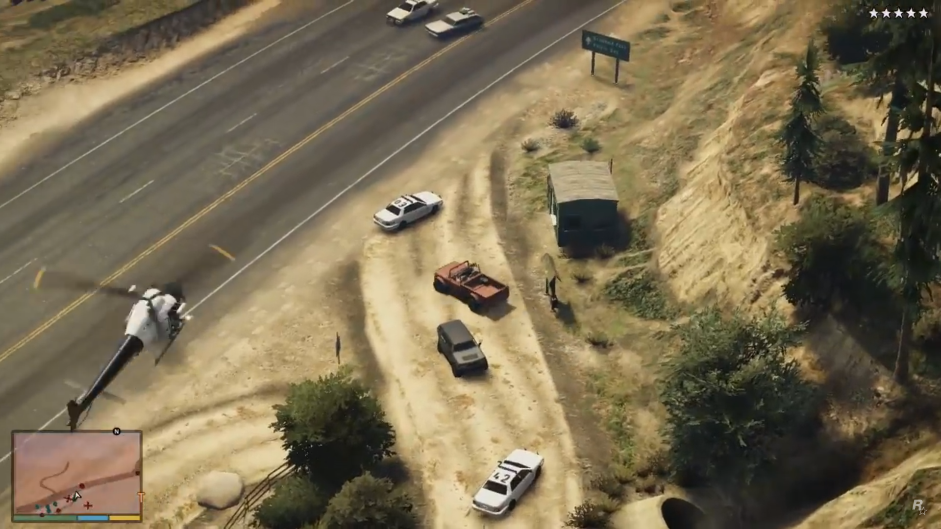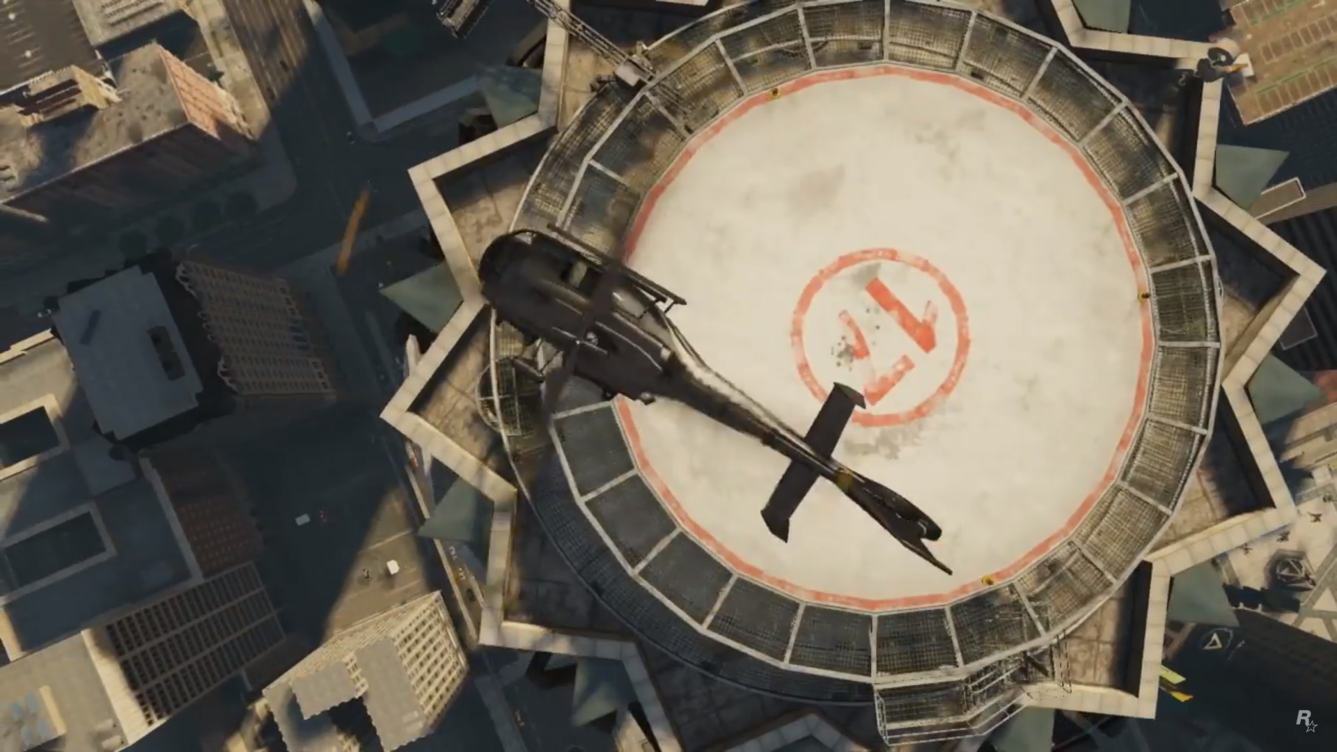 Trevor is flying a Frogger during The Big Score (Obvious approach). His shooting & stealth stats are seen being increased to 100. Lester fires a rocket at the 2 Buzzards & successfully takes them down.