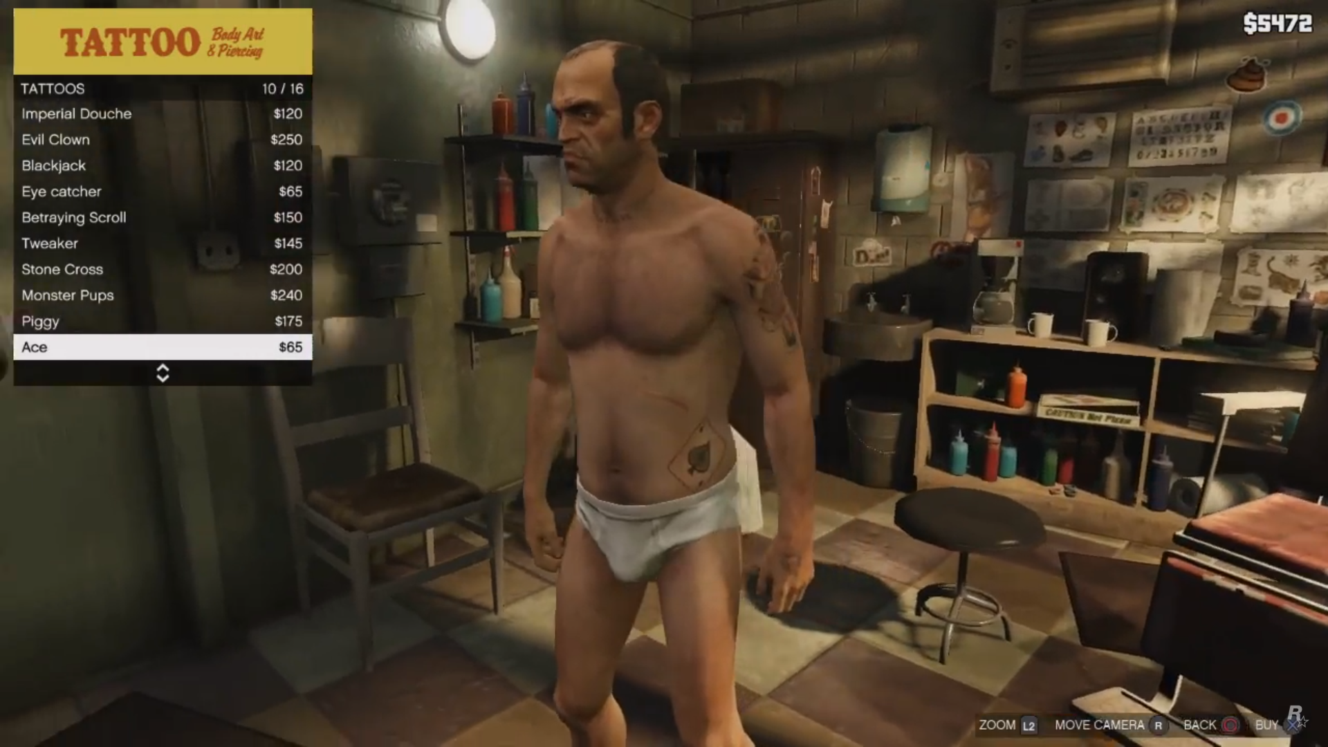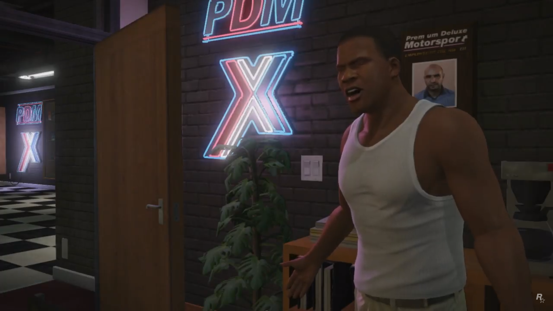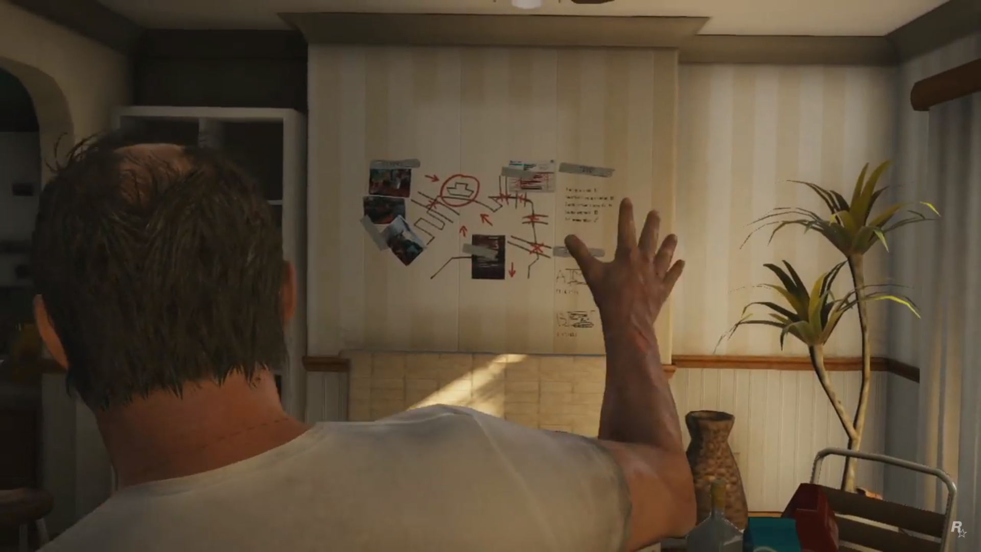 Trevor stands up, looking at the heist plan on the wall.