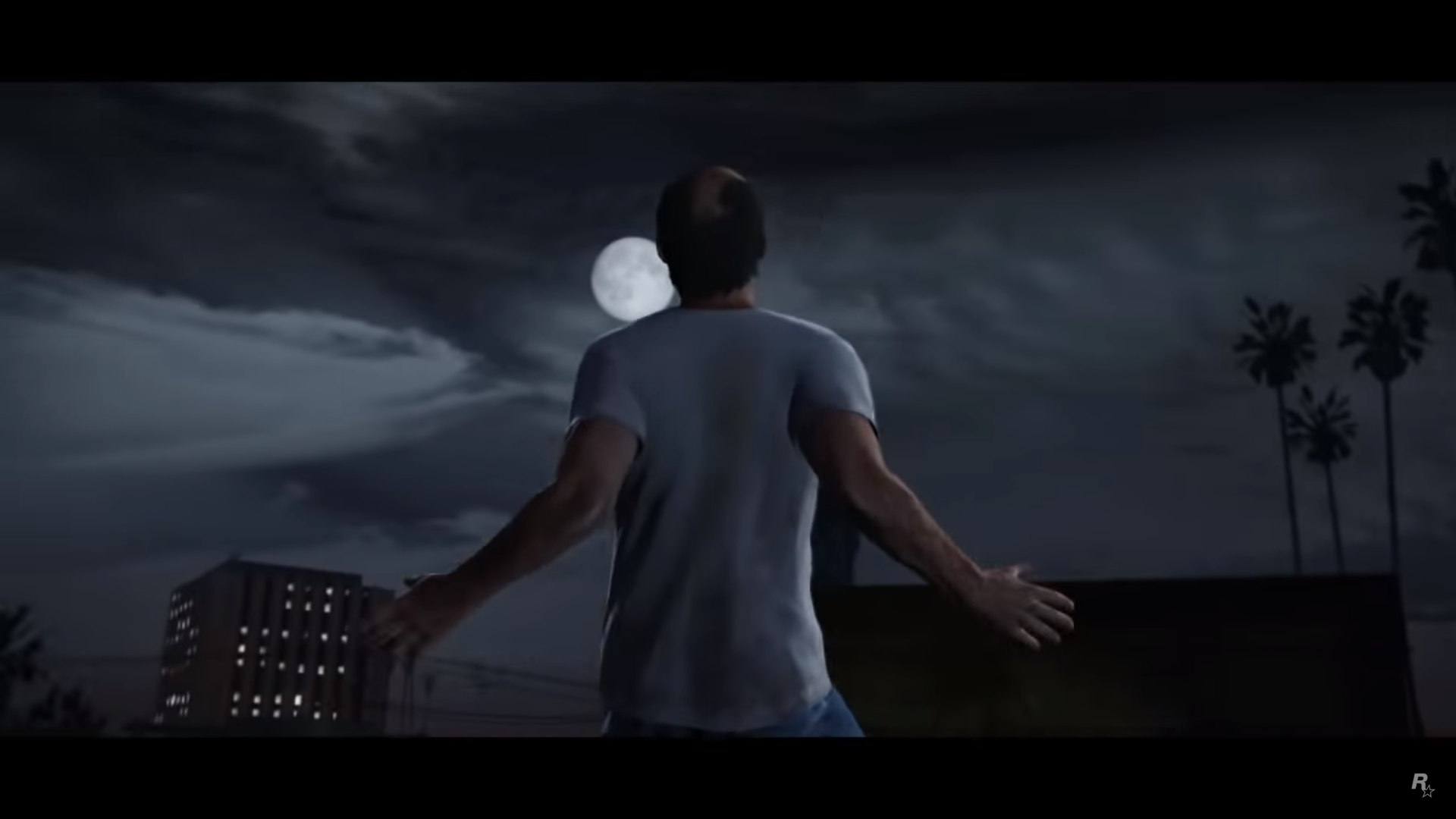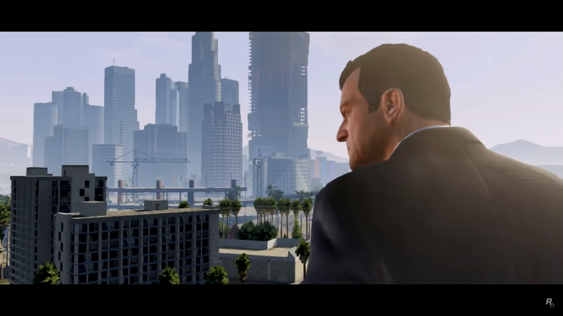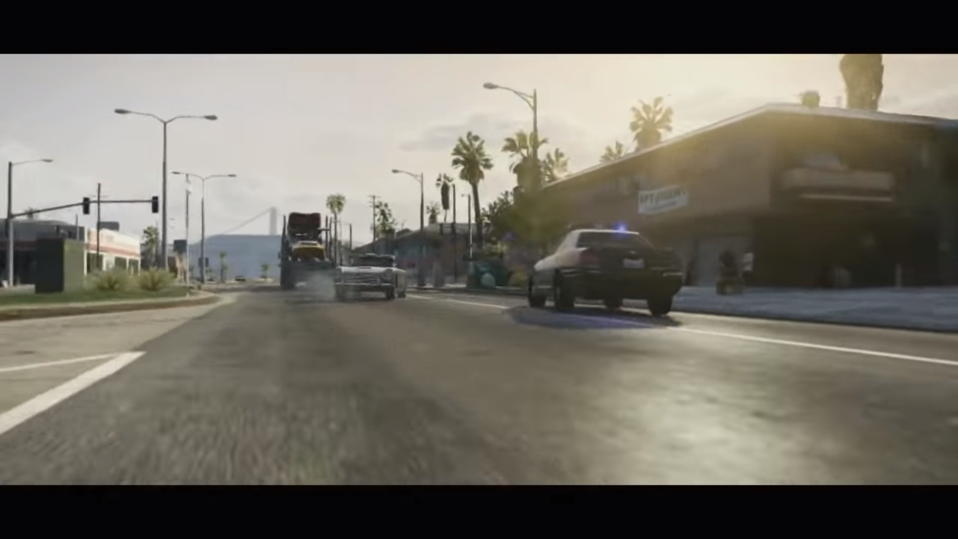 Camera rises from palm trees to view an early morning sunrise from Vespucci Beach, looking north towards Los Santos. ROCKSTAR GAMES PRESENTS
