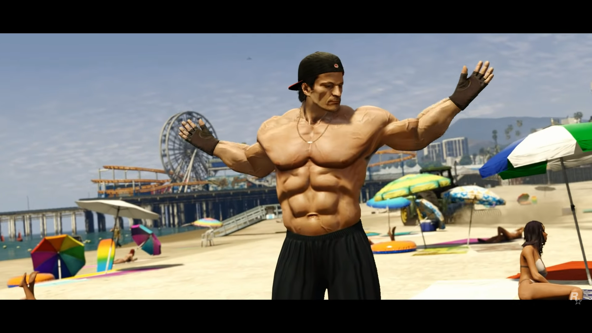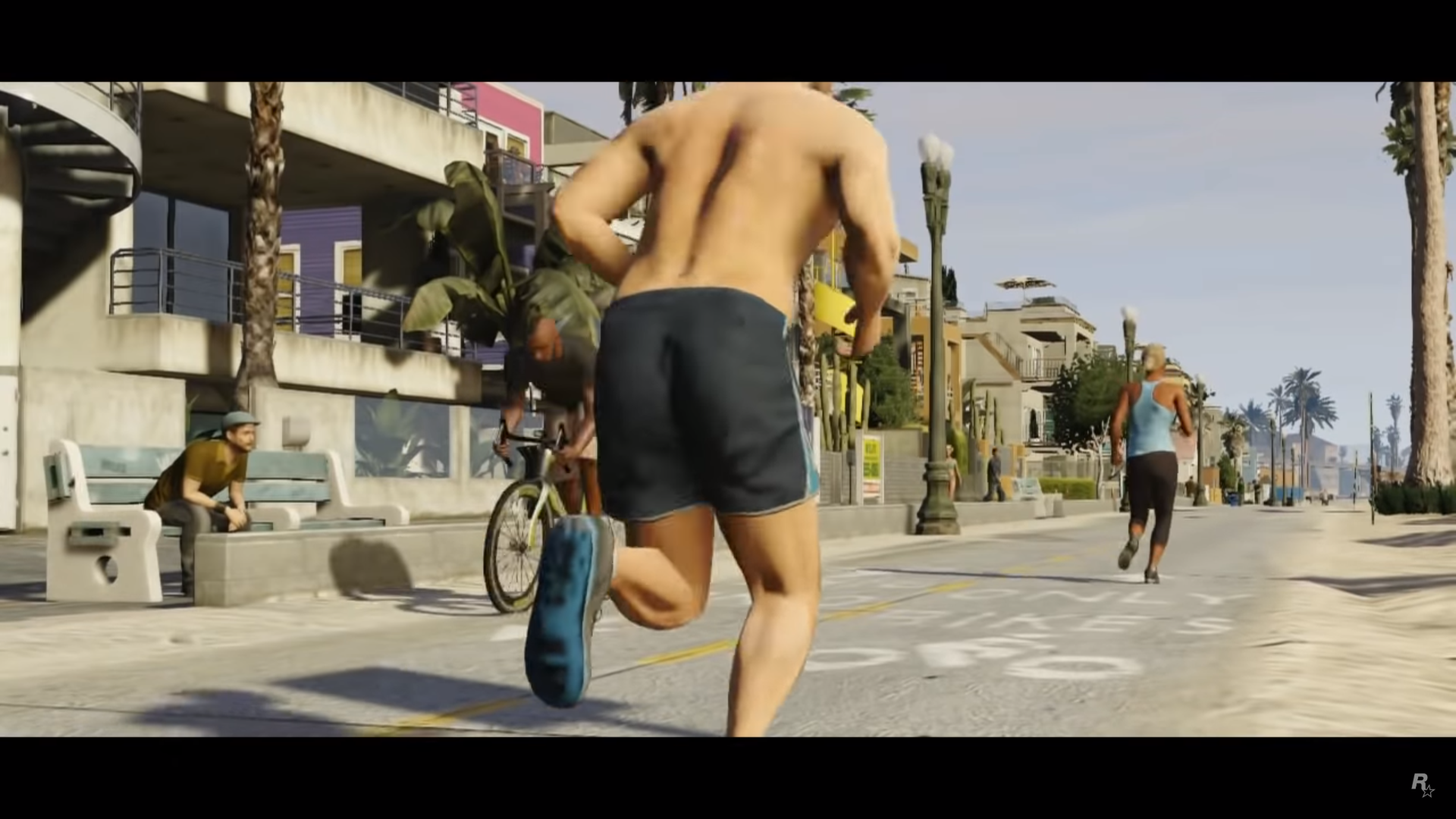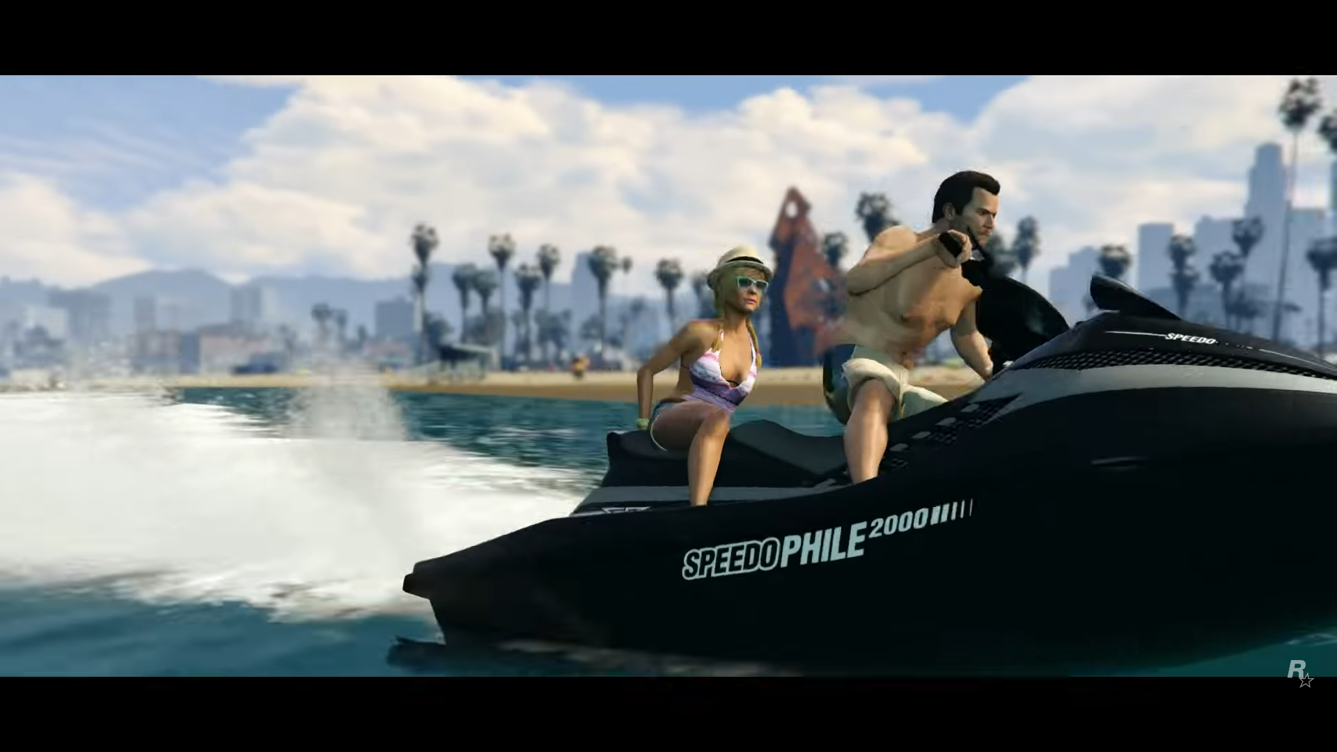 Camera rises from palm trees to view an early morning sunrise from Vespucci Beach, looking north towards Los Santos. ROCKSTAR GAMES PRESENTS