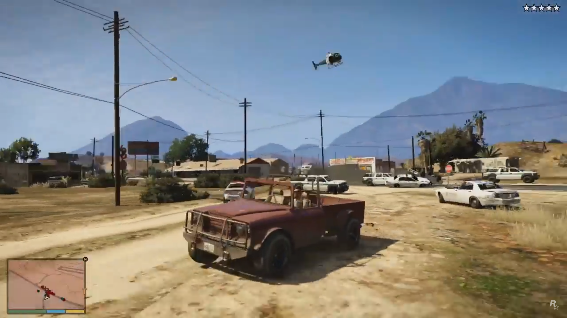 Trevor, armed with a Minigun and wearing ballistic armor, running down the street towards an explosion of police vehicles. A hovering Police Maverick passes over.