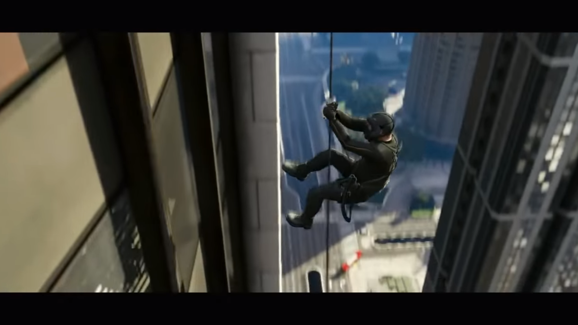 The team abseiling down the elevator shaft of the FIB Headquarters, towards a fiery bottom floor.