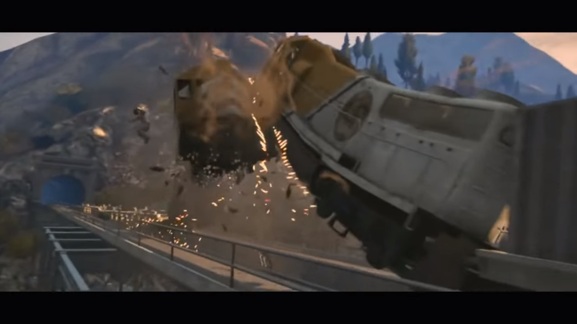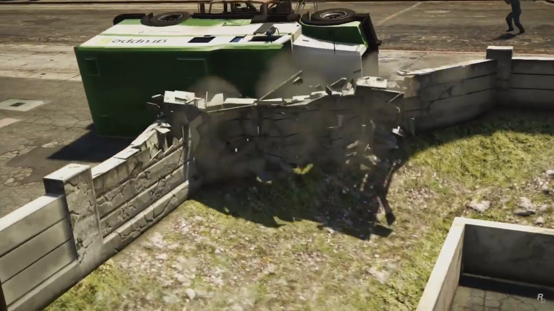 A Towtruck crashing into the side of a Stockade, pushing it onto its side and into a wall, before Michael plants explosives on the rear door and forcing out the rear occupants.