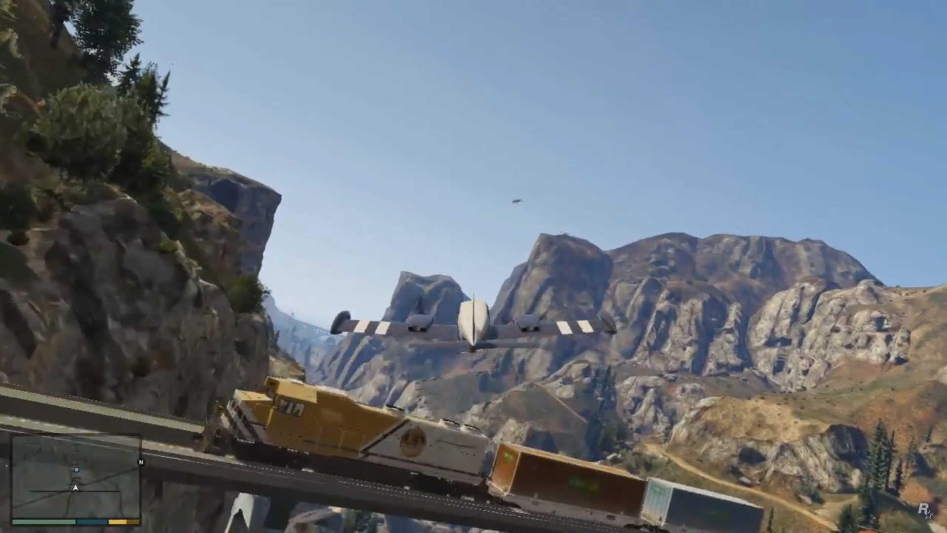 Trevor is driving a Sanchez dirtbike chasing a Shamal during the mission Caida Libre. He jumps over a moving train.