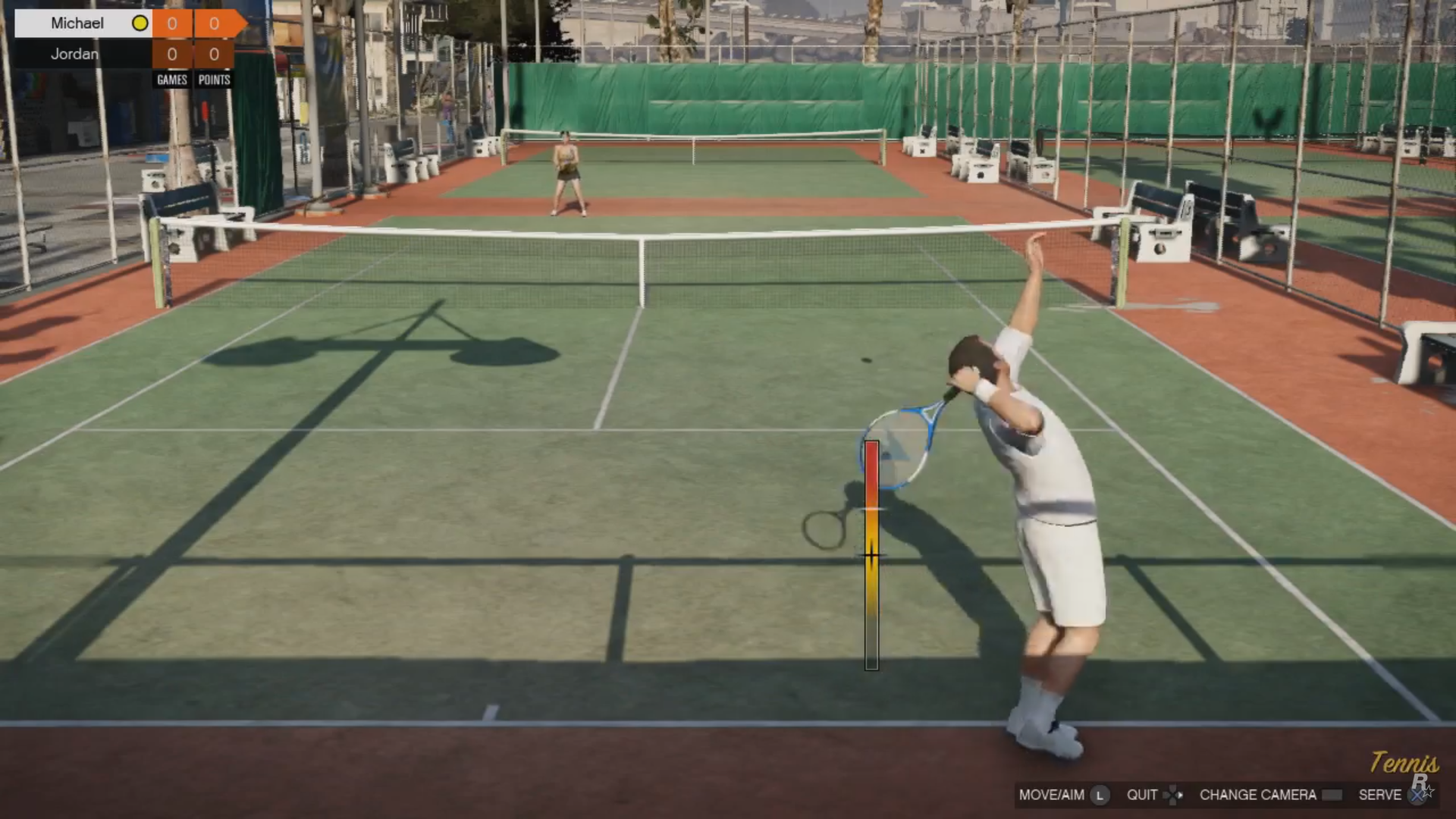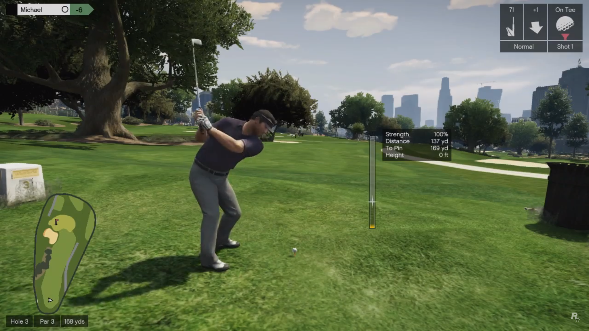 A golfer hits a golf ball as the camera transitions to a mid-day scene of the Los Santos Golf Club with a Los Santos backdrop.