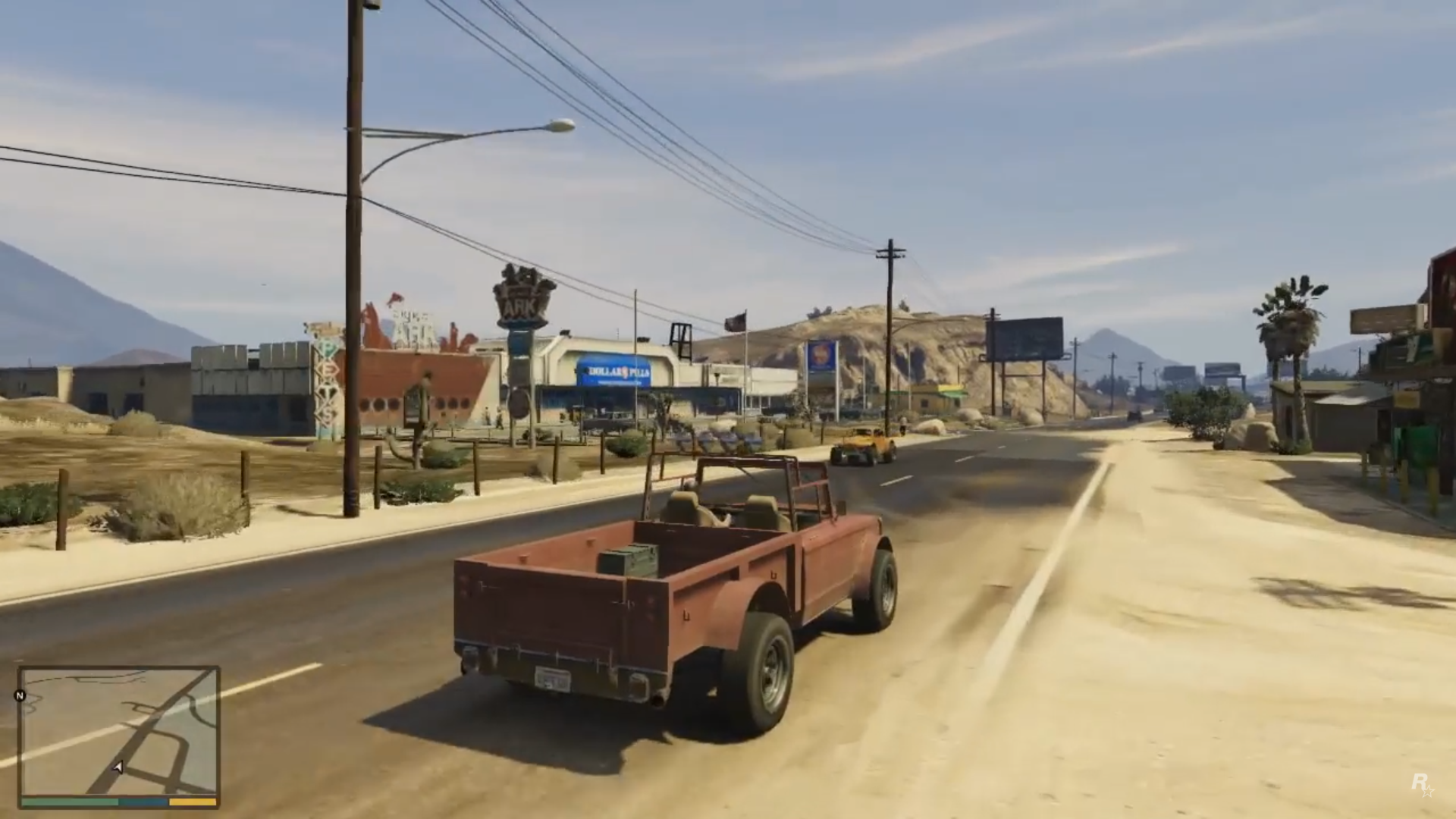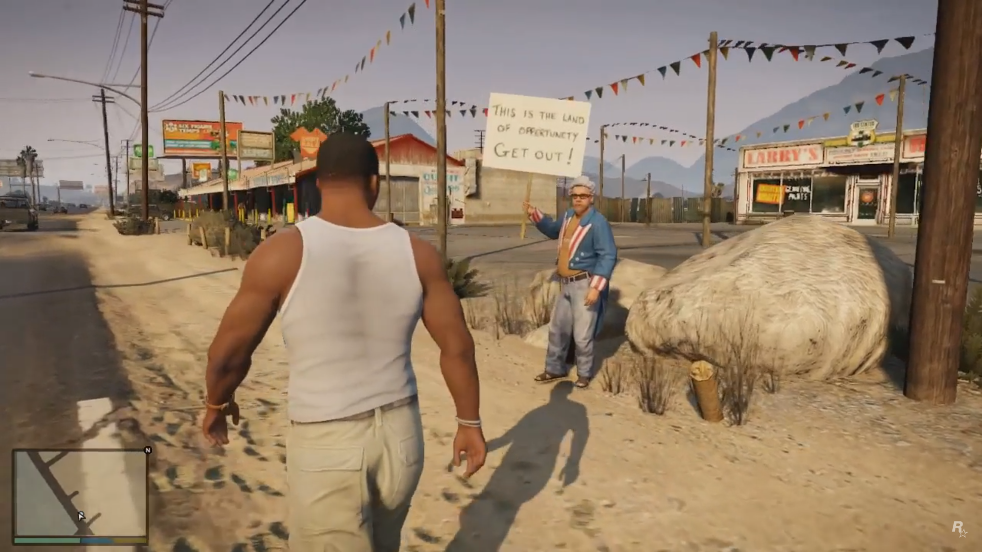 Overview of a busy Sandy Shores. A liquor store sign is seen in the foreground, and Trevor can be seen walking towards his Bodhi below. A Freight Train is seen passing by in the distance.
