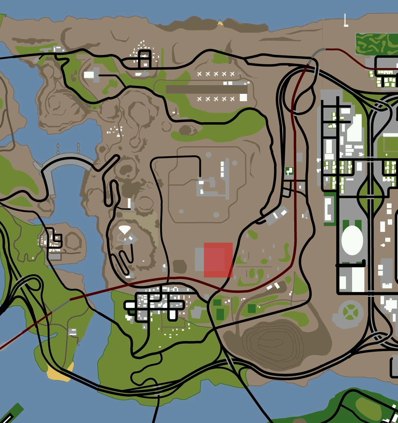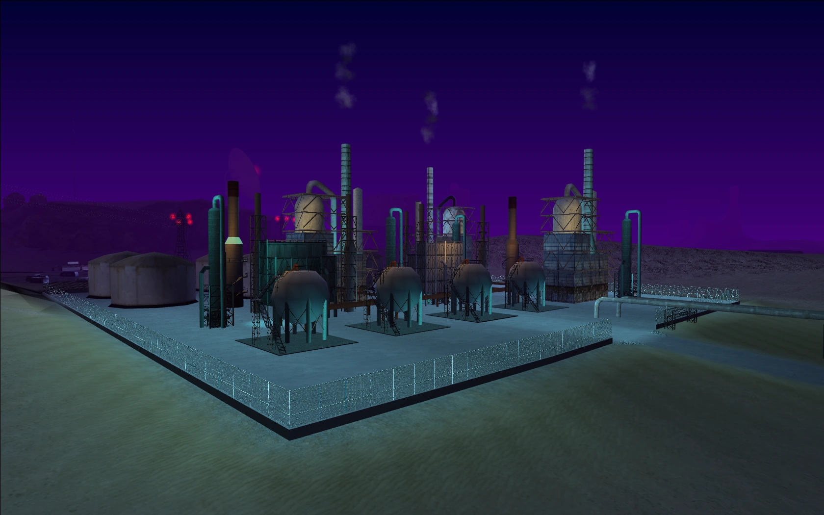 The refinery is comprised of large, slender smoke stacks and round storage tanks, which can be easily seen from the nearby tracks of the Brown Streak Railroad. To the west of Green Palms is the Lil' Probe'Inn, and to the southwest is the town of Fort Carson. Directly to the north is Area 69.
