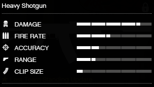 Compared to other weapons of its class, the Heavy Shotgun has a unique property of firing slugs instead of pellets. This means that a shot, if it hits the target, it always deals 117 damage. While this has the drawback of reducing the weapon's max potential damage, it significantly increases the firepower at medium and long ranges, as a shot (assuming the shot hits the target) is powerful, whereas pellets shotguns are not very effective at medium range, due to the fewer pellets hitting the target at medium range, dealing lower damage. The Heavy Shotgun is semi-automatic, and fires at 200 shots per minute, which is slightly lower than the fully-automatic Assault Shotgun's 240 RPM.