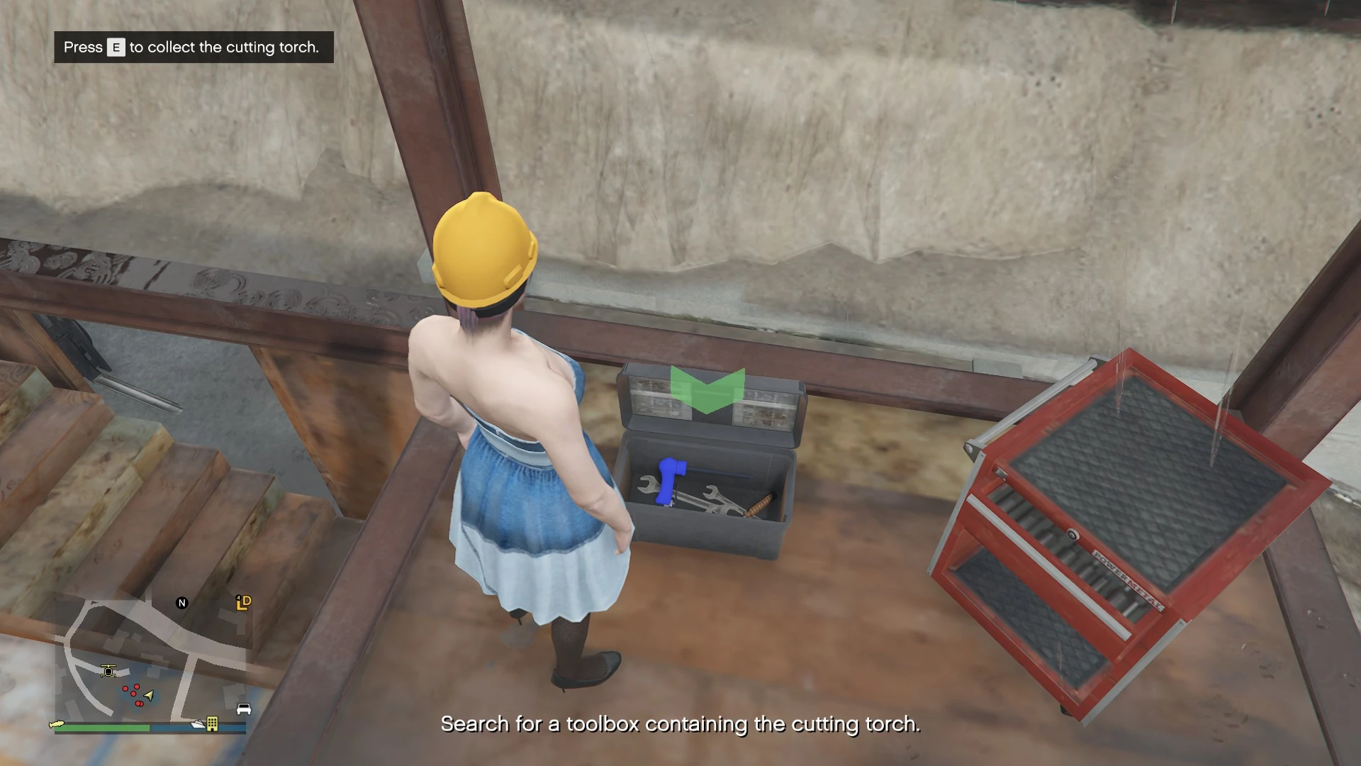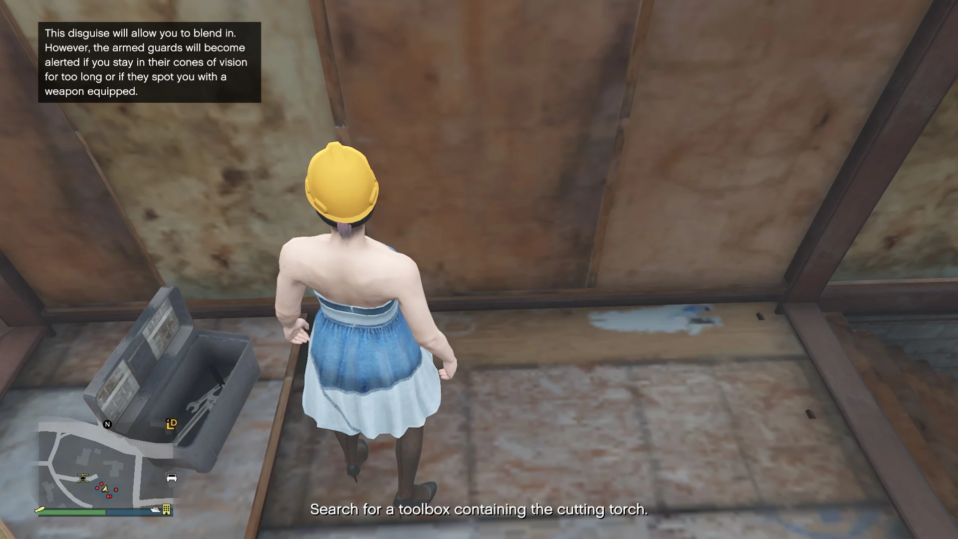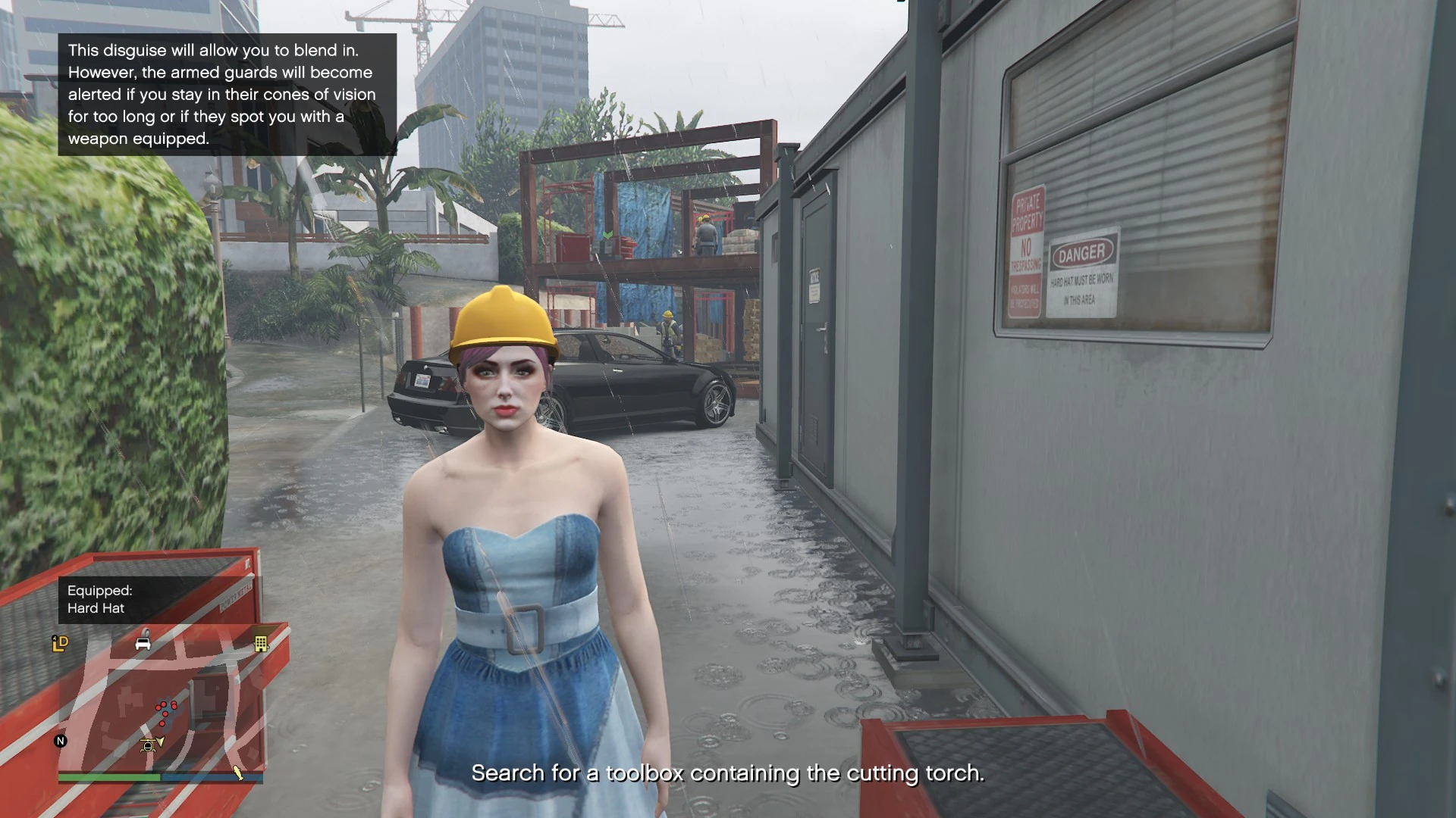 Once the player arrives to the designated location, the player has the option to avoid the cones of vision from the guards or fight them while searching for the cutting torch. The target item will be located in one of many tool boxes scattered throughout the construction site. Pavel also suggests to pick up a hard hat marked on the map to blend in and avoid immediate detection from the guards.