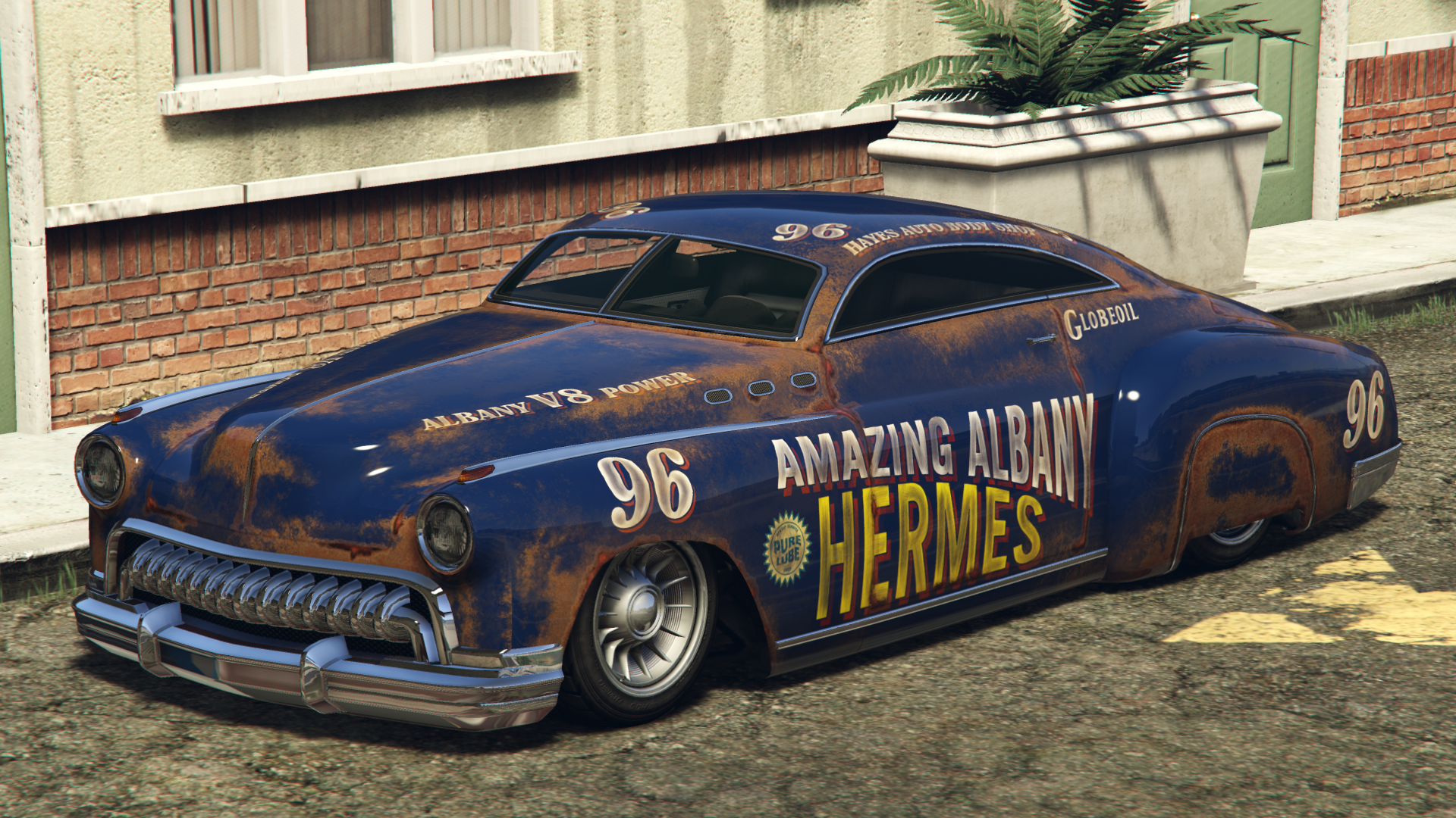The Hermes is a customized late 1940's coupe featured in Grand Theft Auto: Vice City, Grand Theft Auto: San Andreas and Grand Theft Auto: Vice City Stories, and Grand Theft Auto Online as part of The Doomsday Heist update, released on December 25th, 2017, during the Festive Surprise 2017 event. It is manufactured by Albany in the HD Universe.