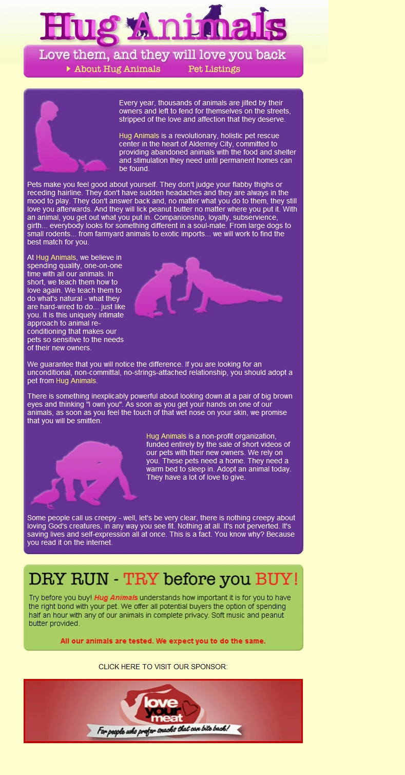 The site focuses on protecting and caring for animals. It has a list of animals up for adoption but unfortunately the player cannot adopt them. It is implied that the site supports bestiality.