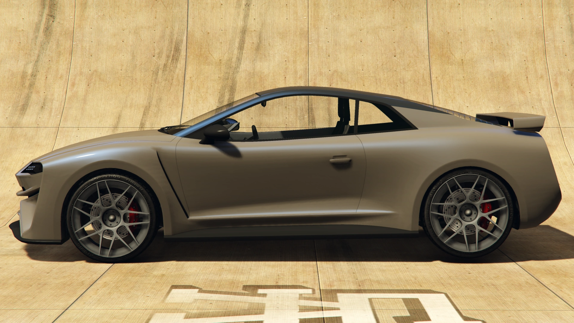 The sides of the car are defined by the rounded fenders and the thin exit vents located between the front arches and the doors, while the lower sides have straighter lines at the bottom of the doors, creating a concave profile above the plastic skirts. The glasshouse area has black trim around the windows and on the inner separations, with the doors having plastic rear-view mirror shells near the A-pillars. The area behind the cabin has a sloped profile and has a large rear window, while the rear section features a spoiler by default.
