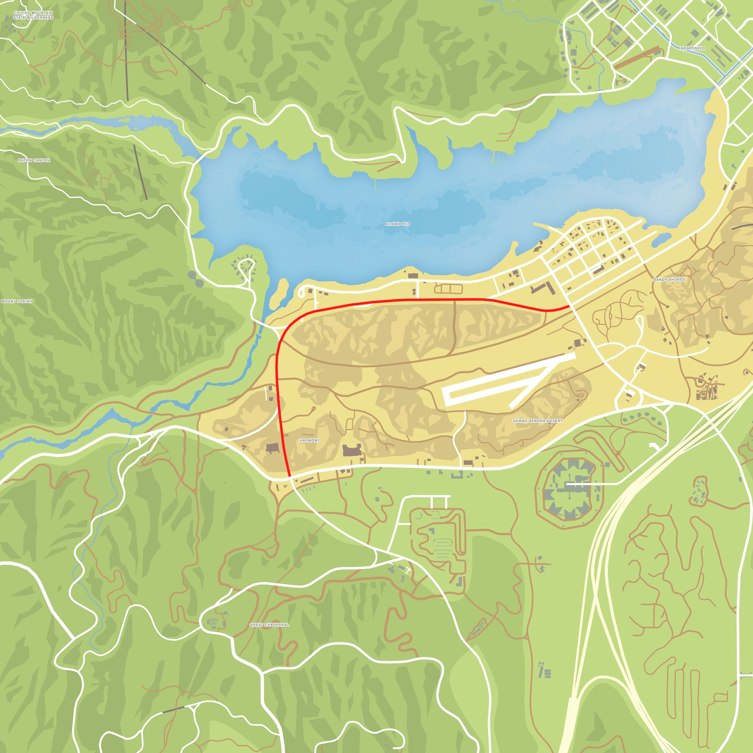 Joshua Road is a two-way road in Grand Theft Auto V and Grand Theft Auto Online. The street starts at intersection of Panorama Drive and East Joshua Road in Sandy Shores then travels westward throughout the Grand Senora Desert then ends at Route 68 in Harmony, where it continues as Senora Road.