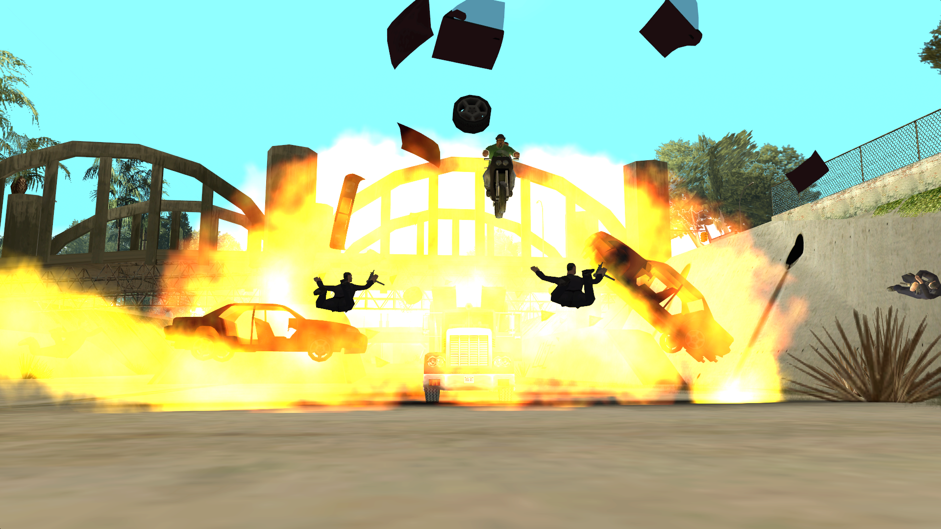 | Smoke uses a Packer to jump over the roadblock. The roadblock then explodes, killing everyone but CJ and Smoke. |