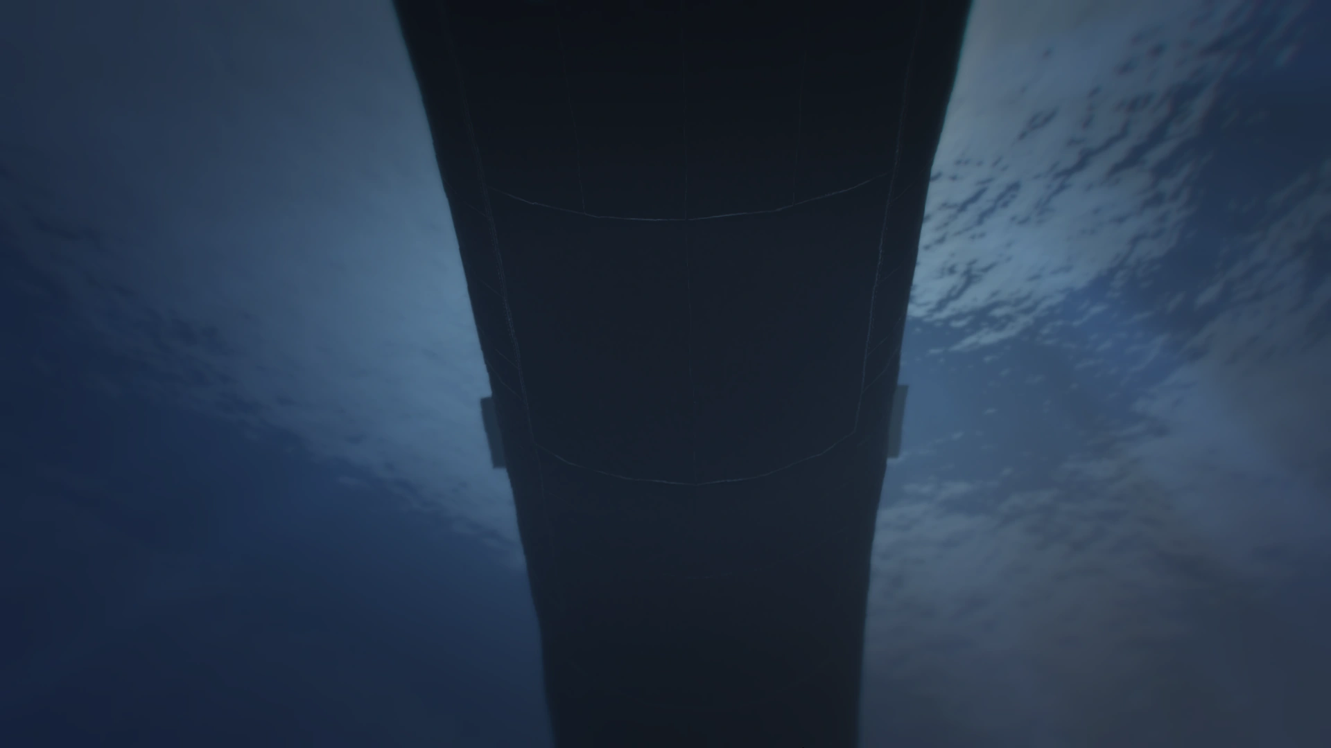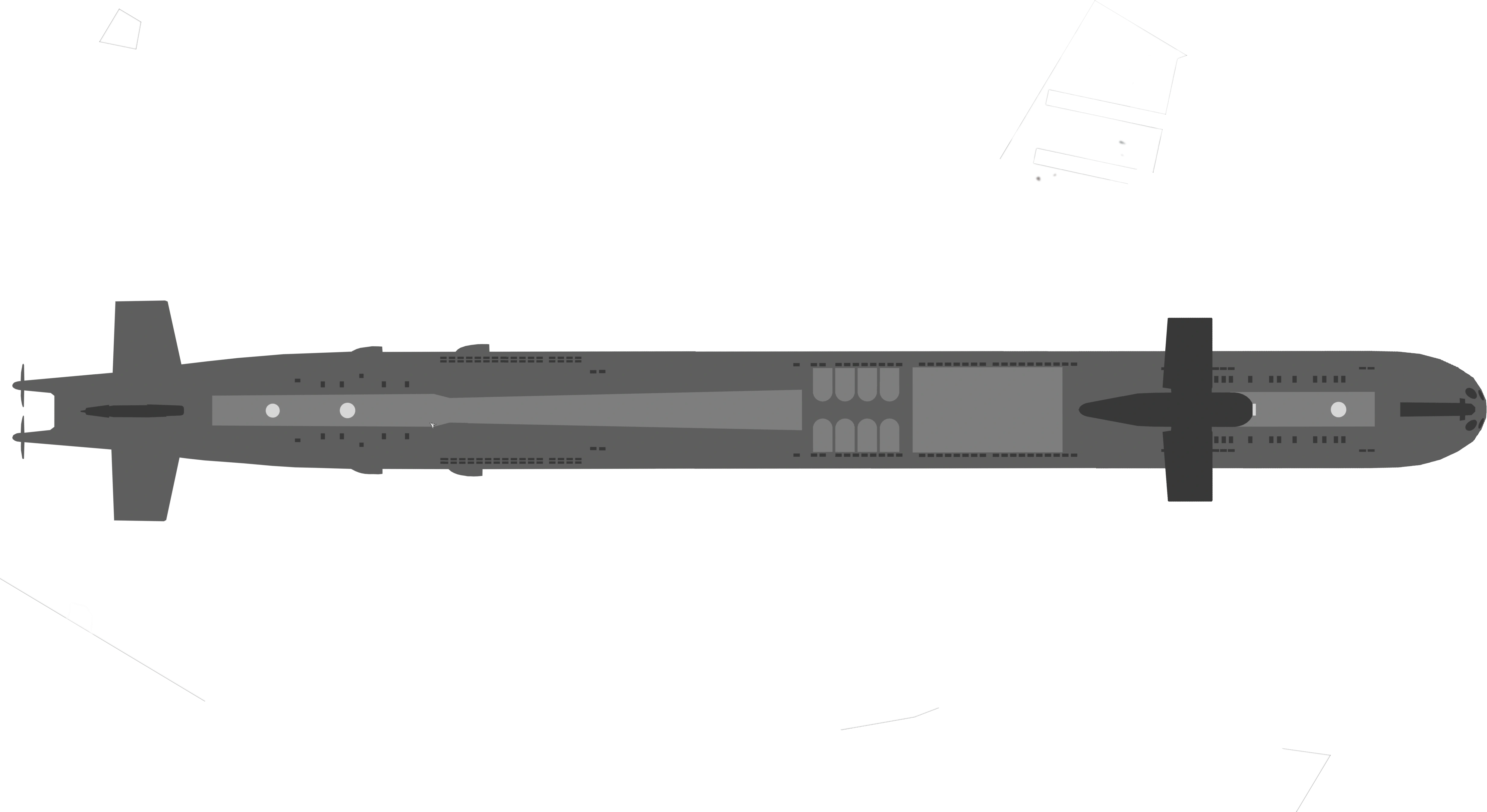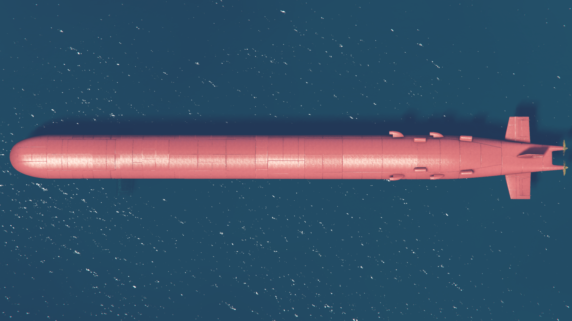 Immediately aft of the sail, a raised rectangular "hump" extends for approximately one third of the length of the sub. This houses the interior Moon Pool and Guided missile systems. Eight permanently open missile tubes are present in two rows of four. Plating sections on the hull forward of the missile tubes are indicative of the Moon Pool helicopter entrance hatch. Similar underside plating indicates the entry point for the submersible Moon Pool bays. The hump section tapers down to the tail where stabilizing fins and the twin seven-fin propellers can be seen. Inlet valves for the ballast system can be seen under the aft section of the boat.