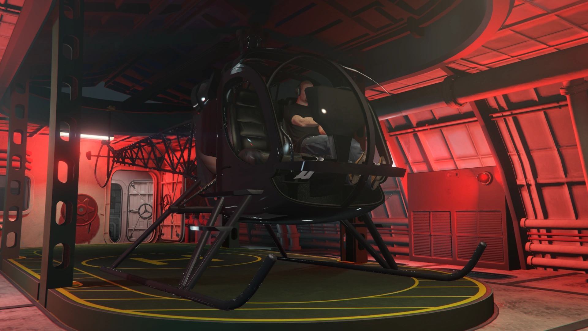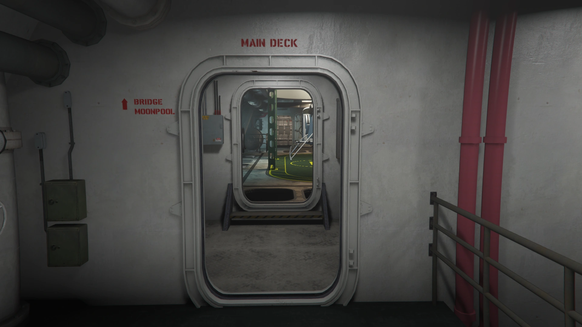 - Moon Pool: Located next to the engine room, this area features two floor bases that can hold one personal submersible vehicle such as the Stromberg or Toreador, as well as the Avisa if purchased. This allows players to board and exit the Kosatka using submersibles. (The Avisa bay is dedicated to it, and cannot be used for a second Stromberg or Toreador.) The ladder provides direct access to the Sparrow helipad above.