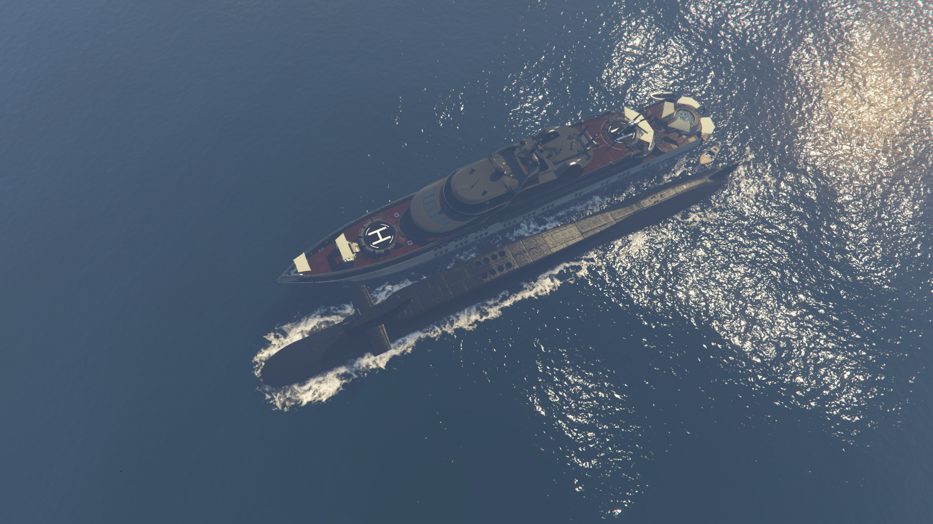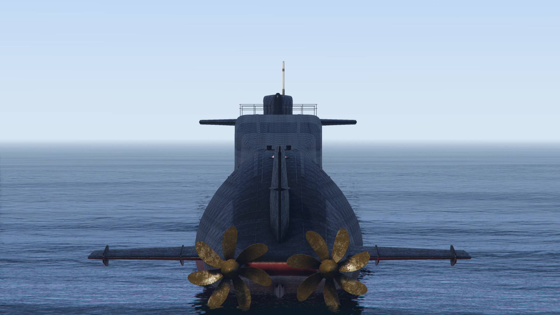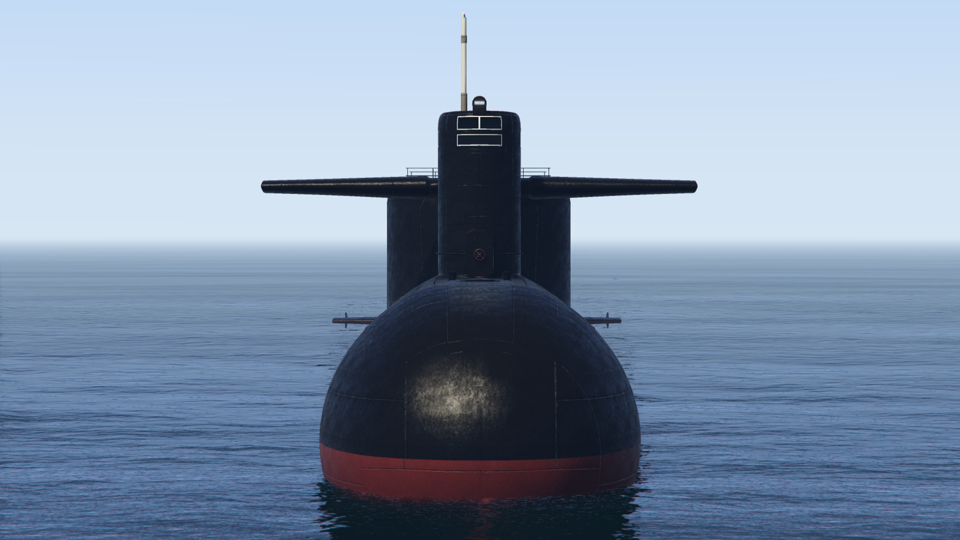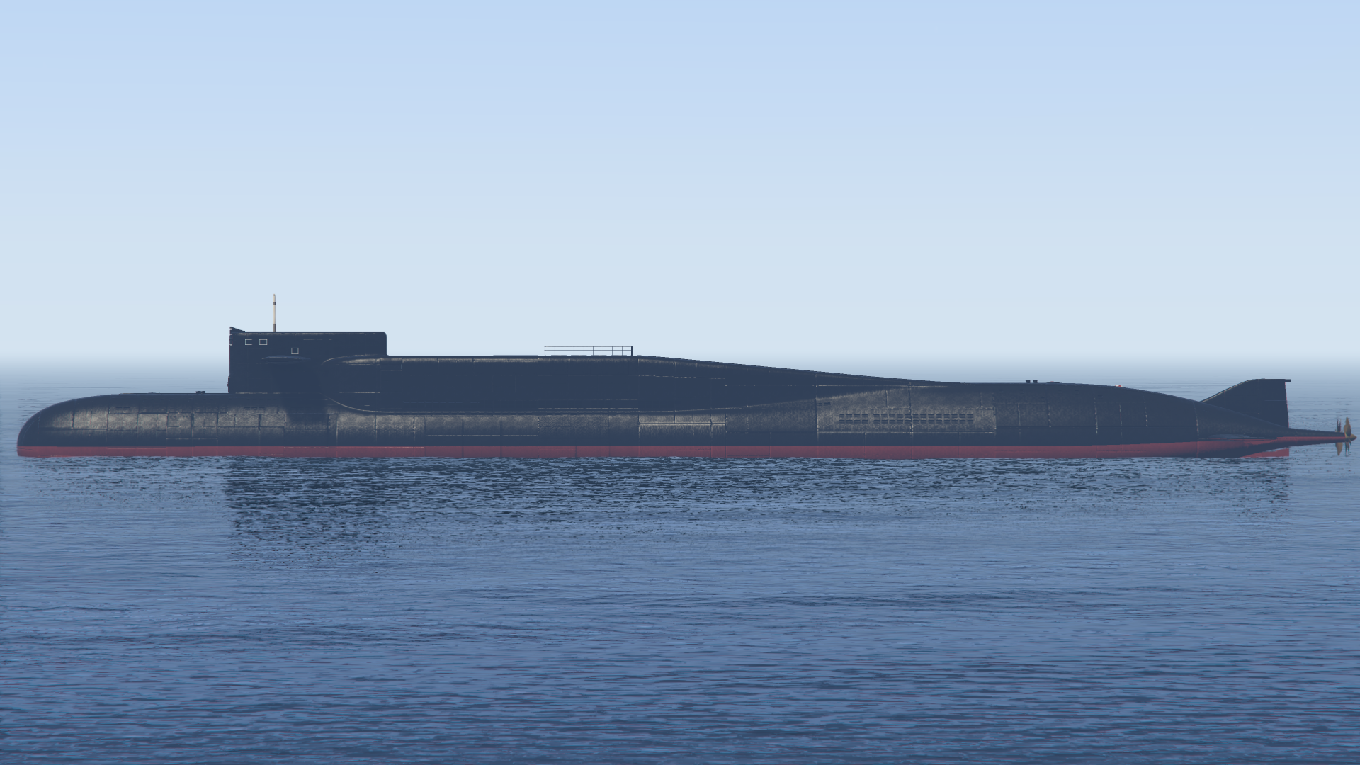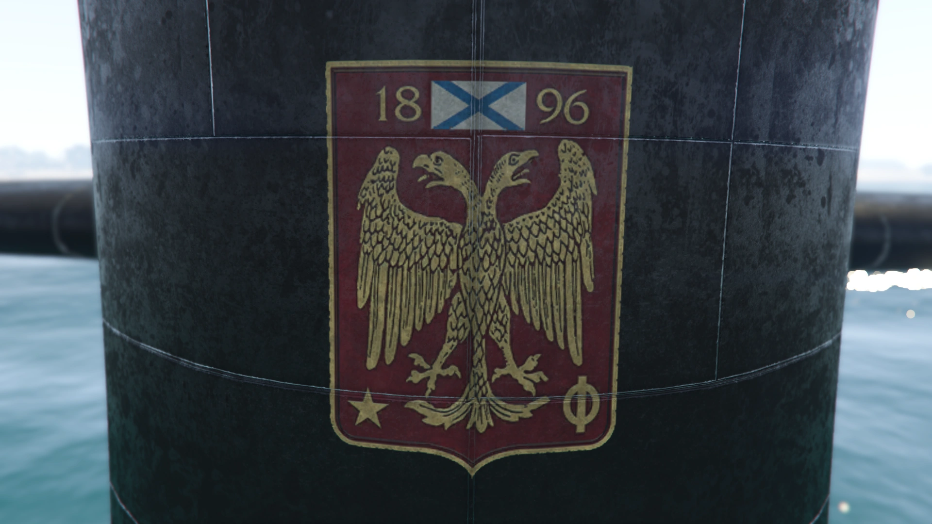 The vessel is a large cylindrical Teardrop hulled submarine with a length exceeding that of the Galaxy Super Yacht[3]. The bow is spherical with a player-selected flag marked in the center, just below the surfaced waterline. A vertical sail (incorrectly referred to in game as a Conning tower[4]) with horizontal diving planes is located a quarter of the length back from the bow of the vessel. This is marked at the front with a Russian heraldic shield featuring a two-headed-eagle, 1896, the Russian naval ensign, a five-pointed star and the Ф Cyrillic character. The player's flag is repeated on the side of the sail along with a prominent 81 numeric stencil. A light and mast are atop the sail, with the former able to be toggled on or off when submerged.