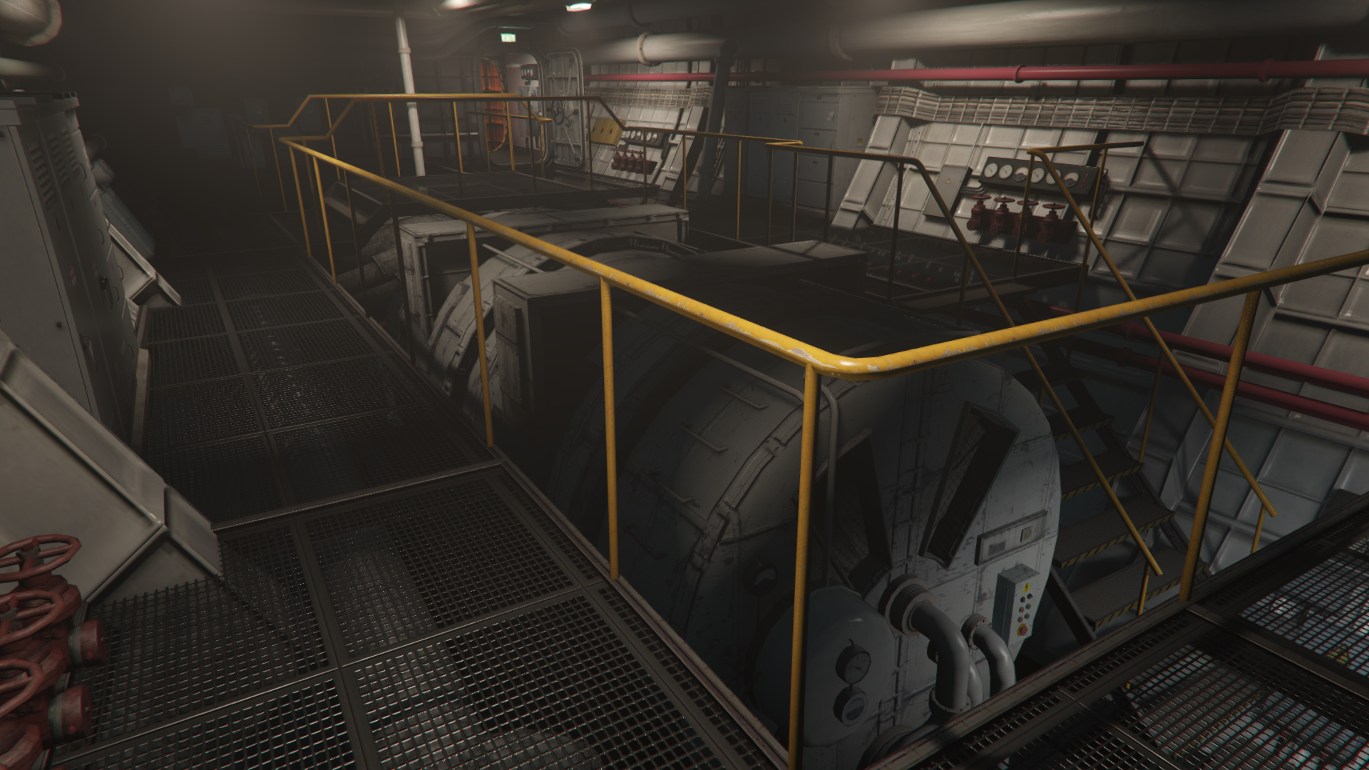 - Engine Room: A large two-level room where the engine is seen, with two elevated walkways passing above it. A set of stairs provide access to the middle floor and another walkway leads to another room with the ladder that connects it with the upper floor.