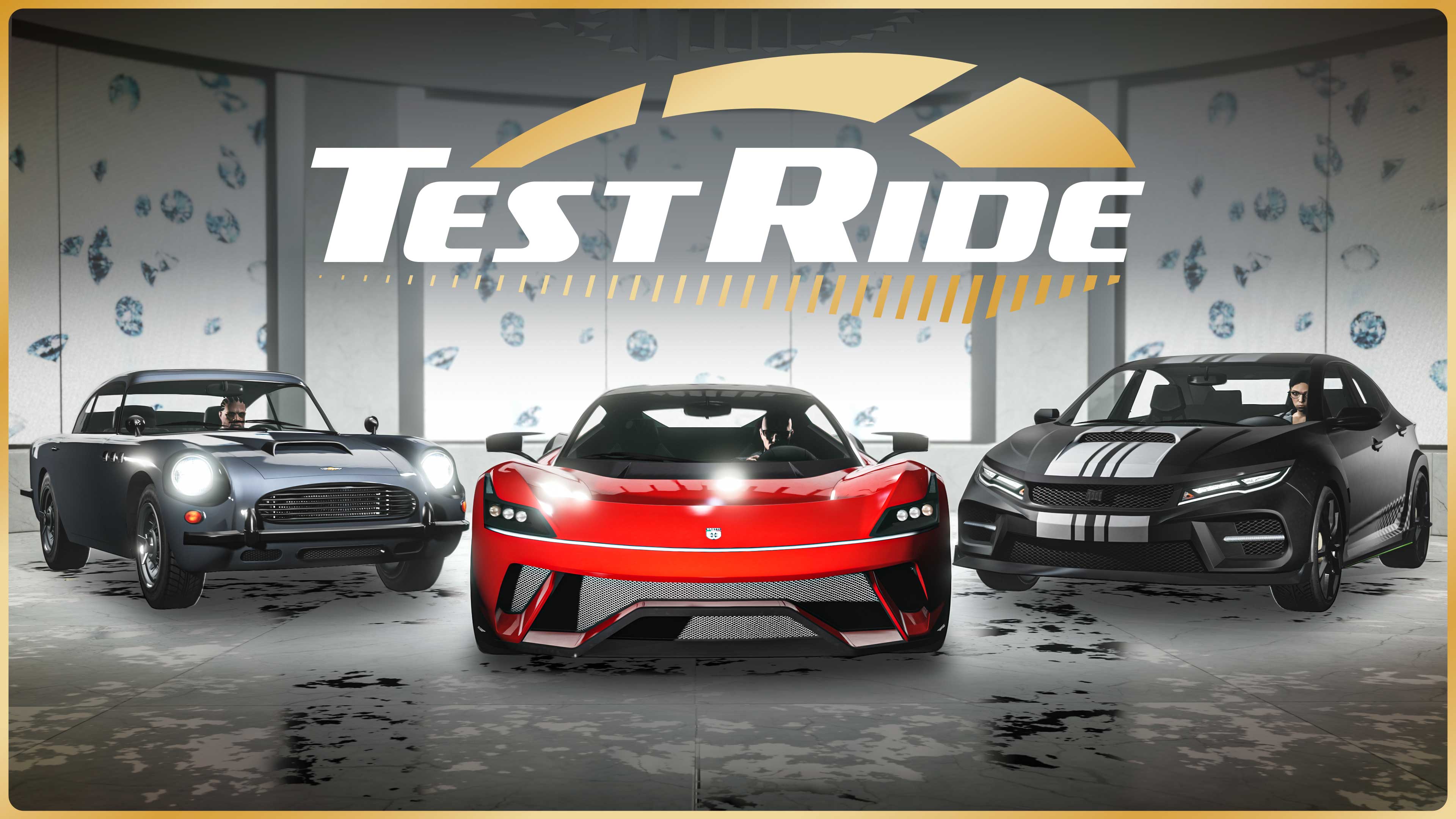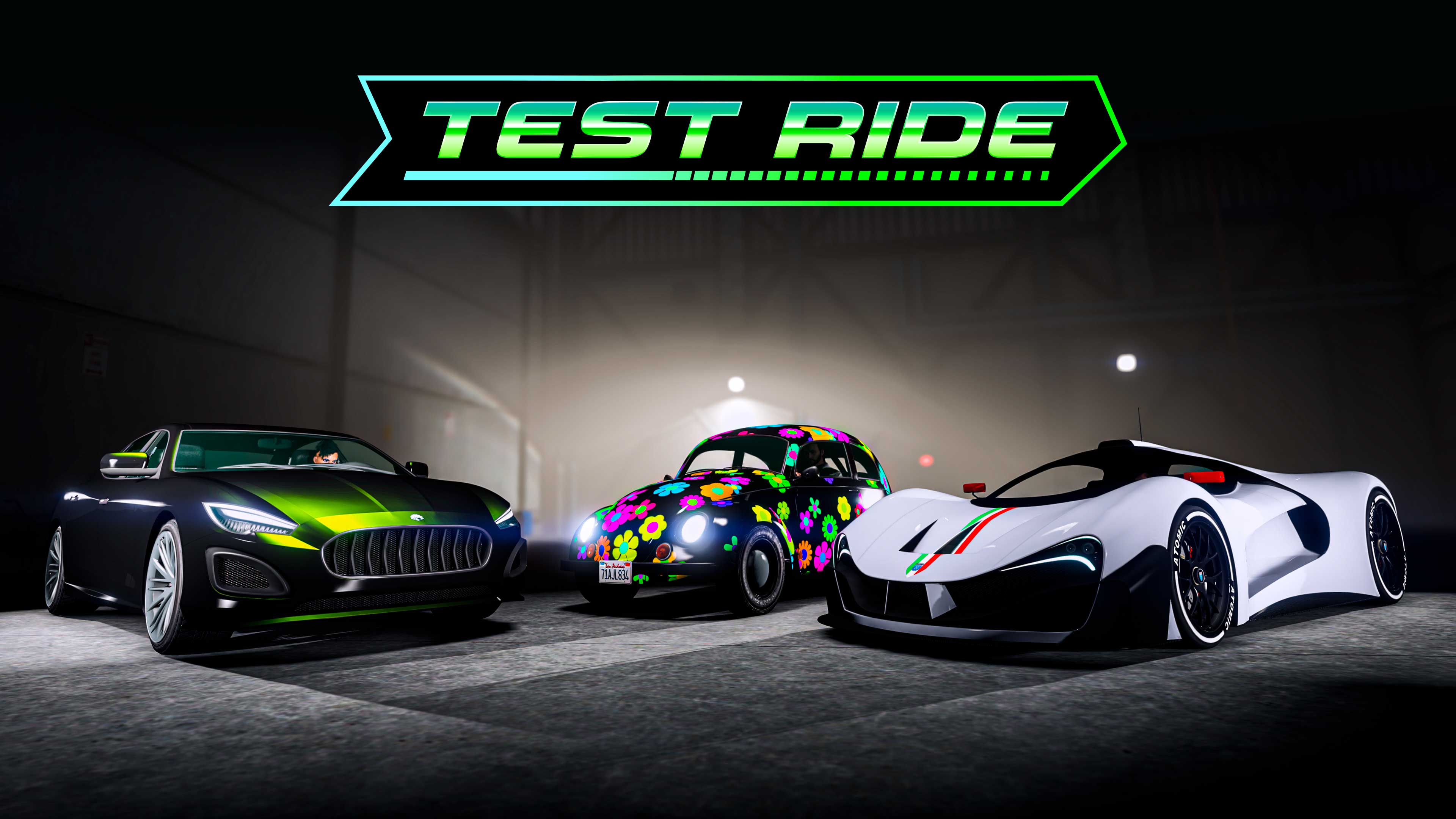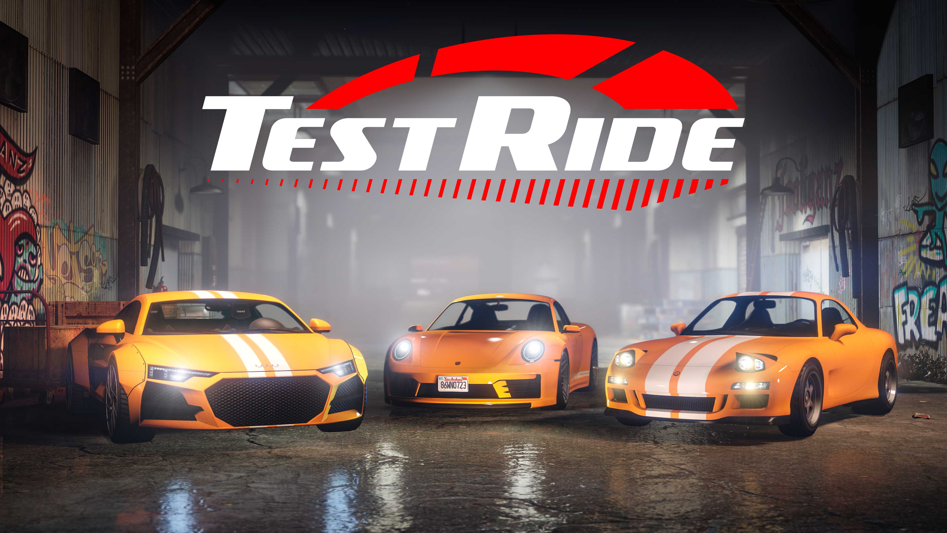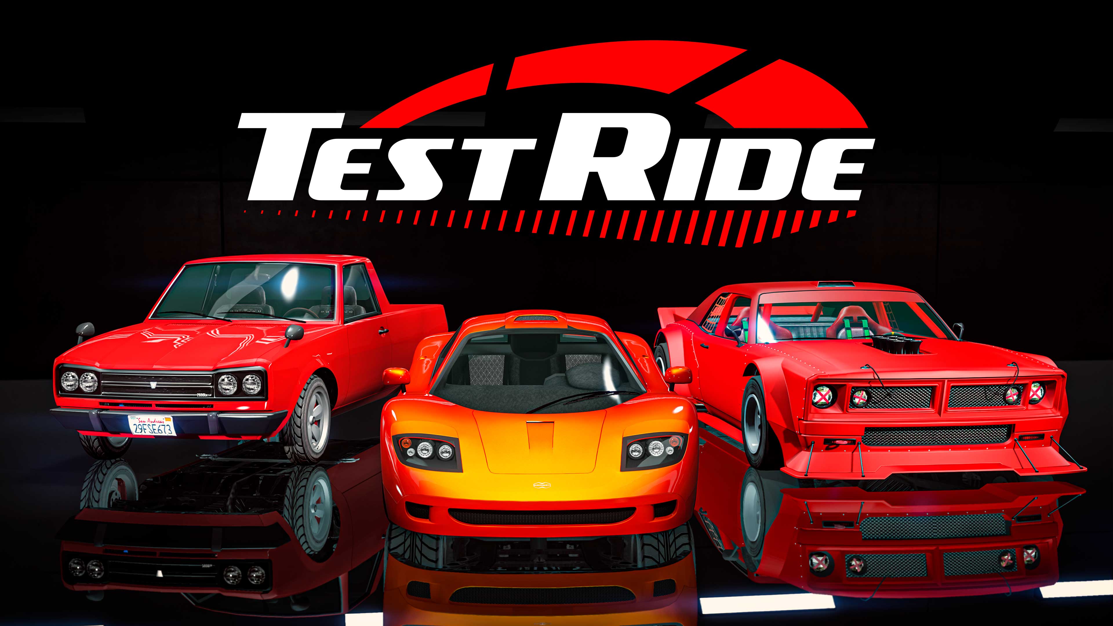 Three cars are parked outside the entrance to the Test Track. These are available for any player to test. They are in stock form mechanically, usually with a livery applied. These are changed every week with the new Event Week tunables update. However, unlike the Prize Ride, the Test Ride vehicles would not change if any player kept a pre-update session open and stayed inside the Meet, even for players freshly joining the session with an updated tunables set. For the first seven weeks after the update, one of the vehicles would be a car that had not yet been made available for purchase by players, meaning the Test Ride was a sneak preview of that particular vehicle which would be made available the following week.