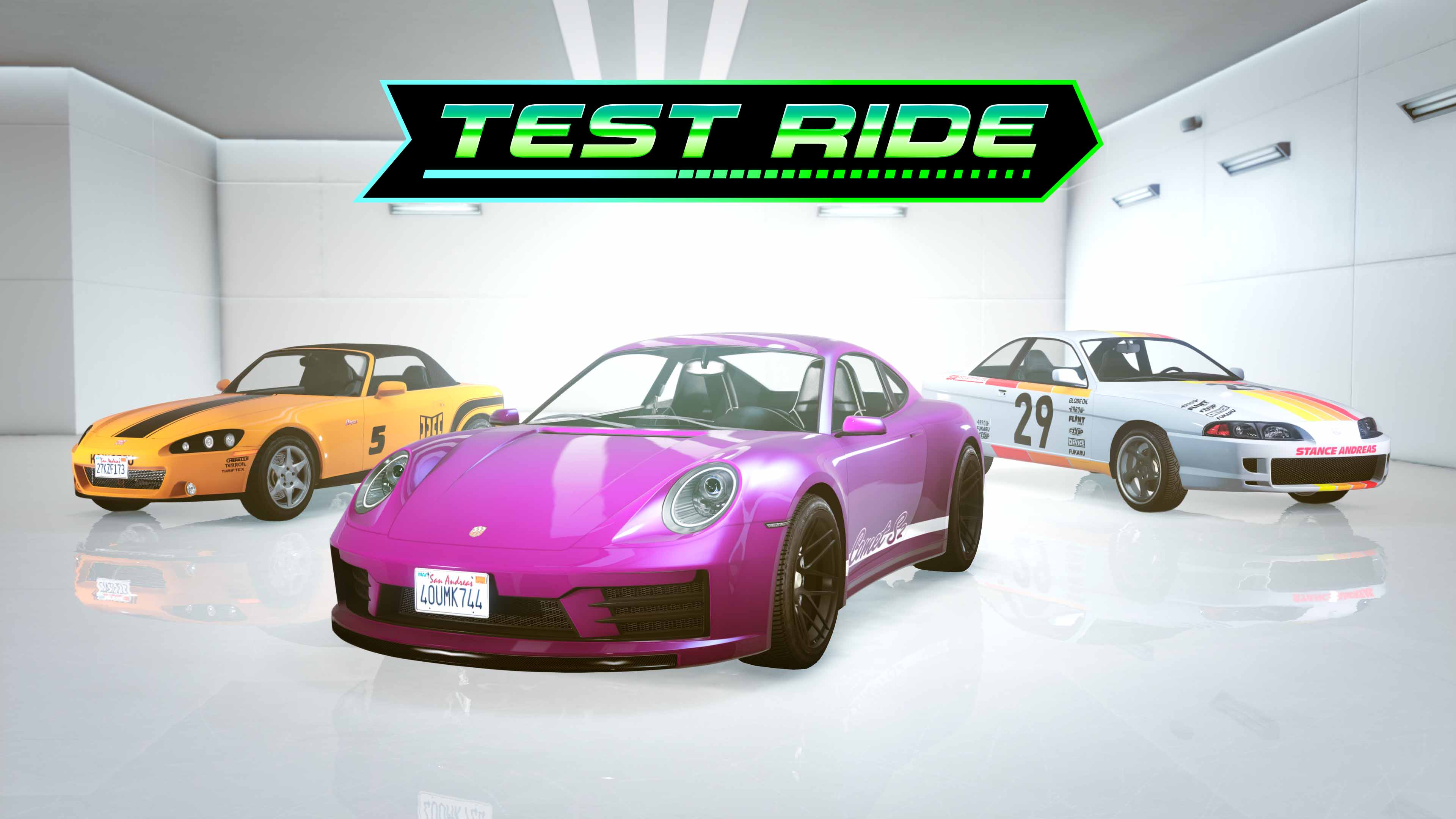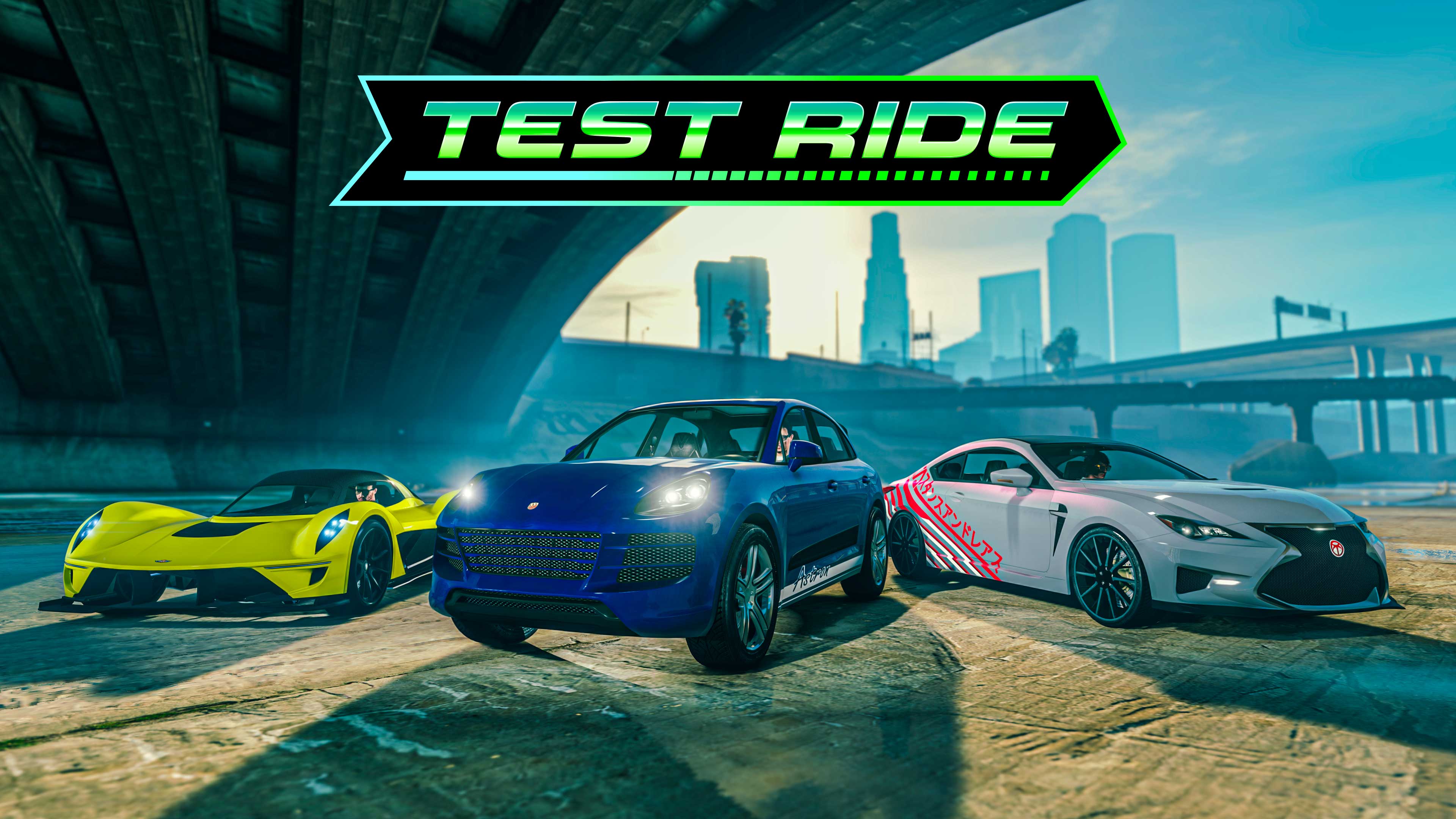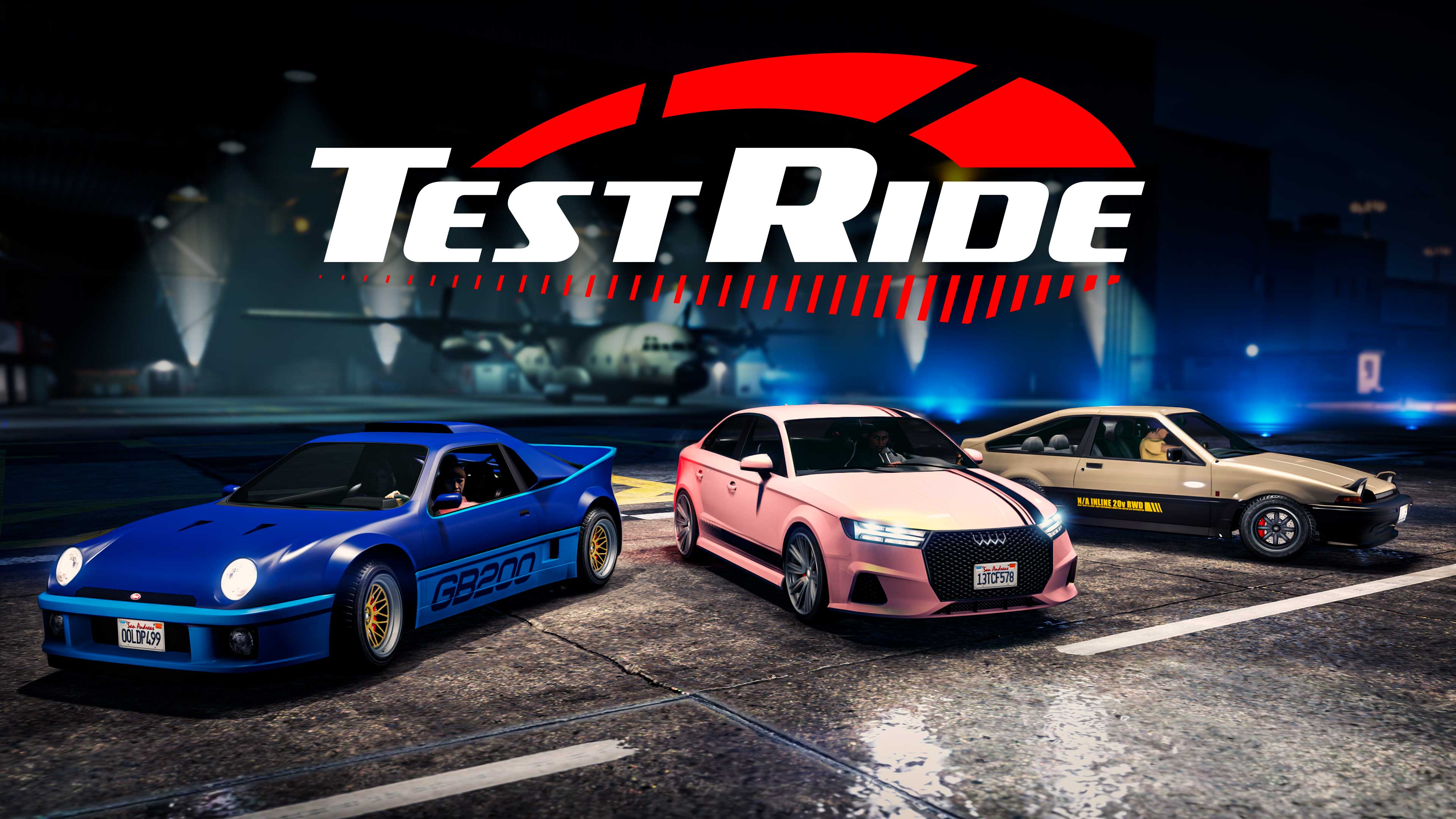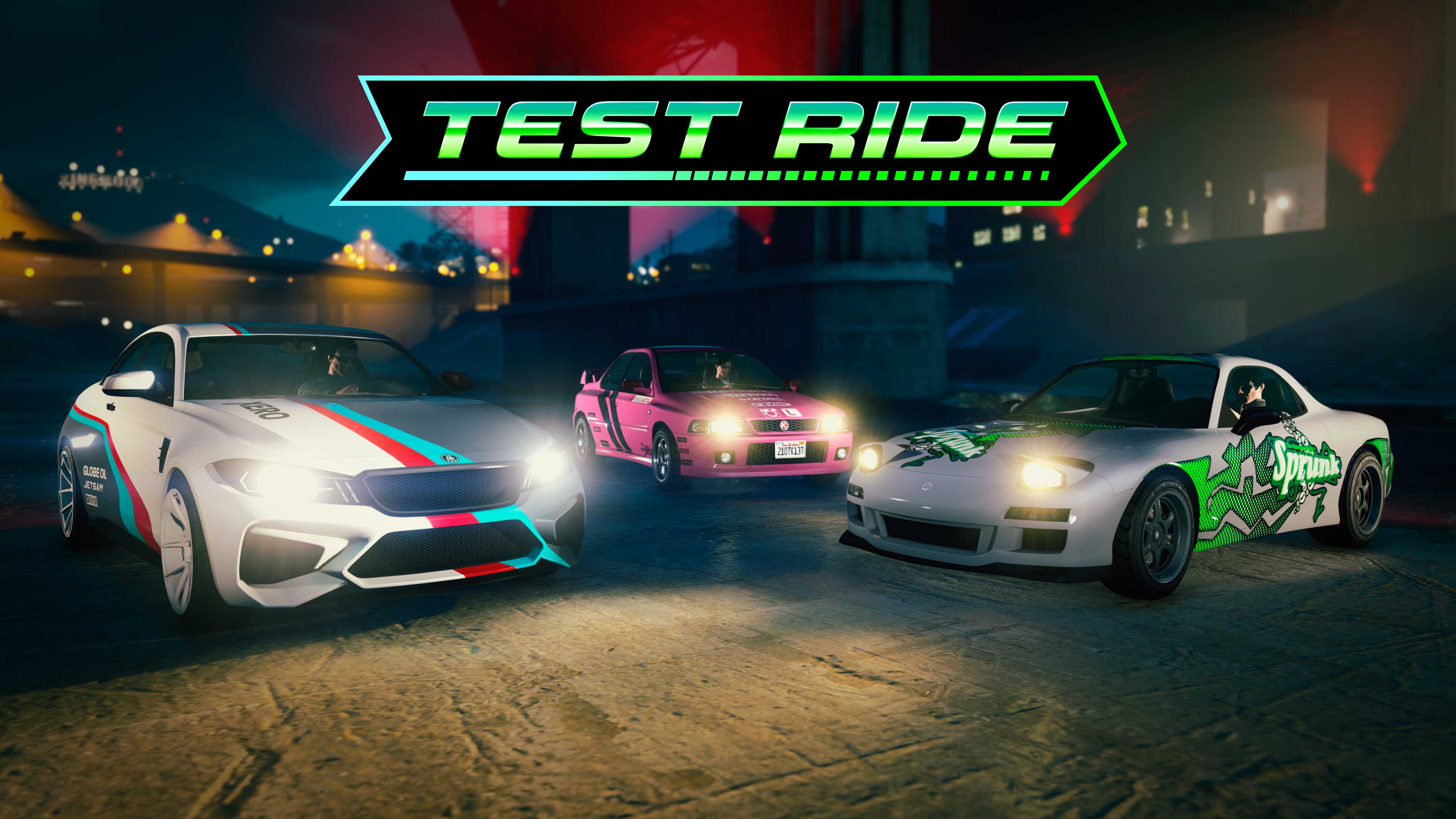 Three cars are parked outside the entrance to the Test Track. These are available for any player to test. They are in stock form mechanically, usually with a livery applied. These are changed every week with the new Event Week tunables update. However, unlike the Prize Ride, the Test Ride vehicles would not change if any player kept a pre-update session open and stayed inside the Meet, even for players freshly joining the session with an updated tunables set. For the first seven weeks after the update, one of the vehicles would be a car that had not yet been made available for purchase by players, meaning the Test Ride was a sneak preview of that particular vehicle which would be made available the following week.