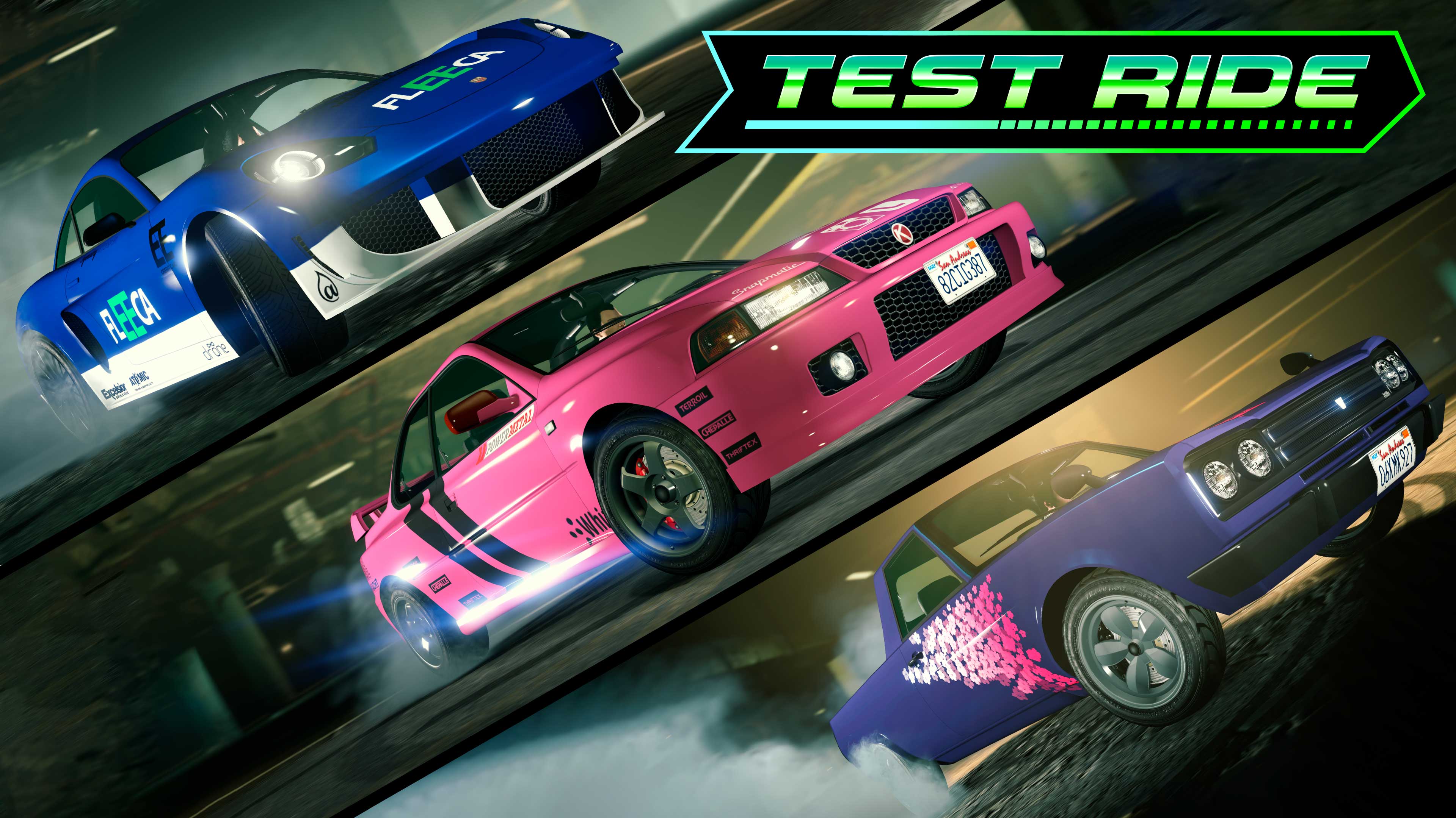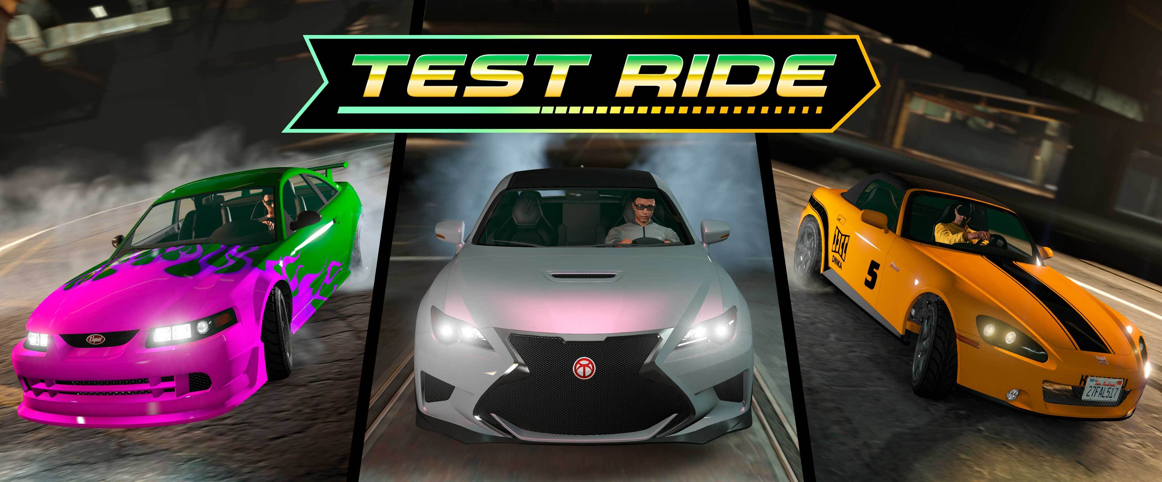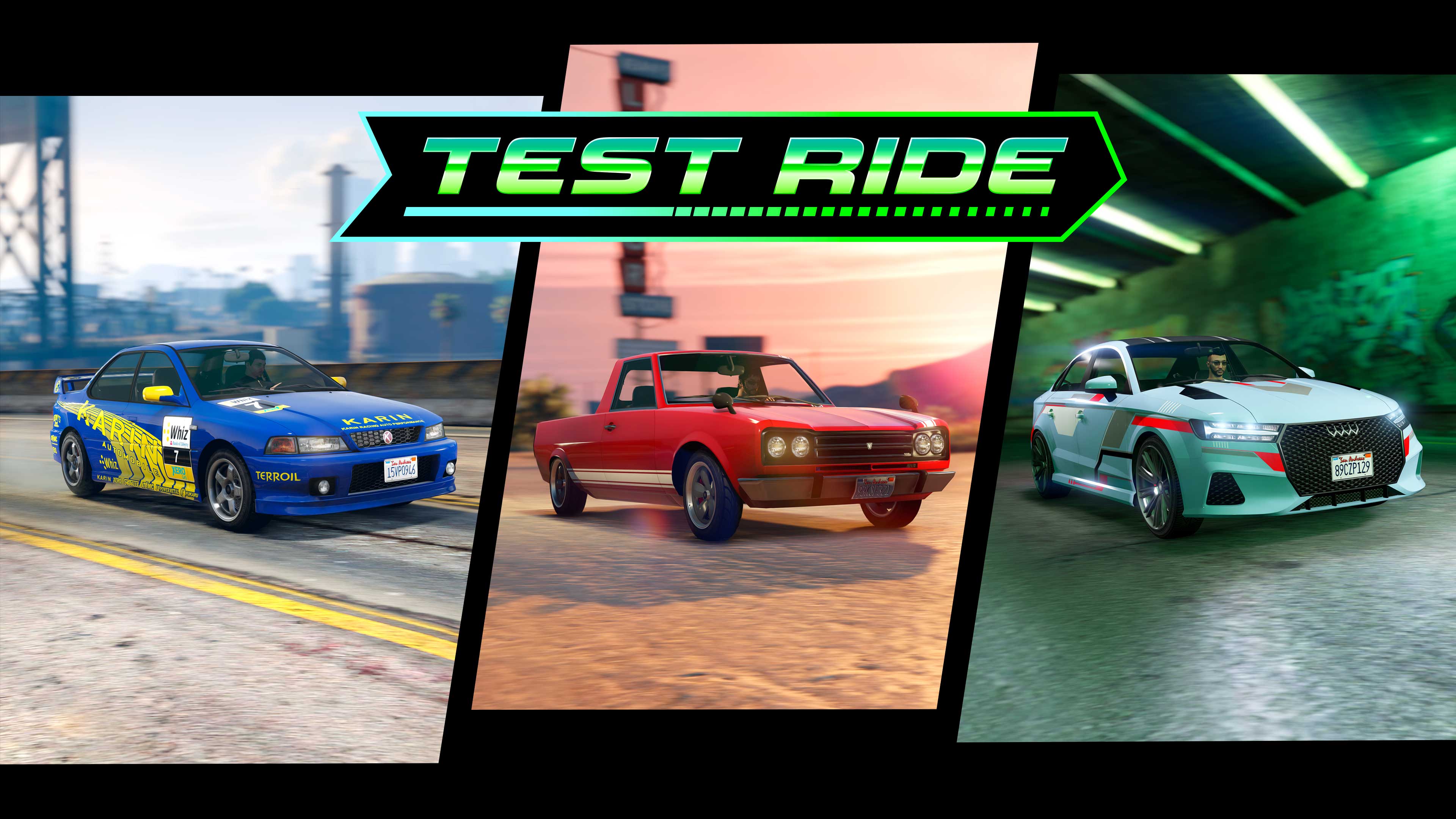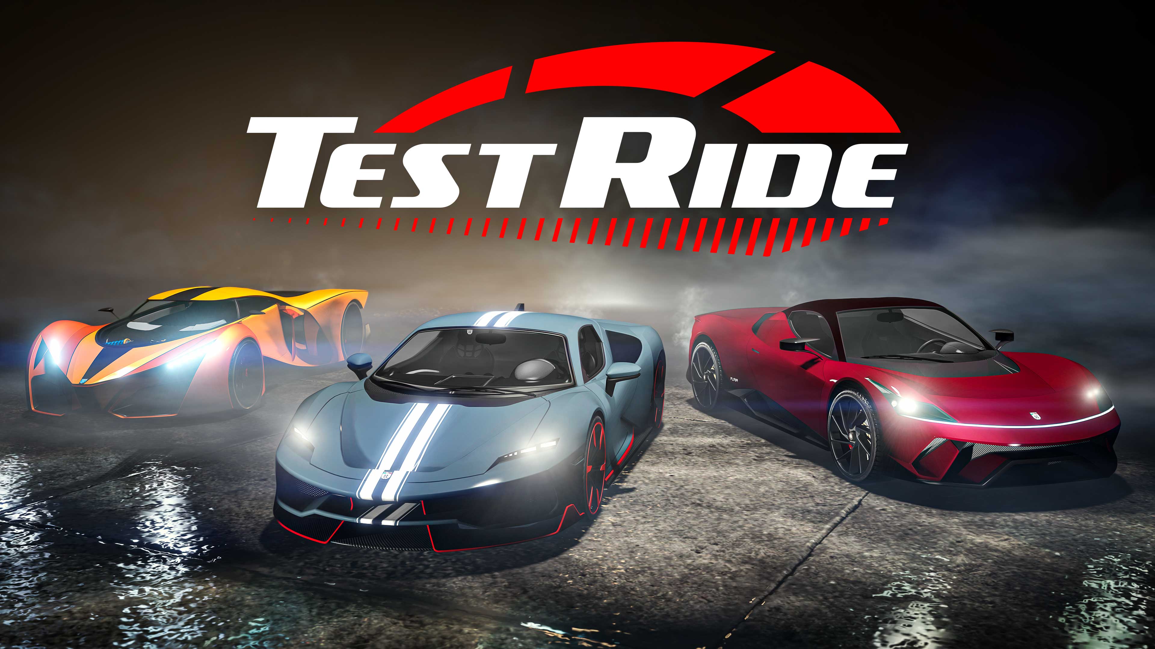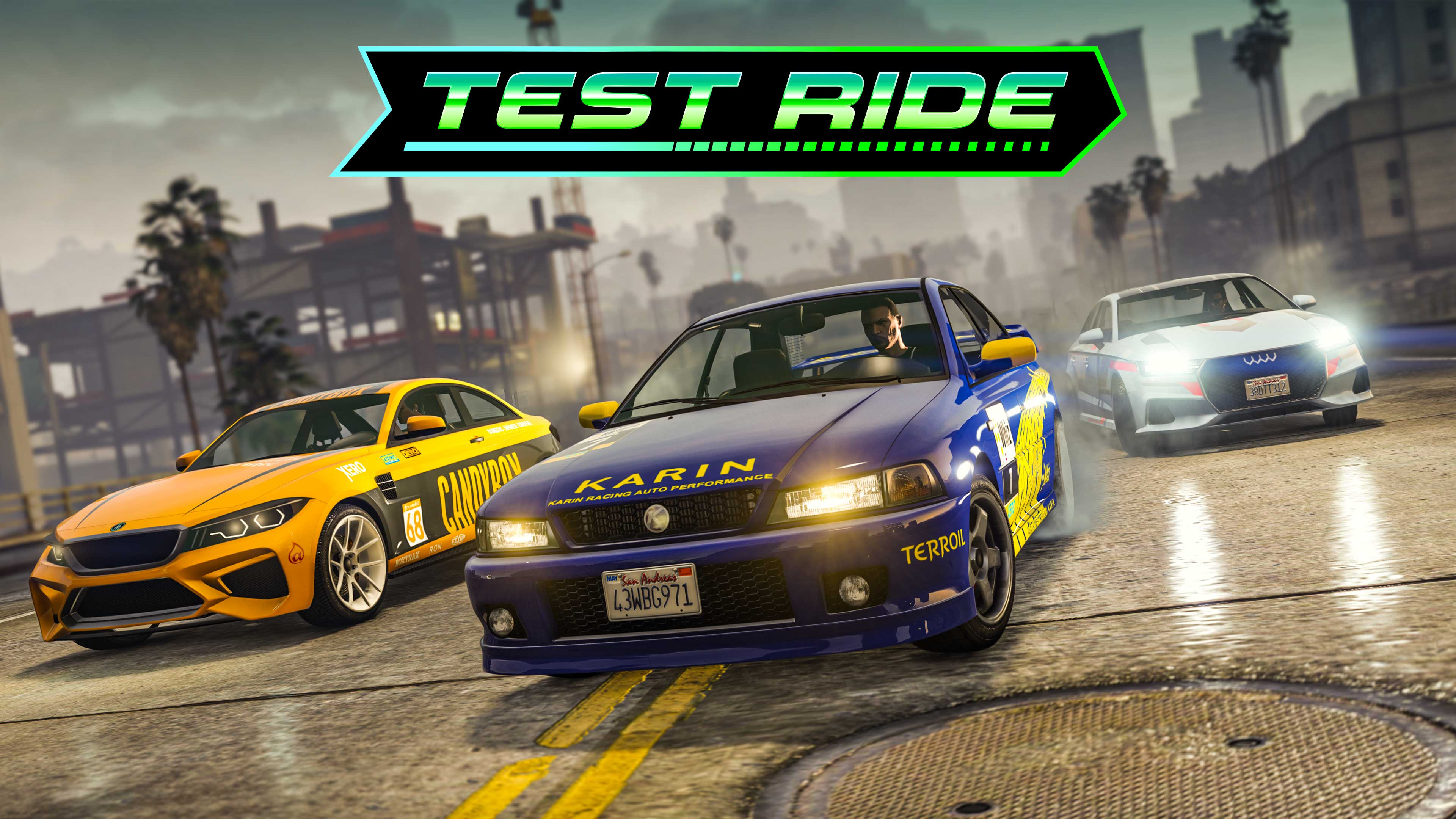 Three cars are parked outside the entrance to the Test Track. These are available for any player to test. They are in stock form mechanically, usually with a livery applied. These are changed every week with the new Event Week tunables update. However, unlike the Prize Ride, the Test Ride vehicles would not change if any player kept a pre-update session open and stayed inside the Meet, even for players freshly joining the session with an updated tunables set. For the first seven weeks after the update, one of the vehicles would be a car that had not yet been made available for purchase by players, meaning the Test Ride was a sneak preview of that particular vehicle which would be made available the following week.