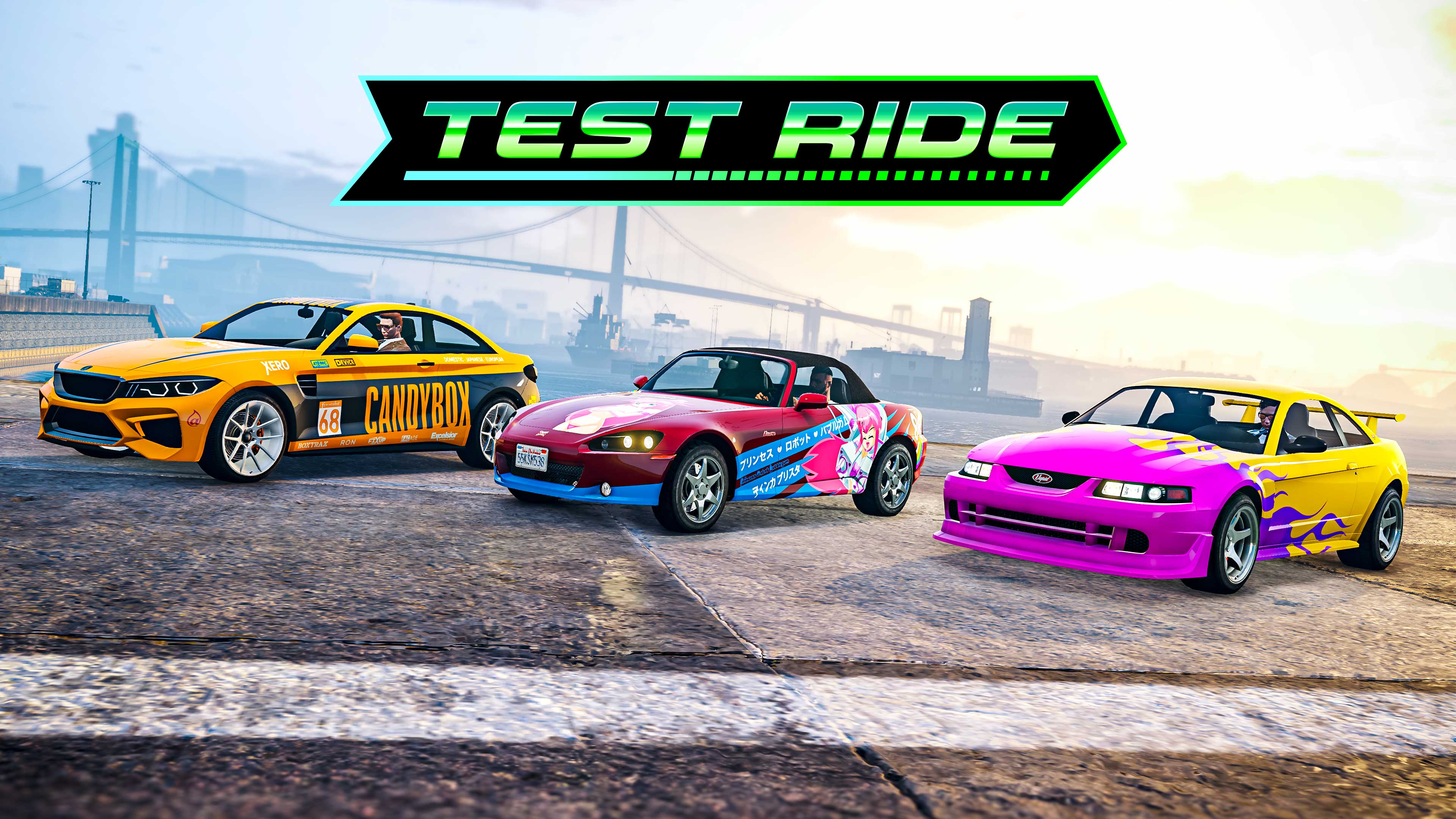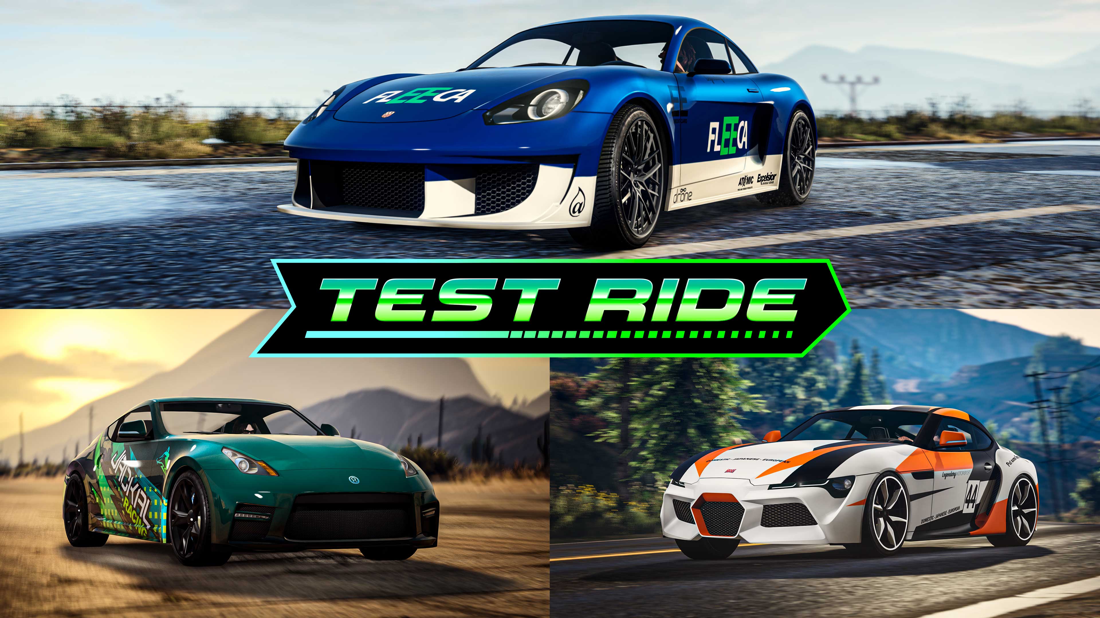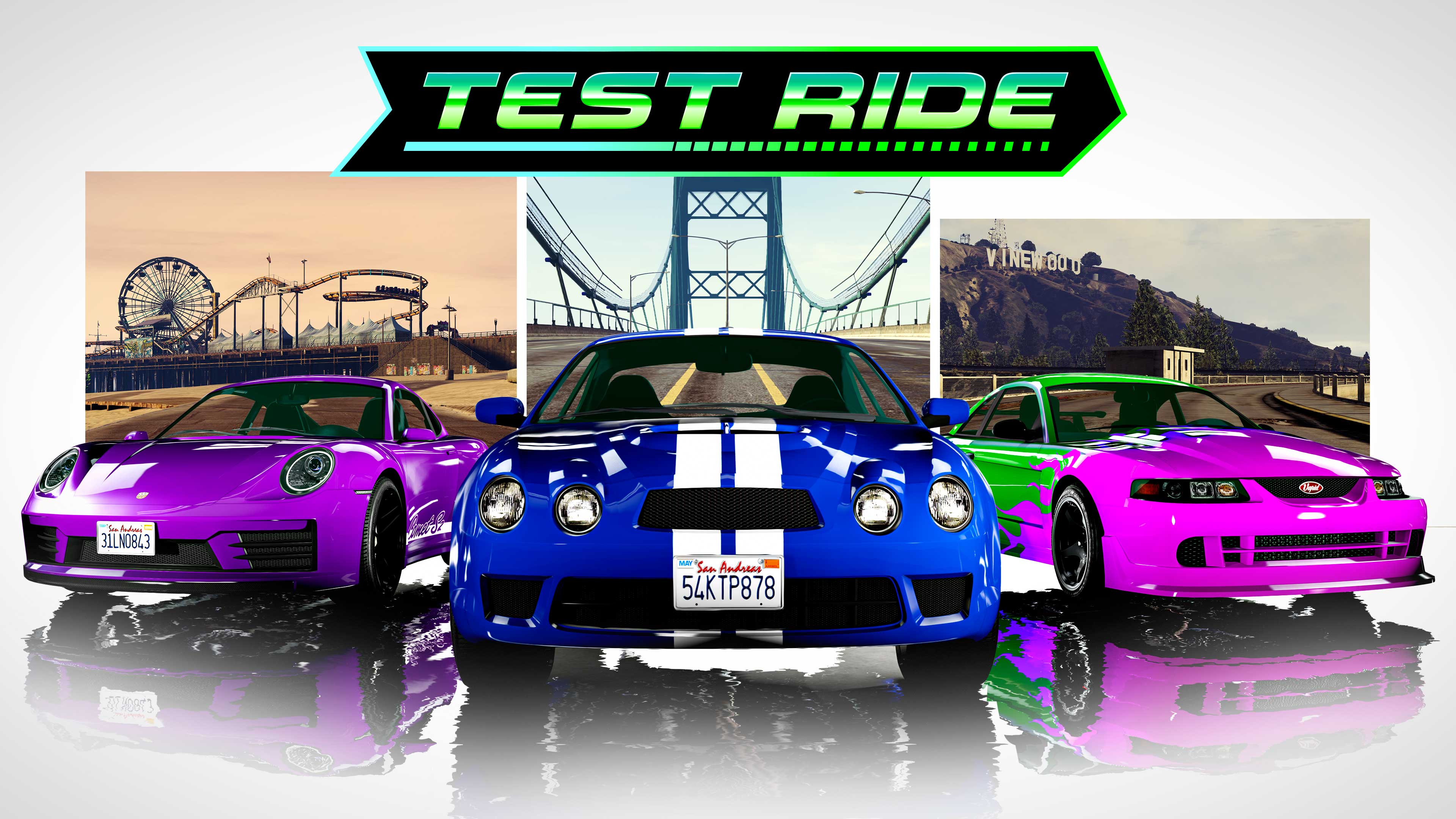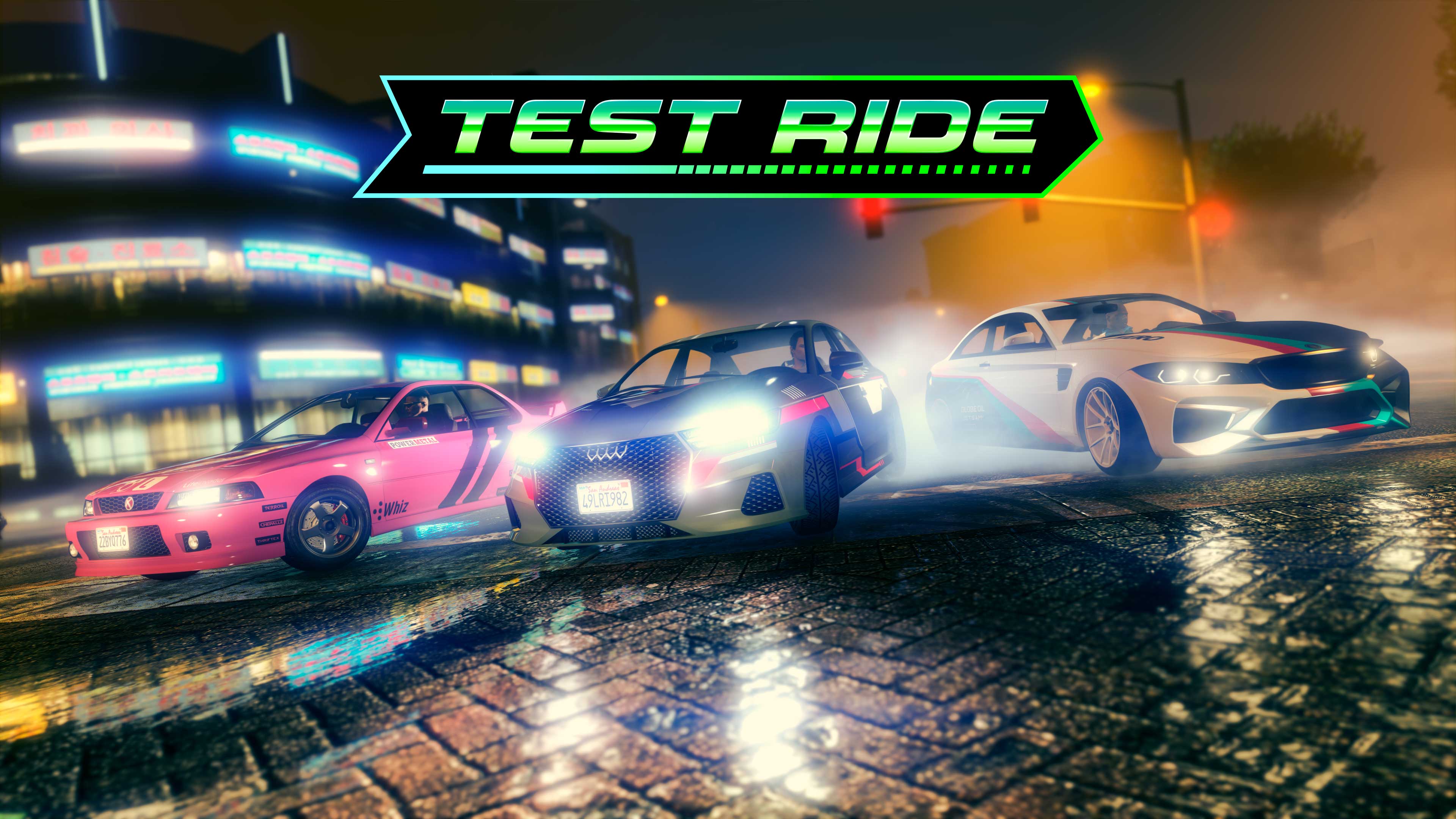 Three cars are parked outside the entrance to the Test Track. These are available for any player to test. They are in stock form mechanically, usually with a livery applied. These are changed every week with the new Event Week tunables update. However, unlike the Prize Ride, the Test Ride vehicles would not change if any player kept a pre-update session open and stayed inside the Meet, even for players freshly joining the session with an updated tunables set. For the first seven weeks after the update, one of the vehicles would be a car that had not yet been made available for purchase by players, meaning the Test Ride was a sneak preview of that particular vehicle which would be made available the following week.