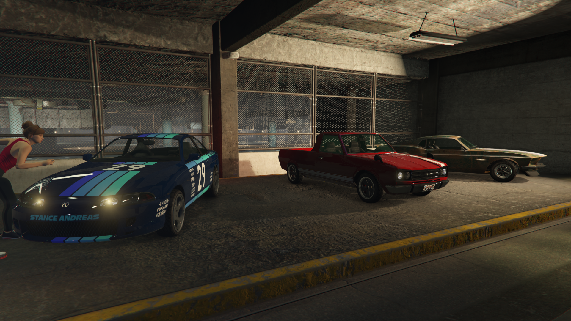 A four bay vehicle Mod Shop is available. Access for modifying any Personal Vehicles is from the Vehicle Menu while sitting in the vehicle. The shop is open to view by all players in the meet and they can watch the modifications being undertaken in real time. This is the only mod shop capable of applying the Low Grip Tires to the vehicles added in the Tuners update.