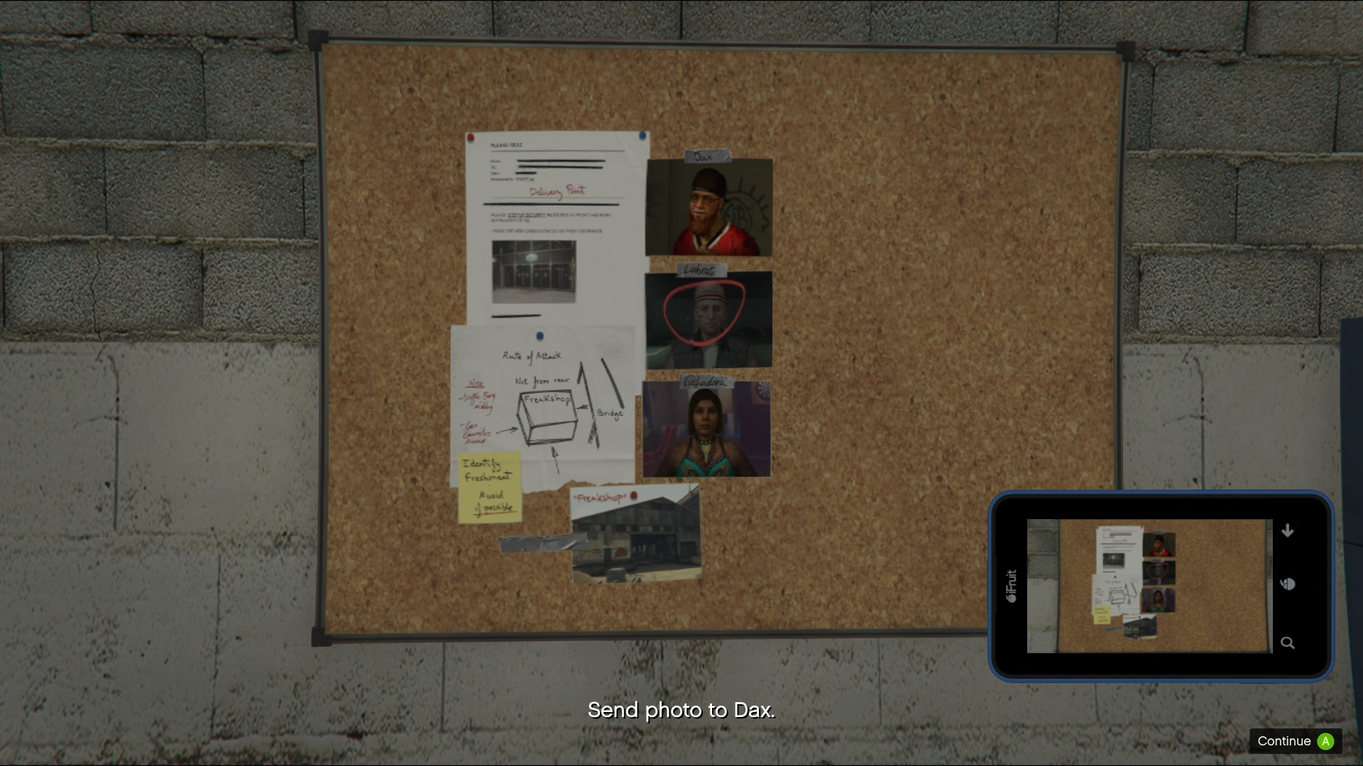 | 4 | A cork noticeboard with photos of Labrat (highlighted as the target), Dax, Luchadora, The Freakshop and a delivery point: FriedMind Pharmaceutical Corporation HQ. Also includes a note to identify and avoid engaging "Freshmeat" if possible. | |