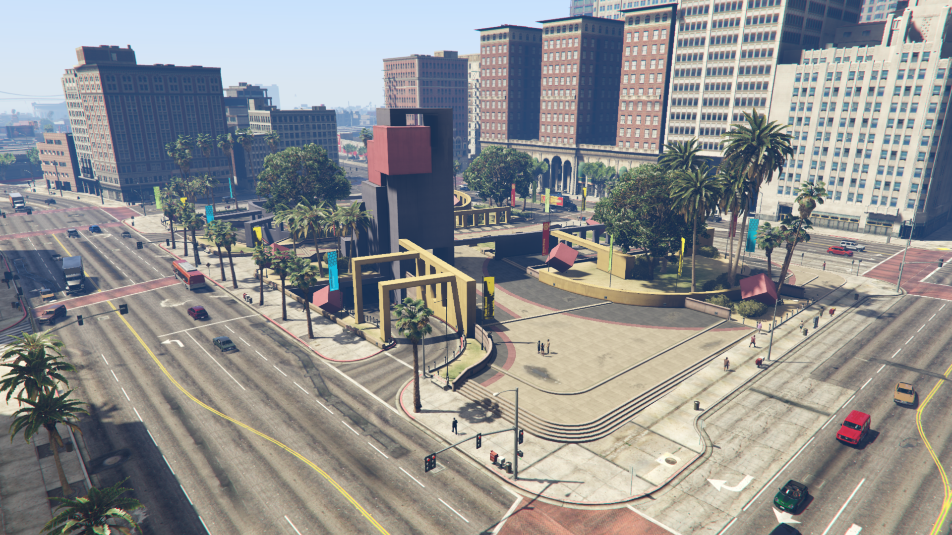 Legion Square is located in a commercial district, bordering Pillbox Hill to the west and Mission Row to the east. The Square itself is composed primarily of sculptures. Large red cubes are a prominent feature, along with other instances of public art. There are numerous banners around the park advertising exhibits sponsored by the Fleeca art fund.