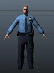 Unlike the hats worn by overweight police officers and the unused traffic police cap, which display a true-to-life NYPD hat device, the hats worn by fit police officers feature a modified version with the left side of the device being mirrored; however, the normal and specular texture layers for m_y_cop_p are based on the real-life design, suggesting that the diffuse texture was changed during development. Despite this, the original texture can still be found in the form of an unused prop for M_M_Alcoholic.