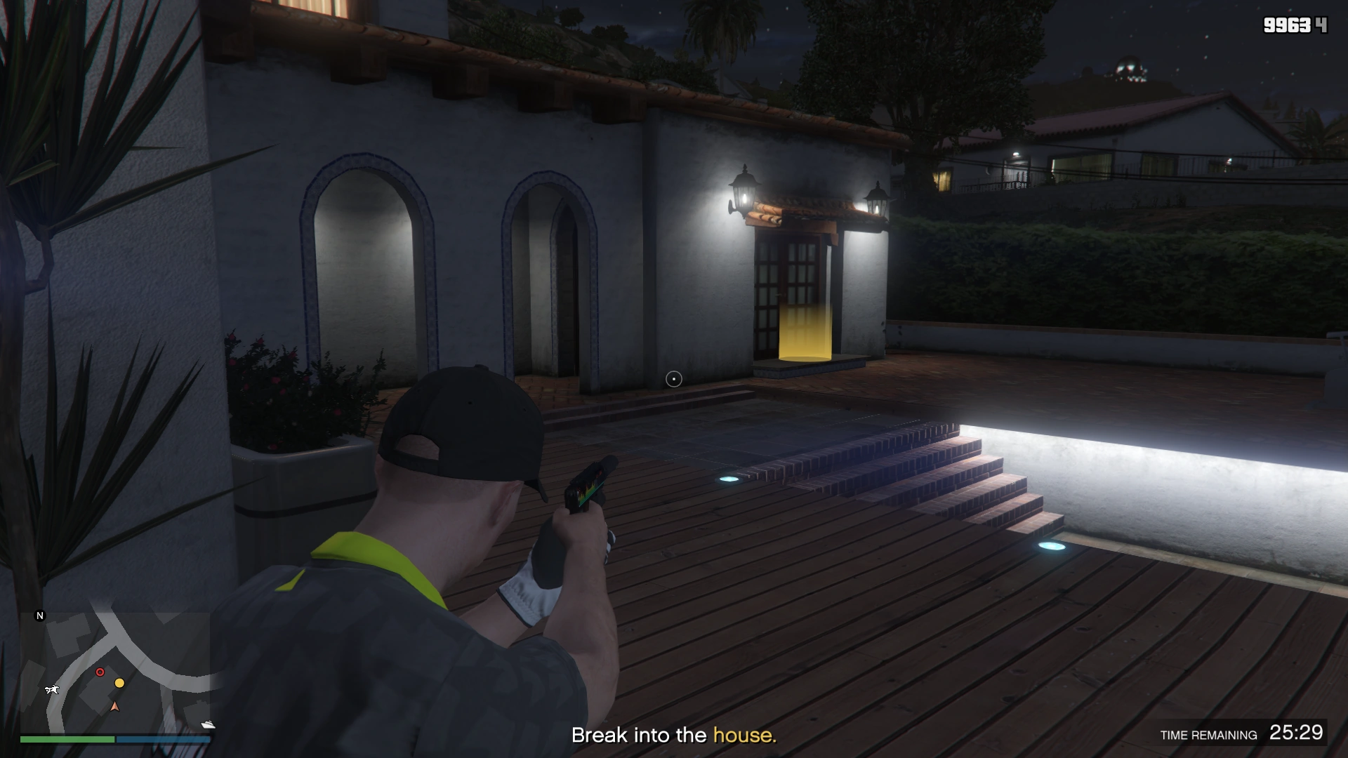 Upon arrival at the house, there is a Granger 3600LX and a Washington parked outside and armed IAA agents patrolling outside the house who can be dealt with by stealth or loud assault. If the player makes it to the entry corona of the house without alerting the exterior agents, the interior agents will not be on alert after they enter.