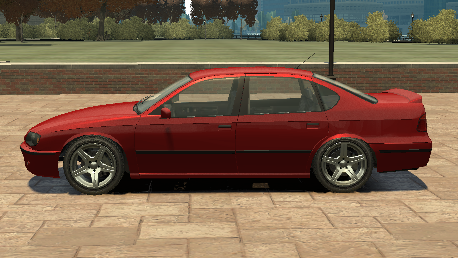 The sides of the car are relatively basic, featuring flared arches and rectangular skirting areas. Black/plastic strips can be seen running through the doors, which have the same height as the one on the front bumper, while thin accent lines are seen starting near the headlights and running towards the tail lights, passing between the black door handles and the waist lines. The greenhouse area makes use of black trim around the windows and inner separations, together with painted mirror shells on the front doors and rounded rear-quarter windows. A single aerial can be seen on the rear portion of the roof. The trunk lid mounts a small spoiler by default.