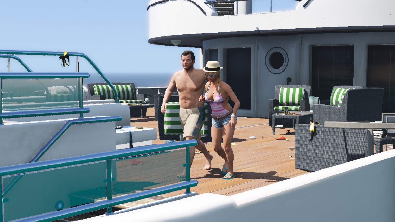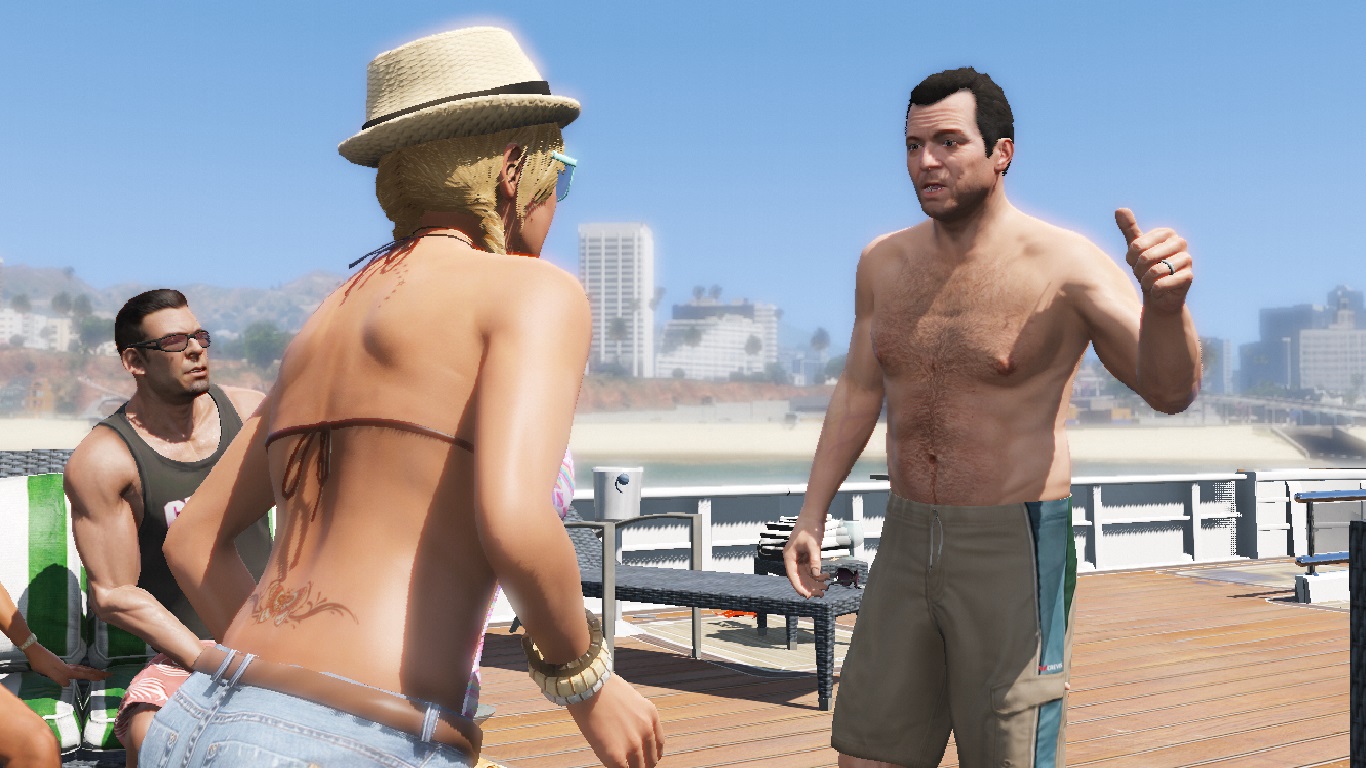 Later, Michael is watching a noir-style movie, but Jimmy's loud swearing through his headset while playing video games distracts Michael from enjoying it, so he decides to venture upstairs to chastise his son. After Jimmy insults and tells him to leave, Michael throws a chair at the television. This riles Jimmy up, furthering Michael's rage to the point where he eventually dares Jimmy to hit him. However, the heat quickly dies, and Michael apologizes, but tells Jimmy he's wasting his life by doing nothing productive. Michael convinces a reluctant and still angry Jimmy to drive to Vespucci Beach with him for some father and son time; however, even in the car, Jimmy still argues with and about Michael and his poor mental health, going as far as to blame his father for his own problems. At the beach, they have a short bicycle race and finish at the Del Perro Pier. Still mad at Michael for breaking his TV and bringing him outside, Jimmy decides to upset his father by pointing out a luxurious and large yacht in the distance and explaining how Tracey is on board, hanging out with porn producers and potentially having sex with them. Furious that Jimmy only agreed to hang out with him under ulterior motives and enraged at the thought of his daughter hanging around with strange, perverted men, Michael takes his shirt off and dives into the sea, swimming to the yacht. He eventually climbs aboard and very quickly begins to cause drama by throwing a portable speaker overboard and pushing a man off the side. He takes Tracey back ashore against her will on a Seashark, but not before two of the producers give chase after him, leading to a shootout. Michael ultimately escapes and finally returns to dry land. Upon reaching the beach, Tracey and Jimmy leave, the former being angry at Michael.