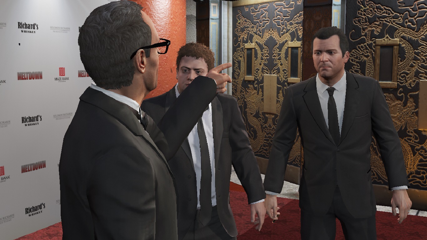 After the heist, Michael, along with Franklin and Trevor, are called upon by Haines and Norton. This time, they must rob an armored truck filled with funds that the IAA has received from drug sales. Unable to get any assistance from the corrupt agents, Michael decides they will approach the job with a "classic blitz play". Despite being faced with some mild LSPD and NOOSE resistance, the heist is executed smoothly. Michael then proceeds to deliver the funds to billionaire Devin Weston, who offers him a partnership with his idol, movie producer Solomon Richards. To get this partnership, however, he has to participate in one of several robberies that involve stealing several rare cars for Weston, alongside Trevor and Franklin. Michael eagerly agrees and fulfills his end of the bargain. Thrilled, he meet Richards who hires him as an assistant. Richards explains that while filming his latest movie, Meltdown, actor Milton McIlroy and his agent, Ancelotti Crime Family made man Rocco Pelosi, demanded that they renegotiate McIlroy's deal, which Richards refused, prompting the two to convince director Anton Beaudelaire to cease production until their demands are met. Michael confronts Rocco and assaults him before climbing into a helicopter containing McIlroy and Beaudelaire, where he then performs dangerous maneuvers with it to scare the two into submission. This gets Michael on Richards' good side, and he is promised the role of associate producer for the upcoming film if he continues his good work.