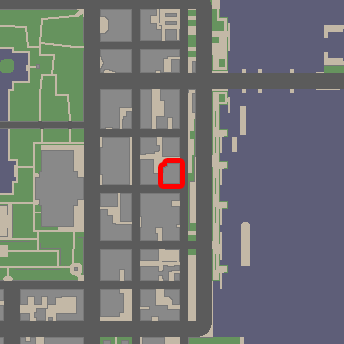 The apartment's large glass windows look out onto the Humboldt River towards Charge Island and Dukes. The East Borough Bridge is a key landmark visible from the apartment, but distant views of the Algonquin Bridge and Colony Island can also be discerned from the northern window. Like the other safehouses, there is a two-car parking space outside. Quartz East station at Albany Avenue and Quartz Street is also easily accessible from the safehouse, with one entrance directly visible to the north from the apartment's entrance.