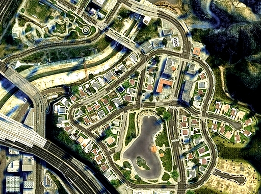 The layout of Mirror Park is quite simple. In the centre of the neighbourhood- is the park itself. The streets surrounding the park are all lined with small houses. In the eastern end of Mirror Park, there are two cul-de-sac roads; one fully developed with occupied homes, and a second still under development with homes in various states of completion. In the south-east end of the neighbourhood, there are a section of streets made up of various different businesses; this serves as an area of commerce. There is also a Limited LTD Service gas station that comes with a convenience store located at the northern edge of the neighbourhood. Also situated in the north is one of two main sources of the Los Santos Storm Drain. Maintenance workers can be seen operating the machinery of the canal.