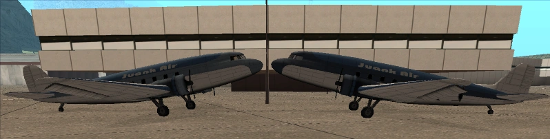 The Nevada is based on the vintage Douglas DC-3 passenger aircraft, and as such is one of the oldest aircraft in the Grand Theft Auto series. The Nevada is a large propeller passenger plane with two radial engines. Its access door is at the back and the plane always leans tilted nose up when parked. It possesses Juank Air decals, and can spawn in various color schemes.