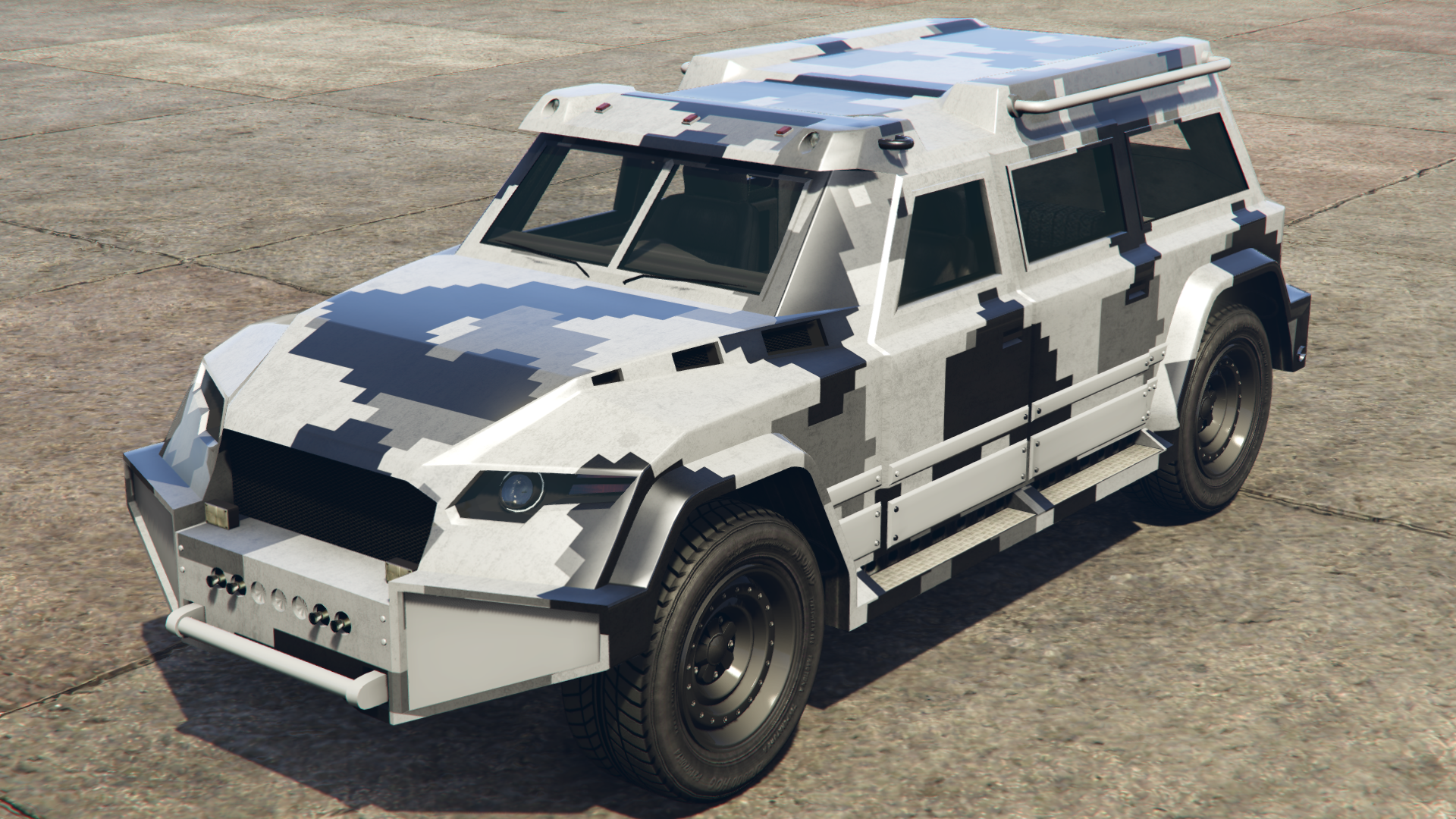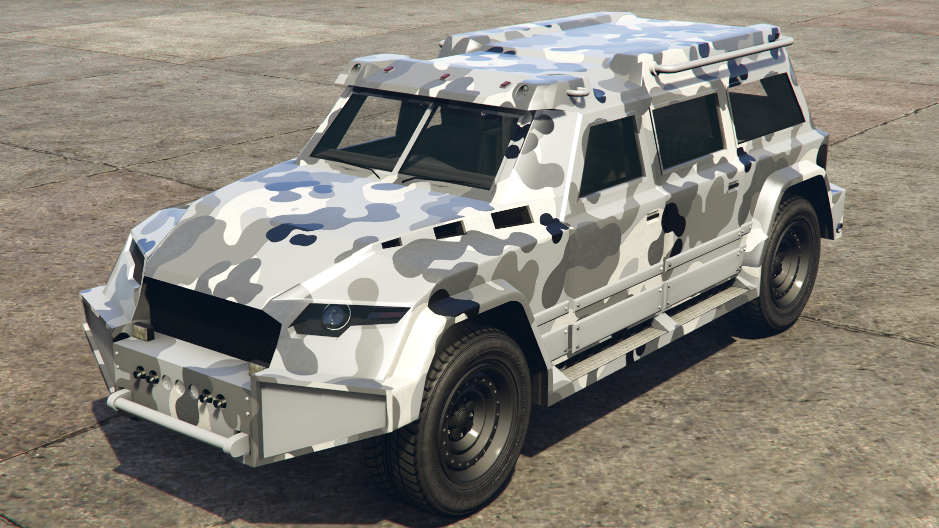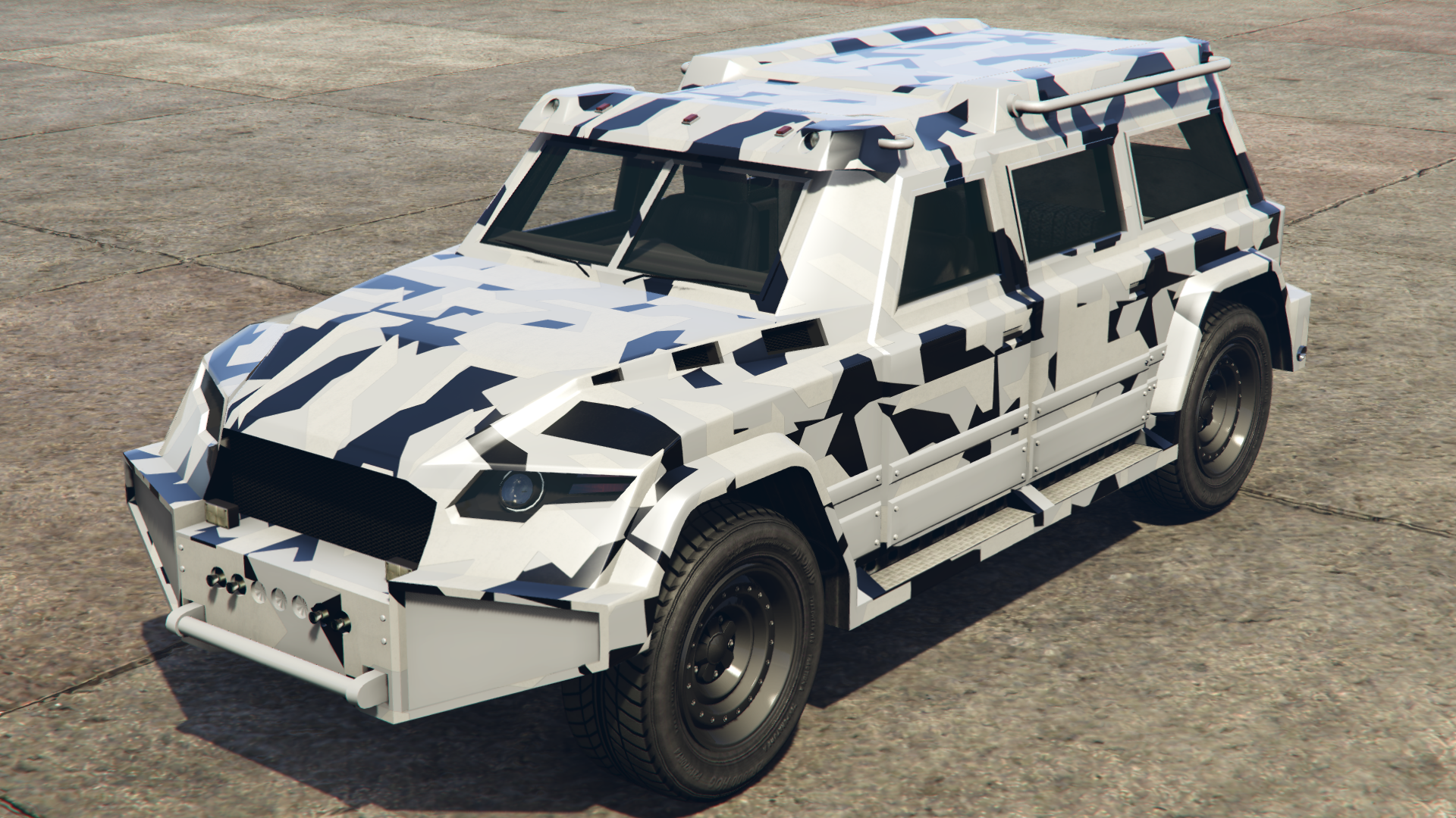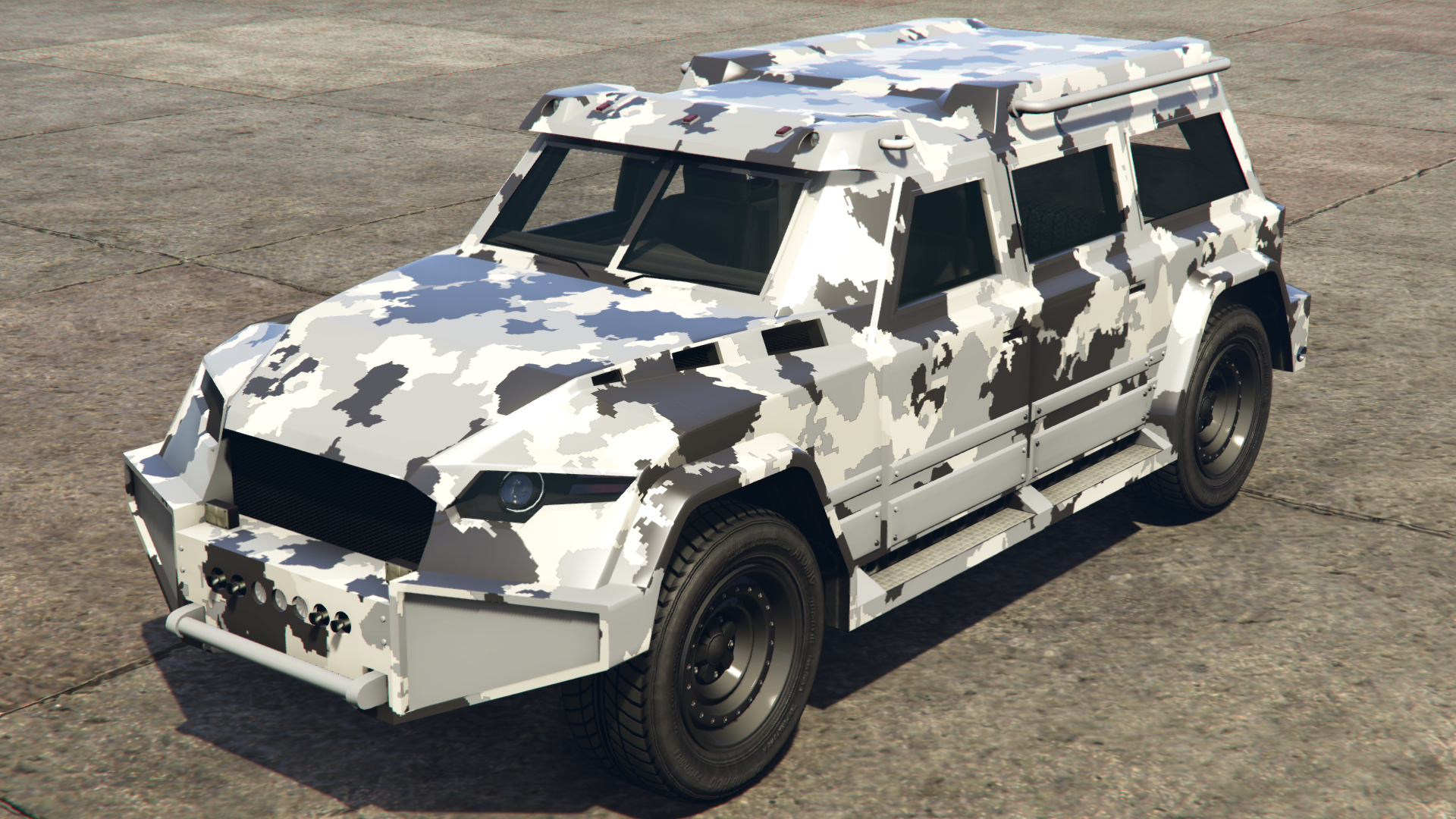 The vehicle is prominently painted in a primary color, with the outer portions and circular holes of the front bumper, the steel bars, the side armor panels and the side roof bars painted in a secondary color. The vehicle uses large industrial wheels with high-profile tires, sharing the same steel rim design with the ones from the Insurgent and its armed variant. These rims can also support a dedicated color (although only naturally-generated examples may have one).