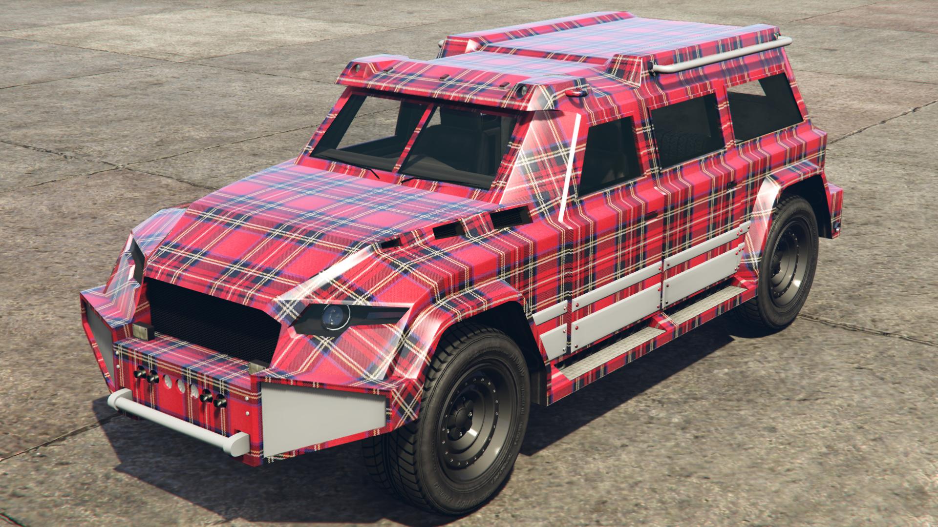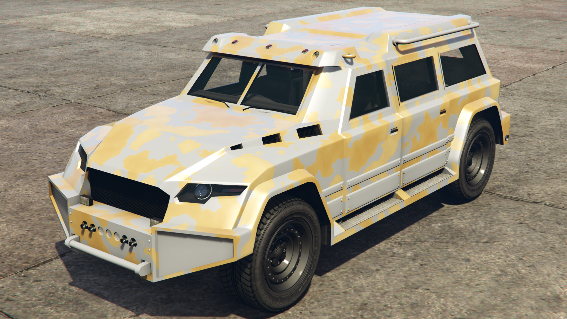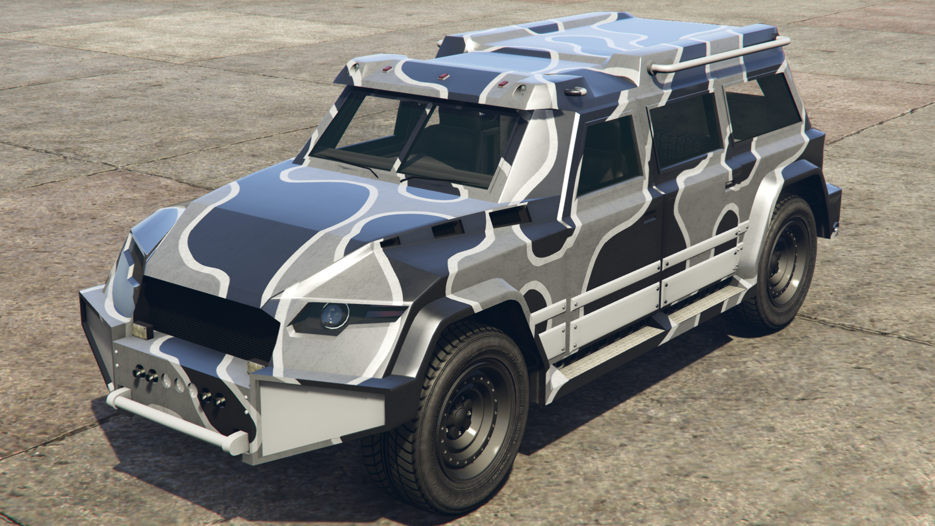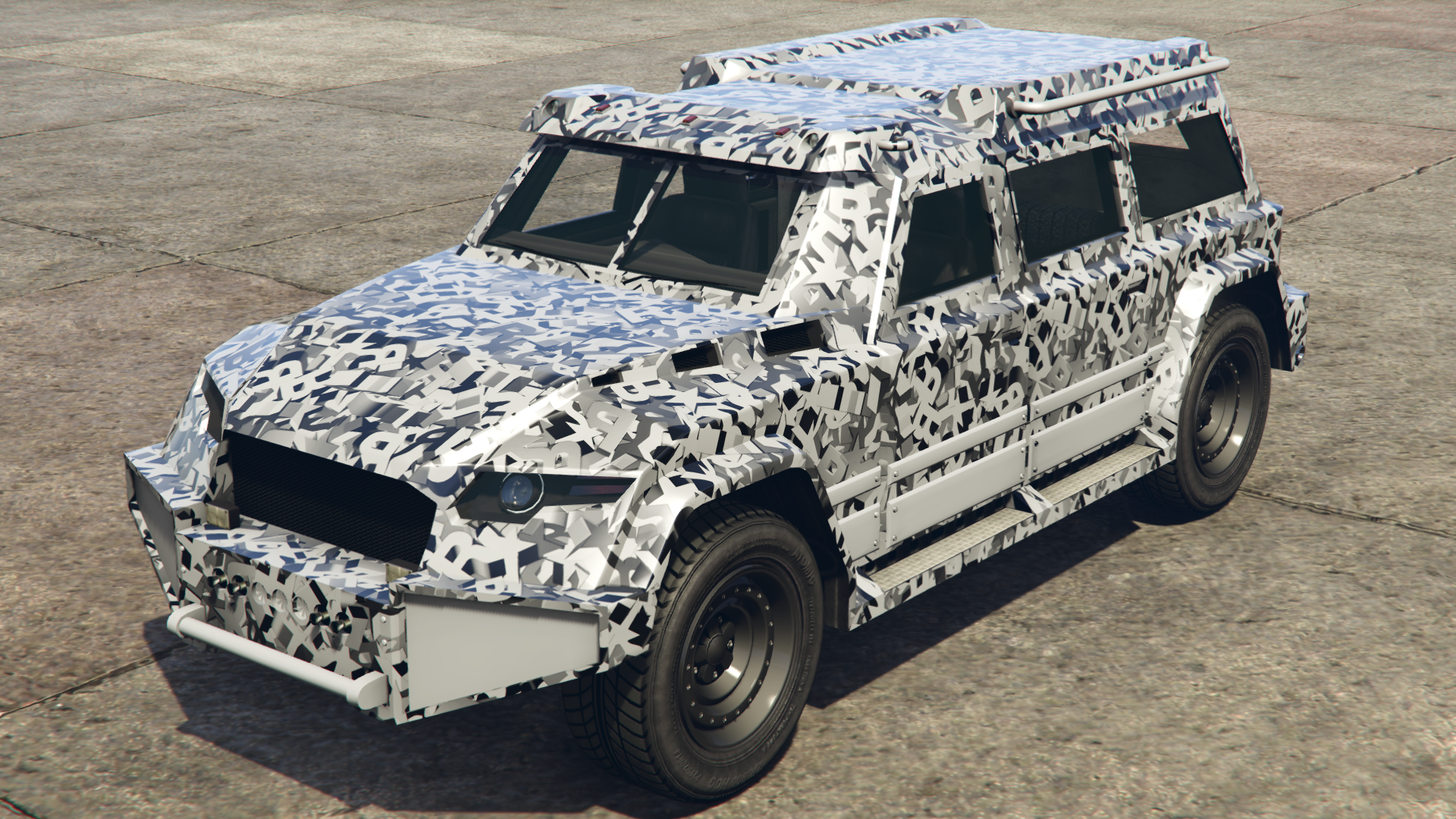 The vehicle is prominently painted in a primary color, with the outer portions and circular holes of the front bumper, the steel bars, the side armor panels and the side roof bars painted in a secondary color. The vehicle uses large industrial wheels with high-profile tires, sharing the same steel rim design with the ones from the Insurgent and its armed variant. These rims can also support a dedicated color (although only naturally-generated examples may have one).