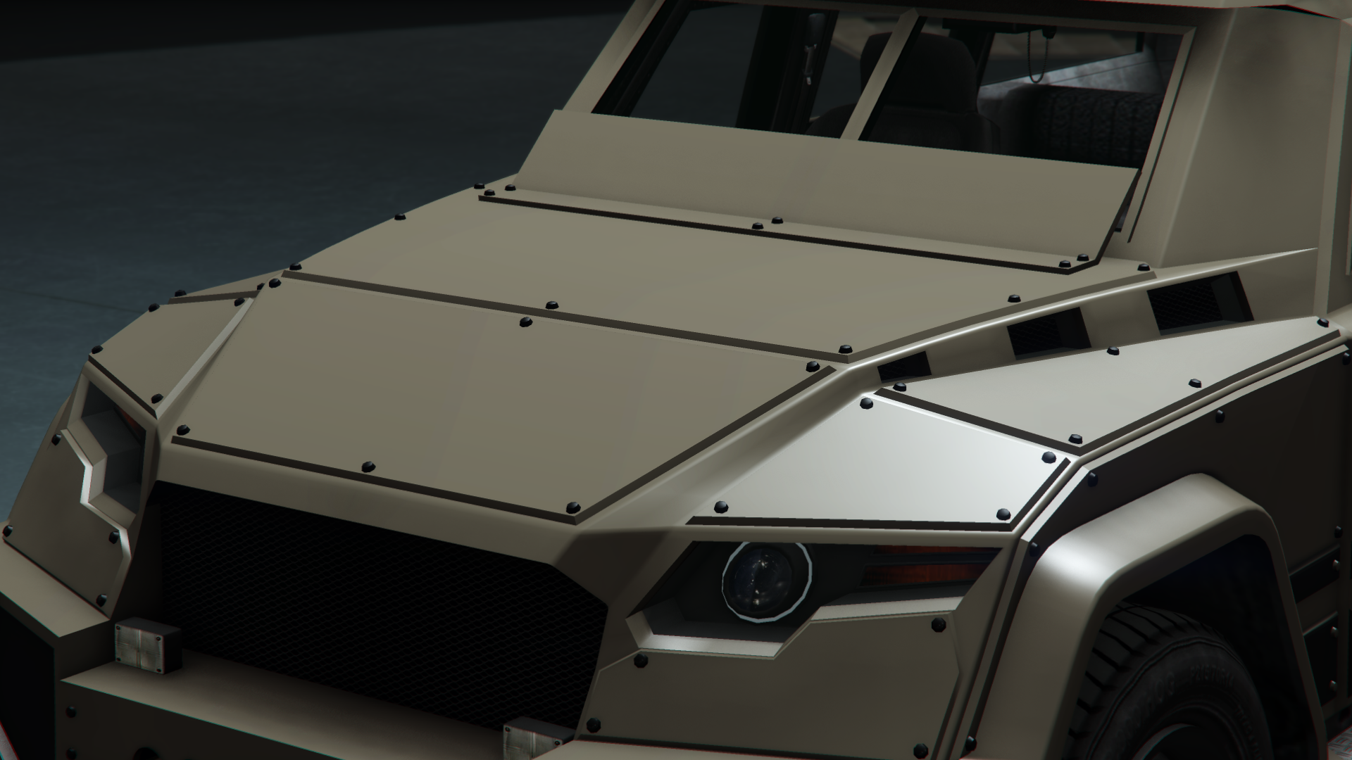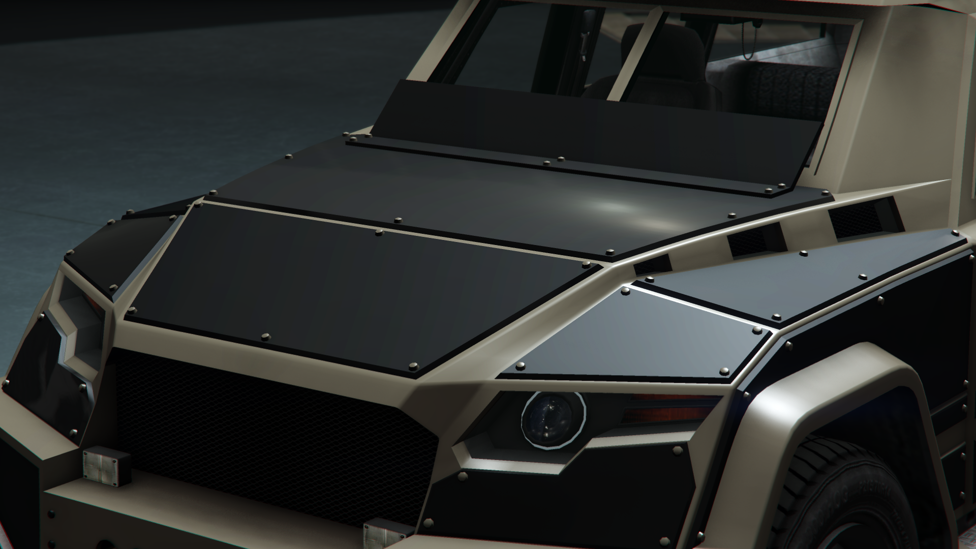 Like the Insurgent and its variants, the hood is completely sealed, meaning there is no way to reveal its engine (In fact, it lacks an engine model). The engine sound is similar to that of the Schafter V12, which sounds higher-revving and louder. When idle, the engine sound is the same one used on the Lynx.