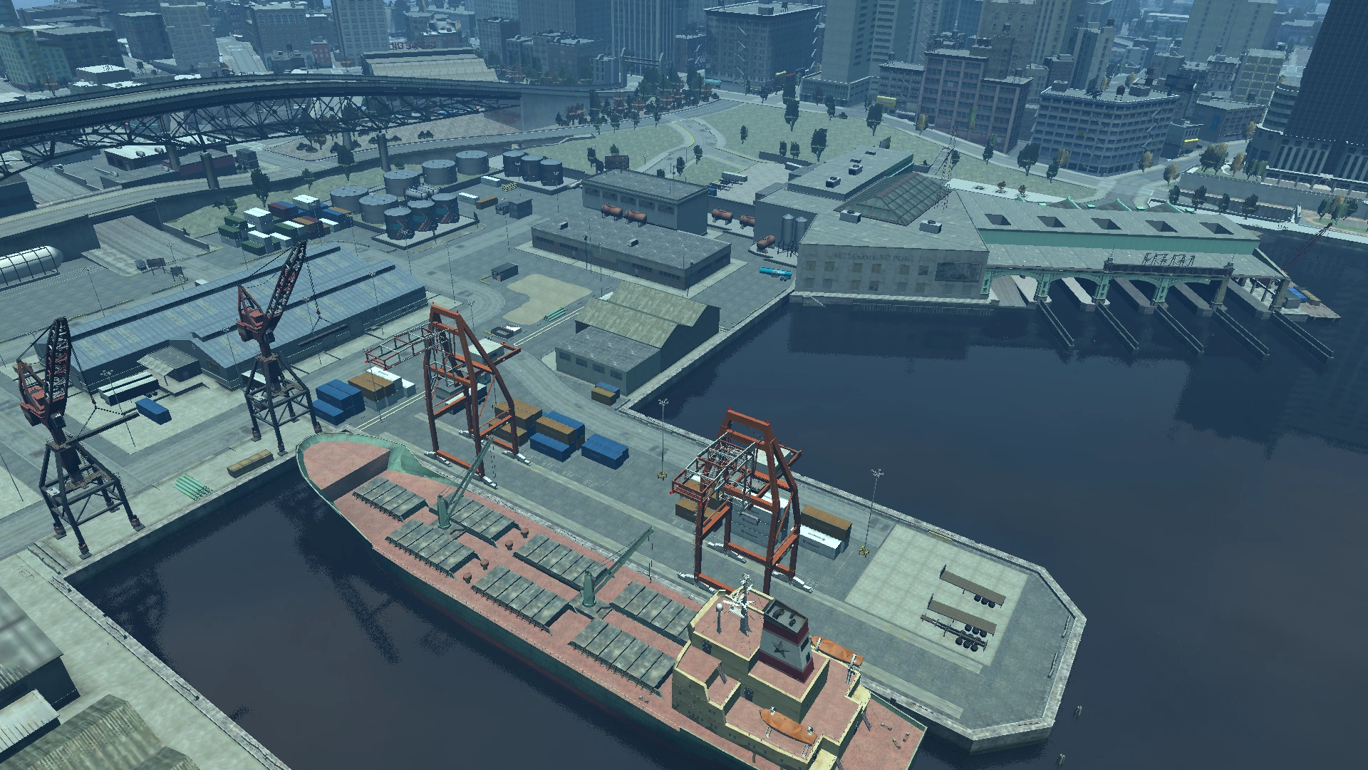 Normandy, along with Port Tudor, serves as Alderney's harbor/seaport city. Normandy contains some industrial buildings for companies such as Post OP, Alpha Mail, Pharte Gas, K.C. Spares and The Mount Distilling Co. & Tequilya brand. Normandy also contains a dock with a ship called the Wet Dream, and a few gas tanks and storage containers that can be seen all around Normandy.