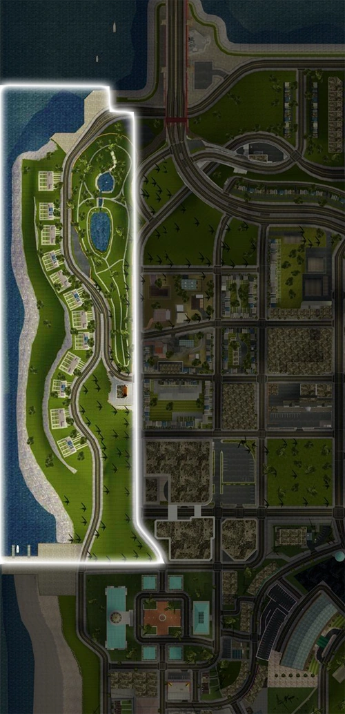 Palisades is a high-class residental district in San Fierro. It is an extremely affluent neighborhood situated on the western shore of the city. To the east is Juniper Hill; to the north is Paradiso; to the south is Santa Flora. The one business in the district is the Tuff Nut Donuts building at the very southeast corner of the neighborhood, with a garishly large plaster doughnut perched on its roof.