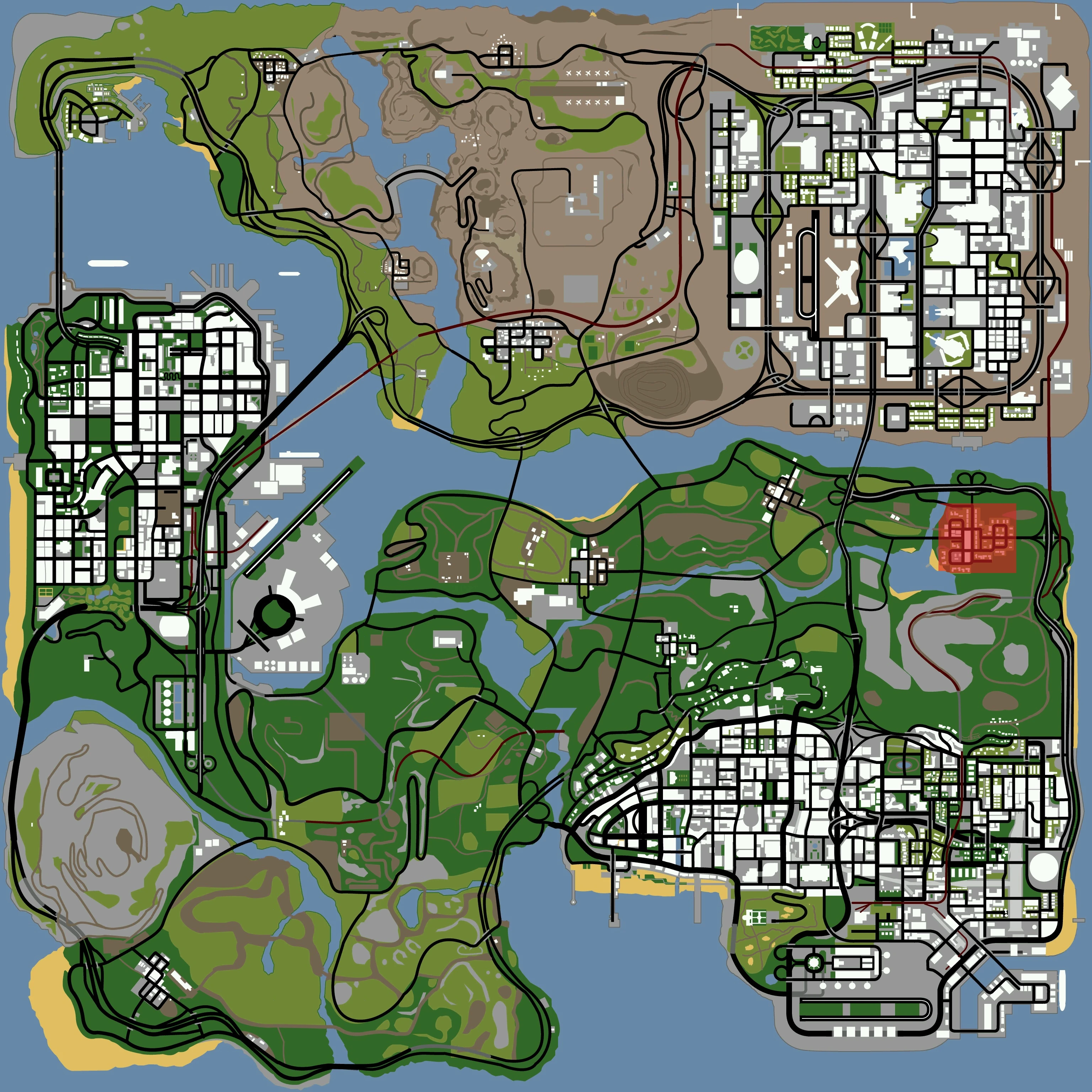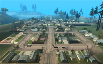 The town is named after the creek that flows past it. Palomino Creek's location halfway between Los Santos and Las Venturas makes it a frequent stop for motorists travelling to either city. The fact that it is served by several major roads have no doubt led to its growth and success. It is based on Bakersfield, due to the farms and fields around the town and the river passing through it bearing resemblance to the Kern River. It can also possibly be based on Big Bear City, due to its location being northeast of Los Santos; similarly to Big Bear's location being northeast of Los Angeles.
