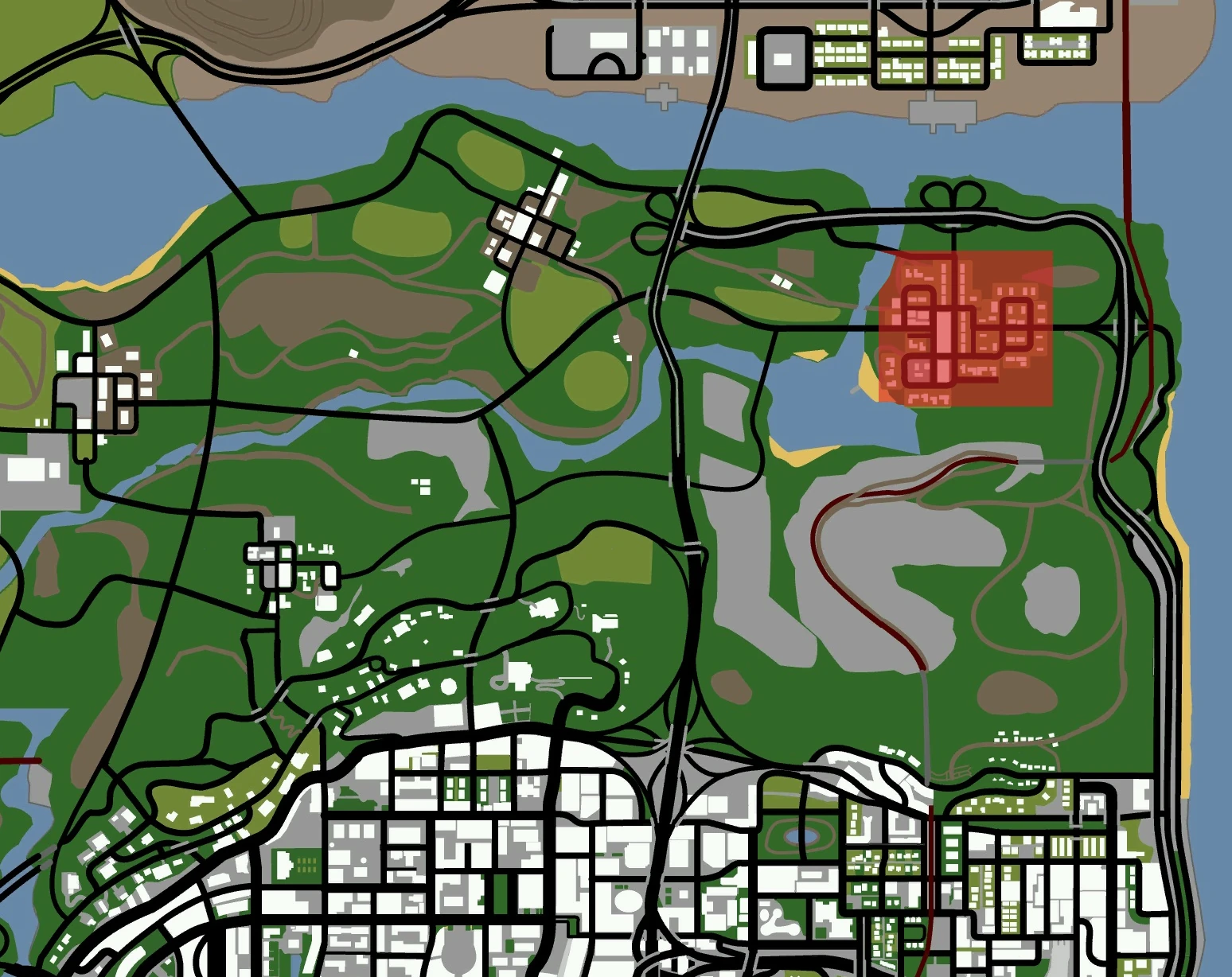 Palomino Creek is located in the northeastern part of Red County, San Andreas. The population size of this town is estimated at 6,836. It is home to the Palomino Creek Bank (which has experienced numerous robberies), a safehouse that can be purchased for $35,000, and Hanky Panky Point, a popular destination for amorous teenage couples and voyeuristic onlookers.
