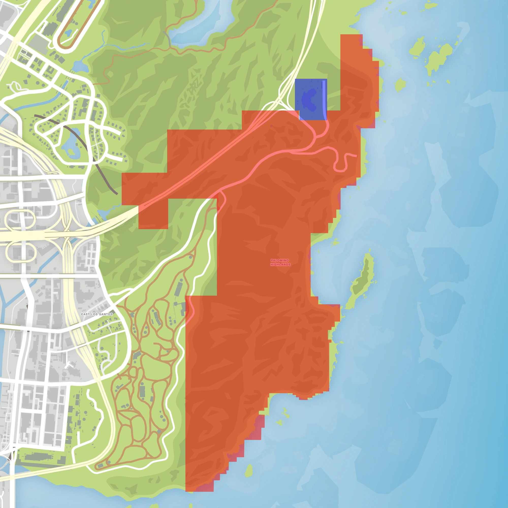 — GTA V ManualThe Palomino Highlands are a hilly, undeveloped region in Grand Theft Auto V and Grand Theft Auto Online located in southeast Los Santos County. It is bordered by the Pacific Ocean to the east, and by the Palomino Freeway and the city of Los Santos to the west.